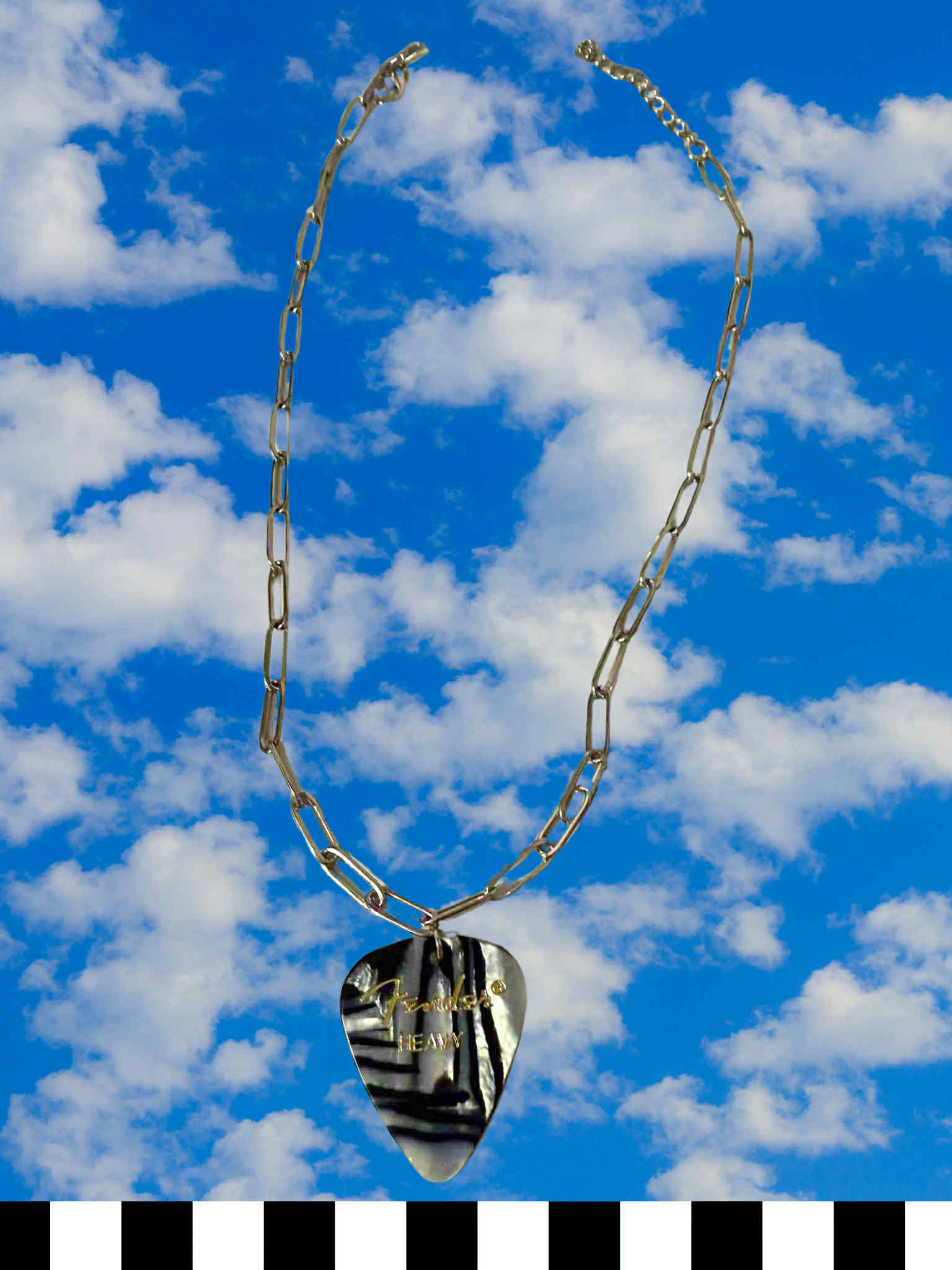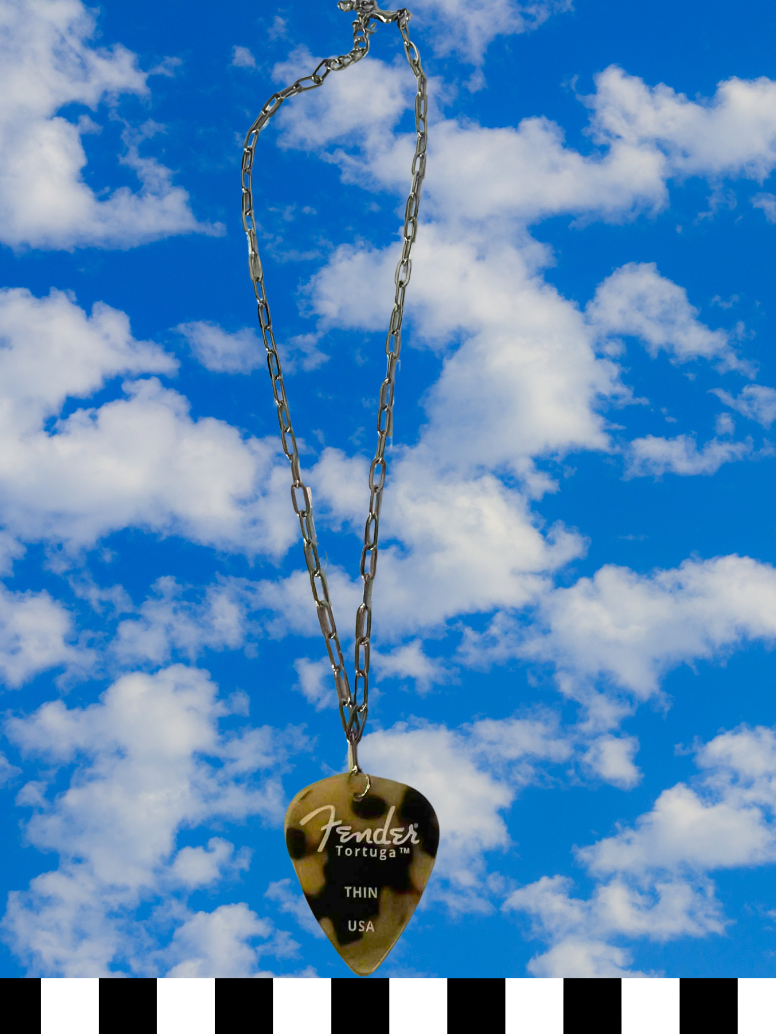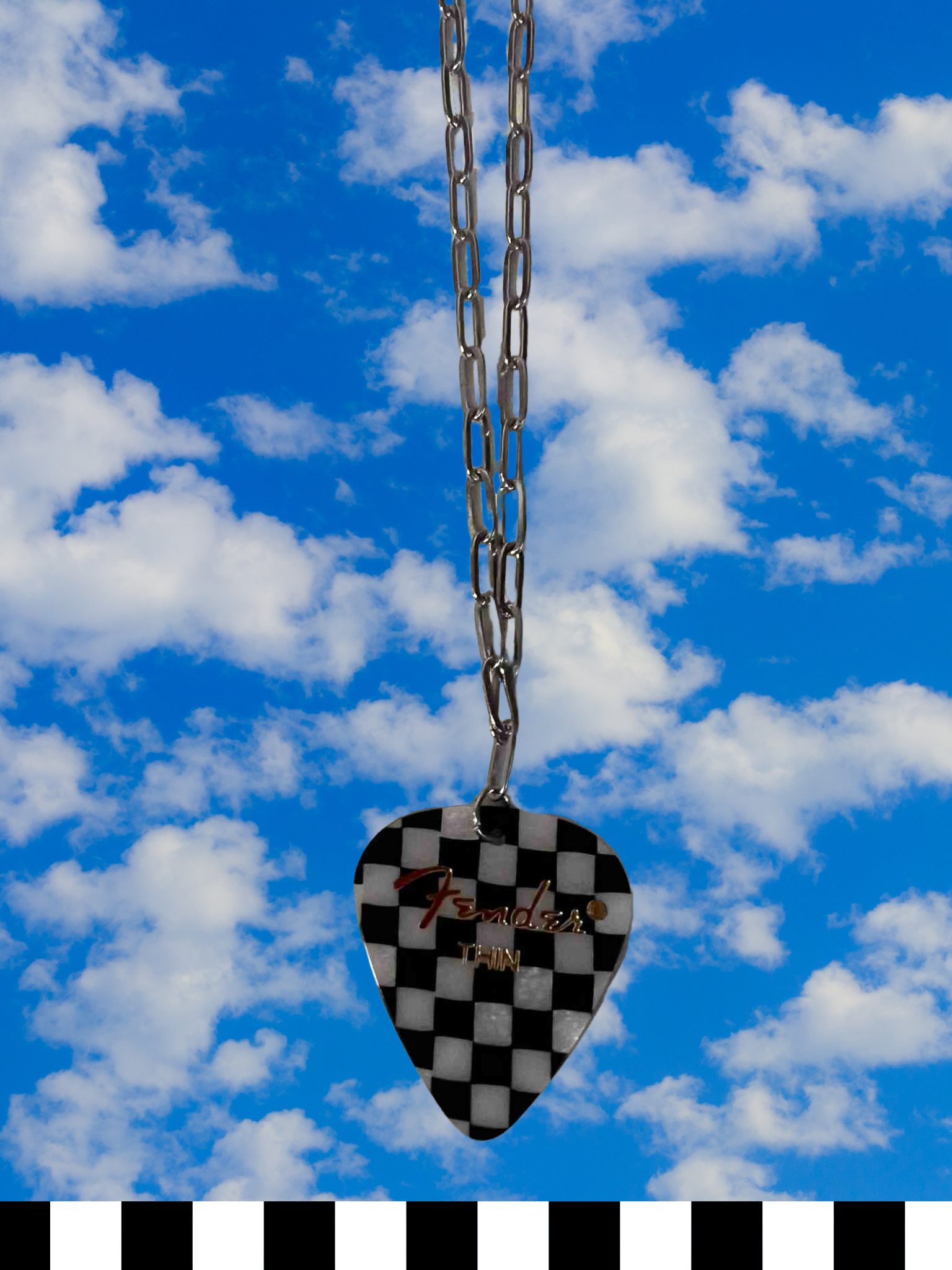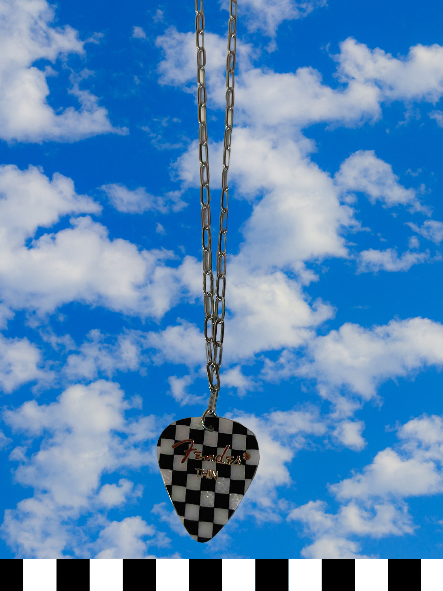 Acoustics by morning charm necklace, silver stainless steel paperclip chain or silver stainless steel O-chain, 14 inches in length, tail chain added for extra comfort fit, charms included in this statement necklace are a fender guitar pick charm, can either come in checkered, tortoise shell, zebra or rainbow. Show out your everyday accessories with this unapologetic statement piece. Sure to bring a cool, bold, and groovy vibe to your everyday clothing wear!Ā