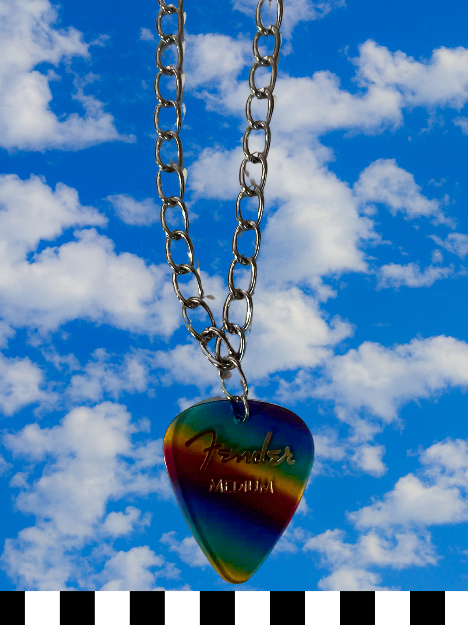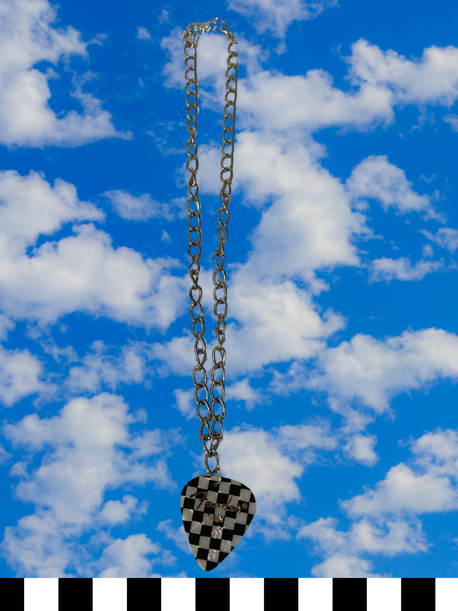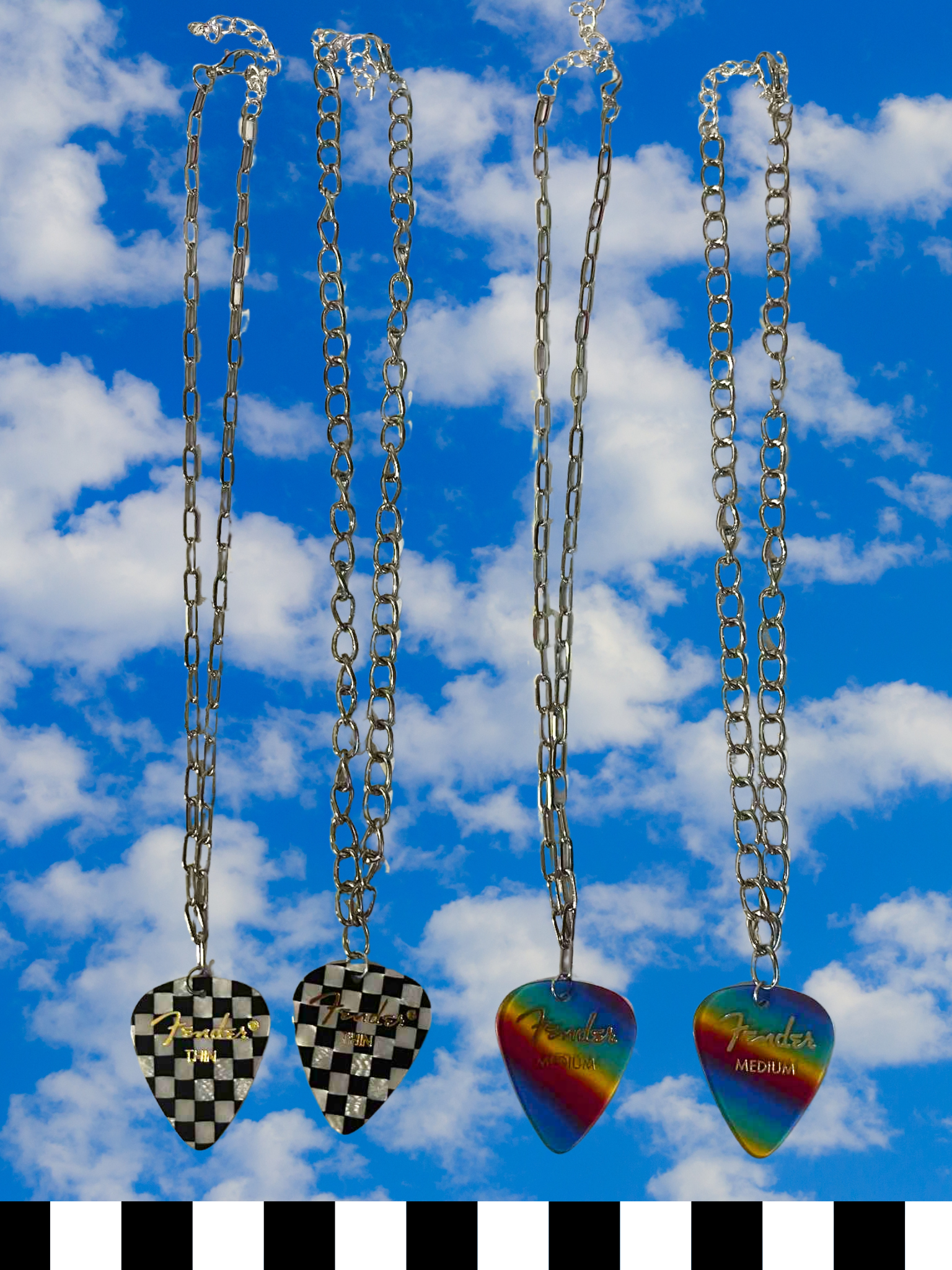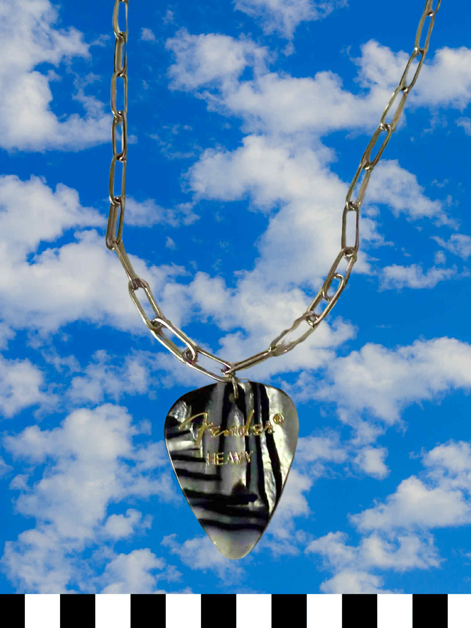 Acoustics by morning charm necklace, silver stainless steel paperclip chain or silver stainless steel O-chain, 14 inches in length, tail chain added for extra comfort fit, charms included in this statement necklace are a fender guitar pick charm, can either come in checkered, tortoise shell, zebra or rainbow. Show out your everyday accessories with this unapologetic statement piece. Sure to bring a cool, bold, and groovy vibe to your everyday clothing wear!Ā