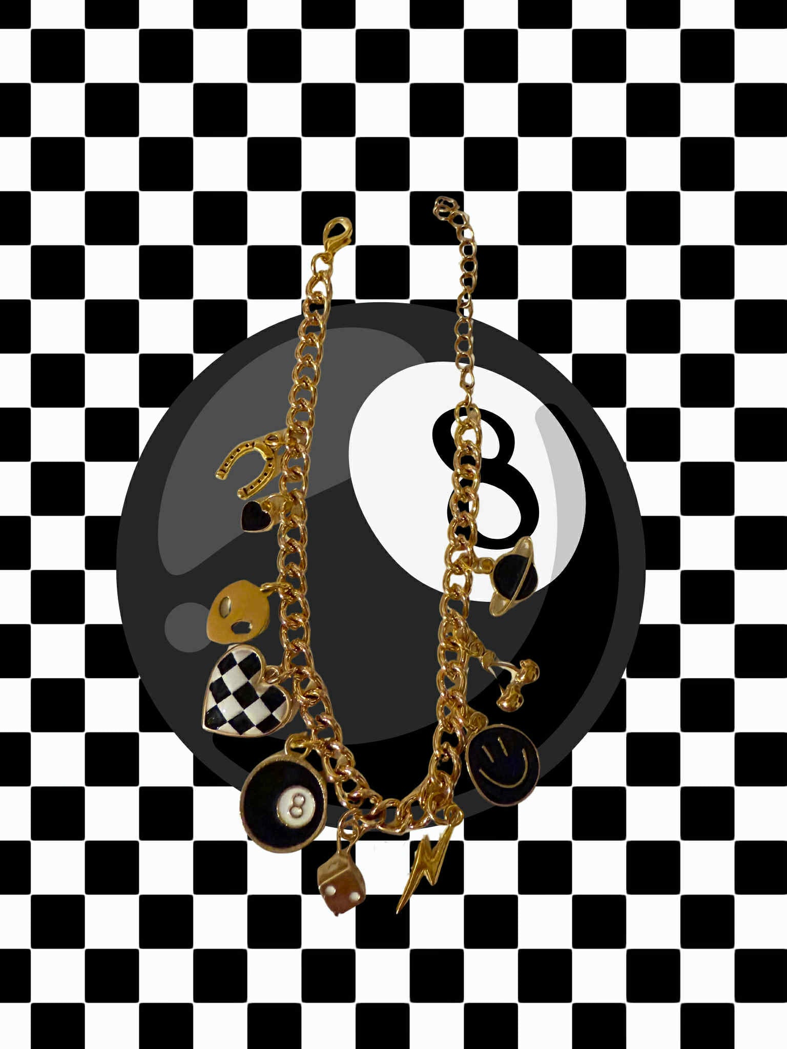 Astro Rodeo charm bracelet, gold stainless steel o-chain, 7.5 inches in length, tail chain added for extra comfort fit, charms included in this statement bracelet are a horseshoe, heart, alien, checkered heart, eightball, dice, lightning bolt, smiley face, cherries and a planet charm. Show out your everyday accessories with this unapologetic statement piece. Sure to bring a cool, bold, and groovy vibe to your everyday clothing wear!Ā