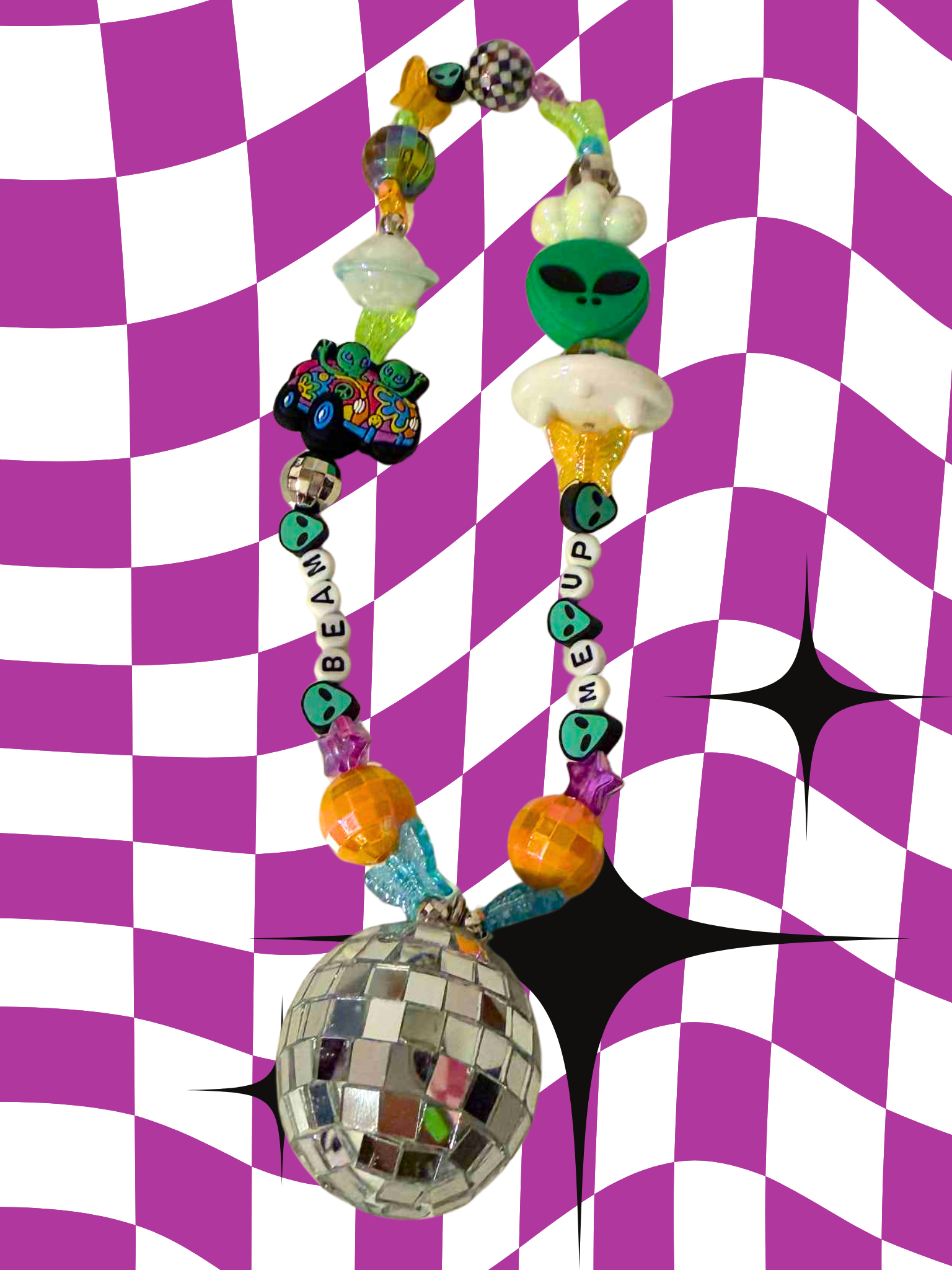 Beam me up rearview mirror charm, paired with stars, disco balls, clouds, checkered beads, aliens, spaceships, Saturn beads and butterflies! Sparkle up your car with this whimsical, out of this world rearview mirror charm! This cute and trendy accessory is bound to add a fun touch to your car.
