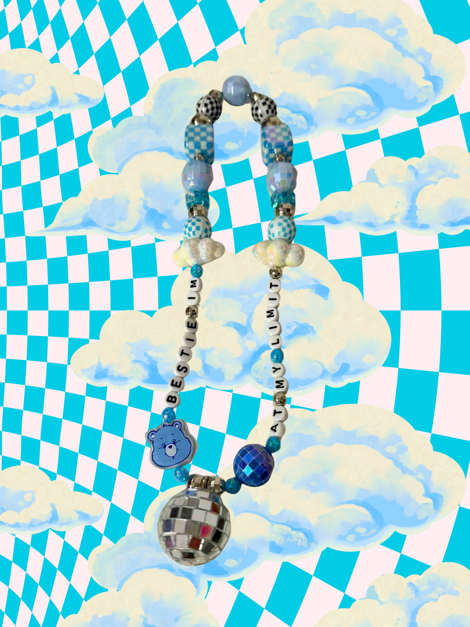 Bestie I'm at my limit rearview mirror charm, paired with clouds, disco balls, checkered beads, gummy bears and grumpy bear from the carebears! Sparkle up your car with this whimsical, out of this world rearview mirror charm! This cute and trendy accessory is bound to add a fun touch to your car.