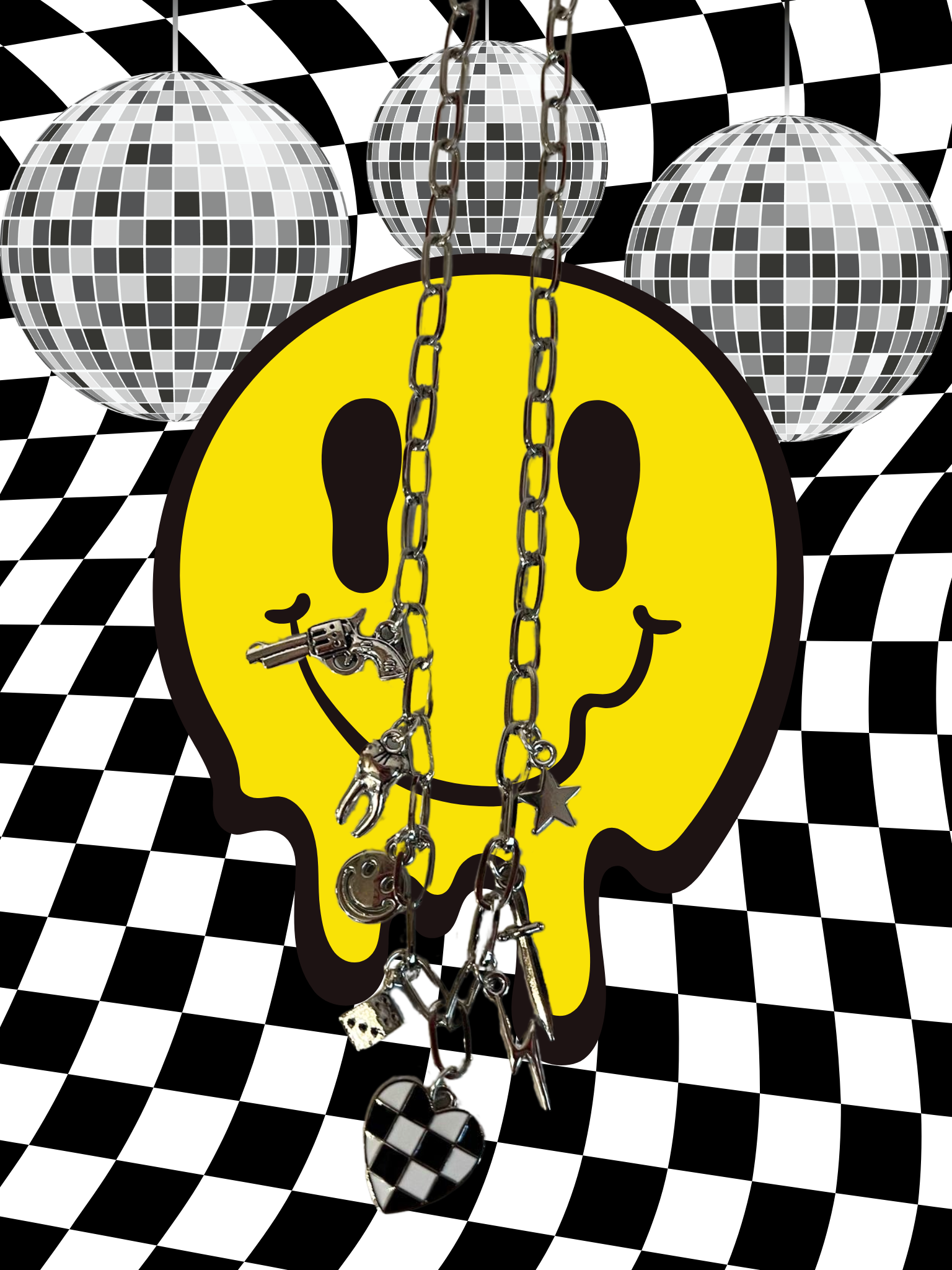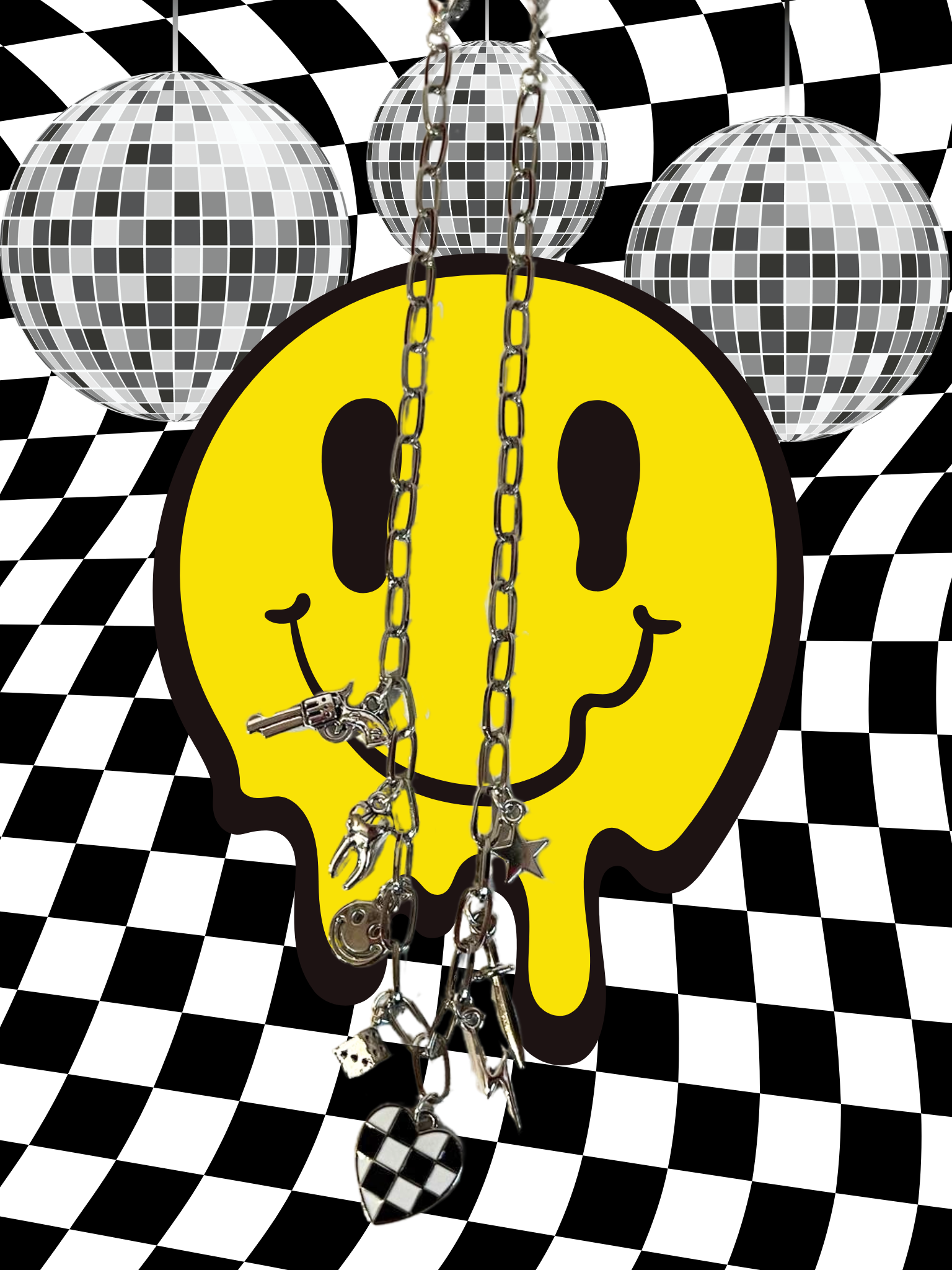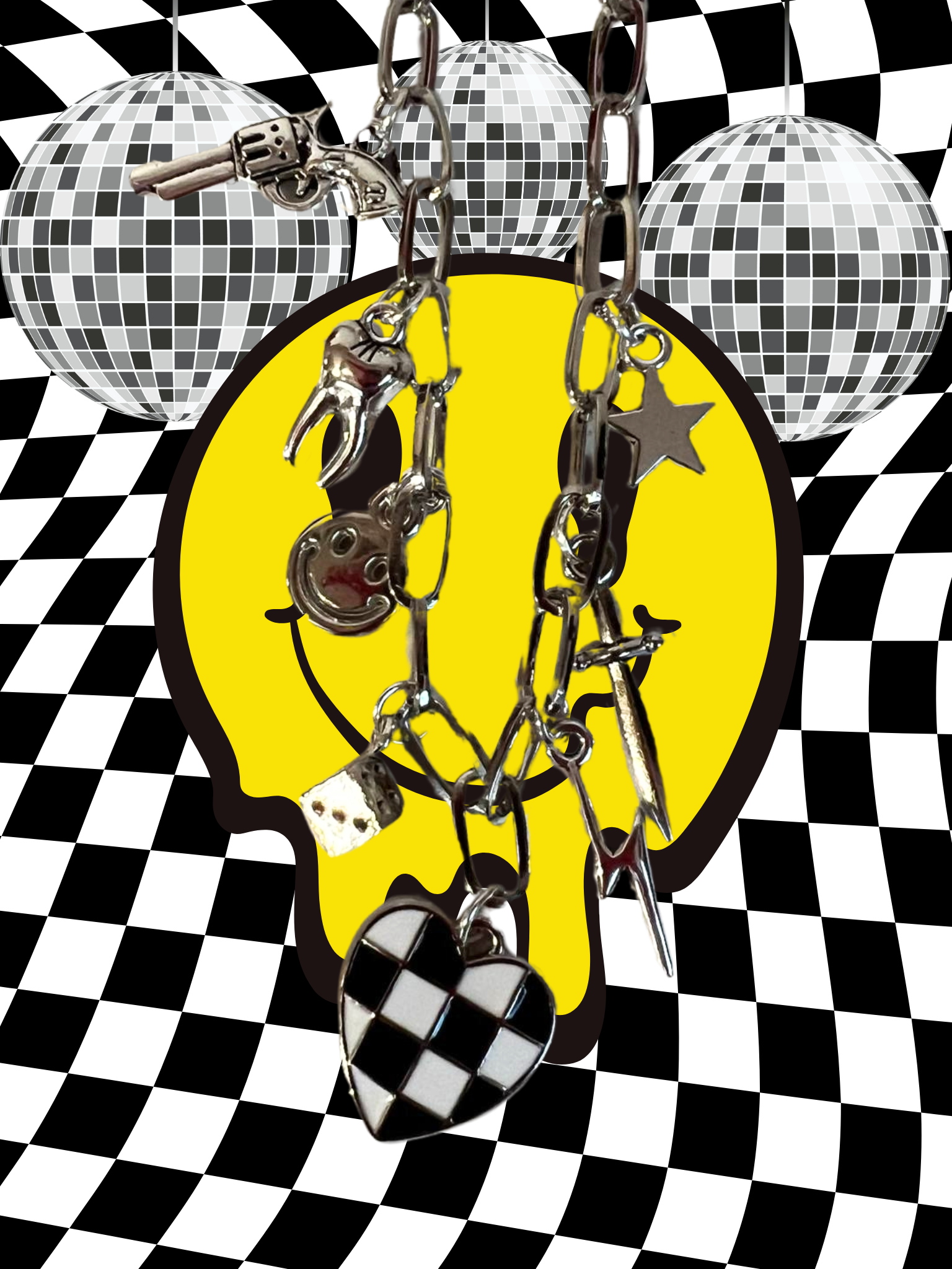 Boogie nights charm necklace, silver stainless steel paperclip chain, 13 inches in length, tail chain added for extra comfort fit, charms included in this statement necklace are a pistol, tooth, smiley face, dice, checkered heart, lightning bolt, dagger and star charm. Show out your everyday accessories with this unapologetic statement piece. Sure to bring a cool, bold, and groovy vibe to your everyday clothing wear!Ā