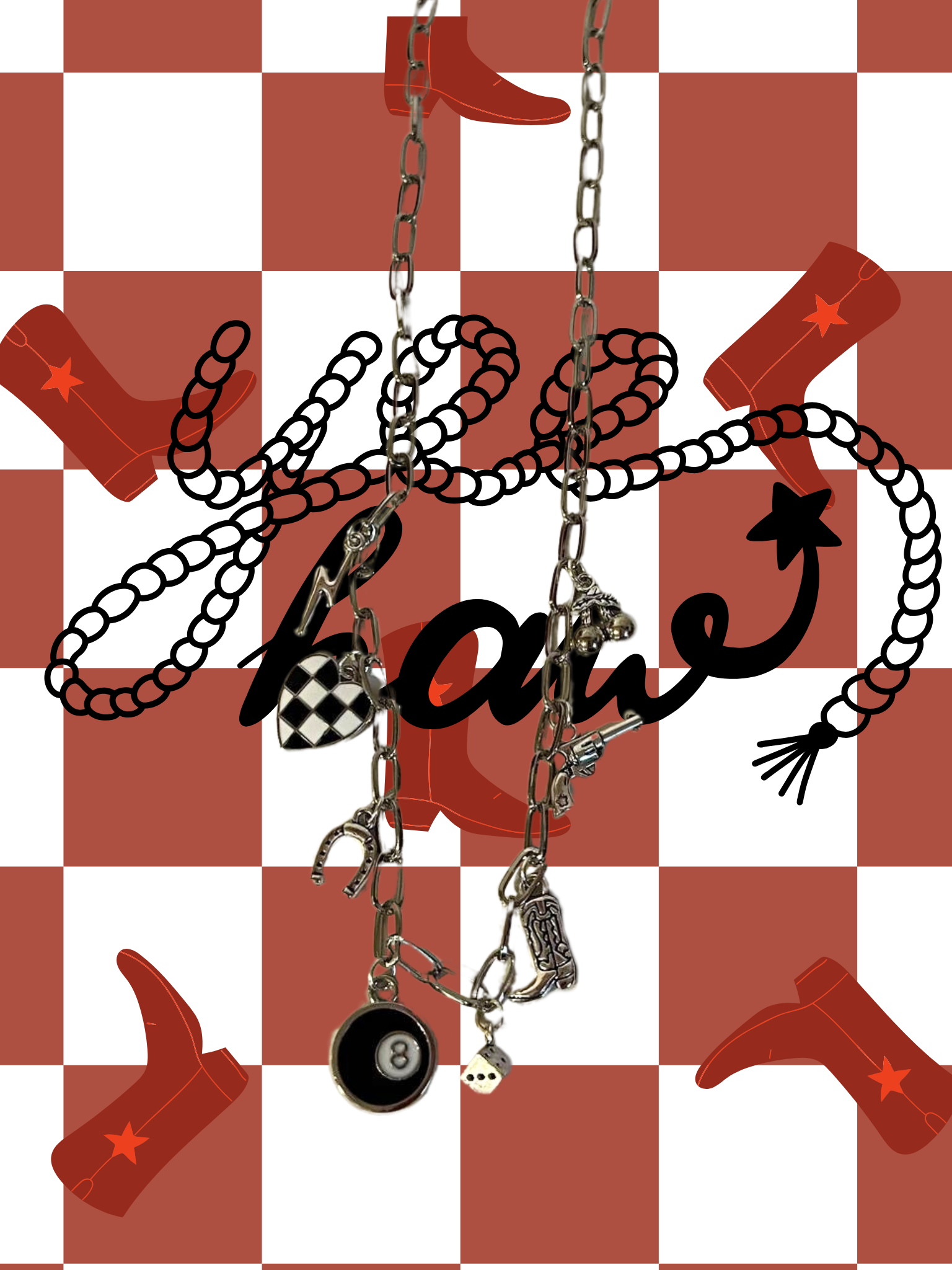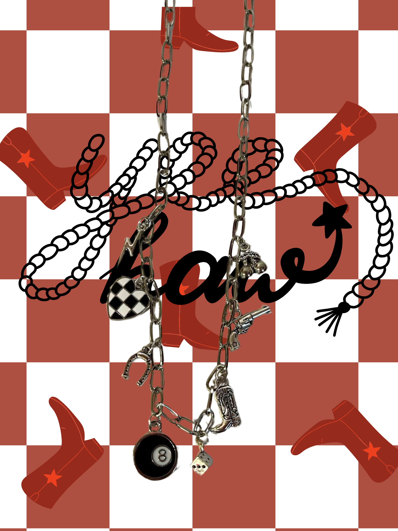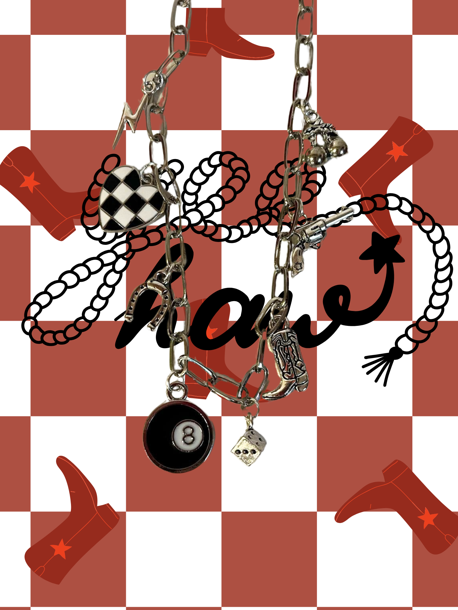 Bull ridin' nights charm necklace, silver stainless steel paperclip chain, 16 inches in length, tail chain added for extra comfort fit, charms included in this statement necklace are a lightning bolt, checkered heart, horseshoe, eightball, dice, cowgirl boot, pistol and cherries charm. Show out your everyday accessories with this unapologetic statement piece. Sure to bring a cool, bold, and groovy vibe to your everyday clothing wear!Ā