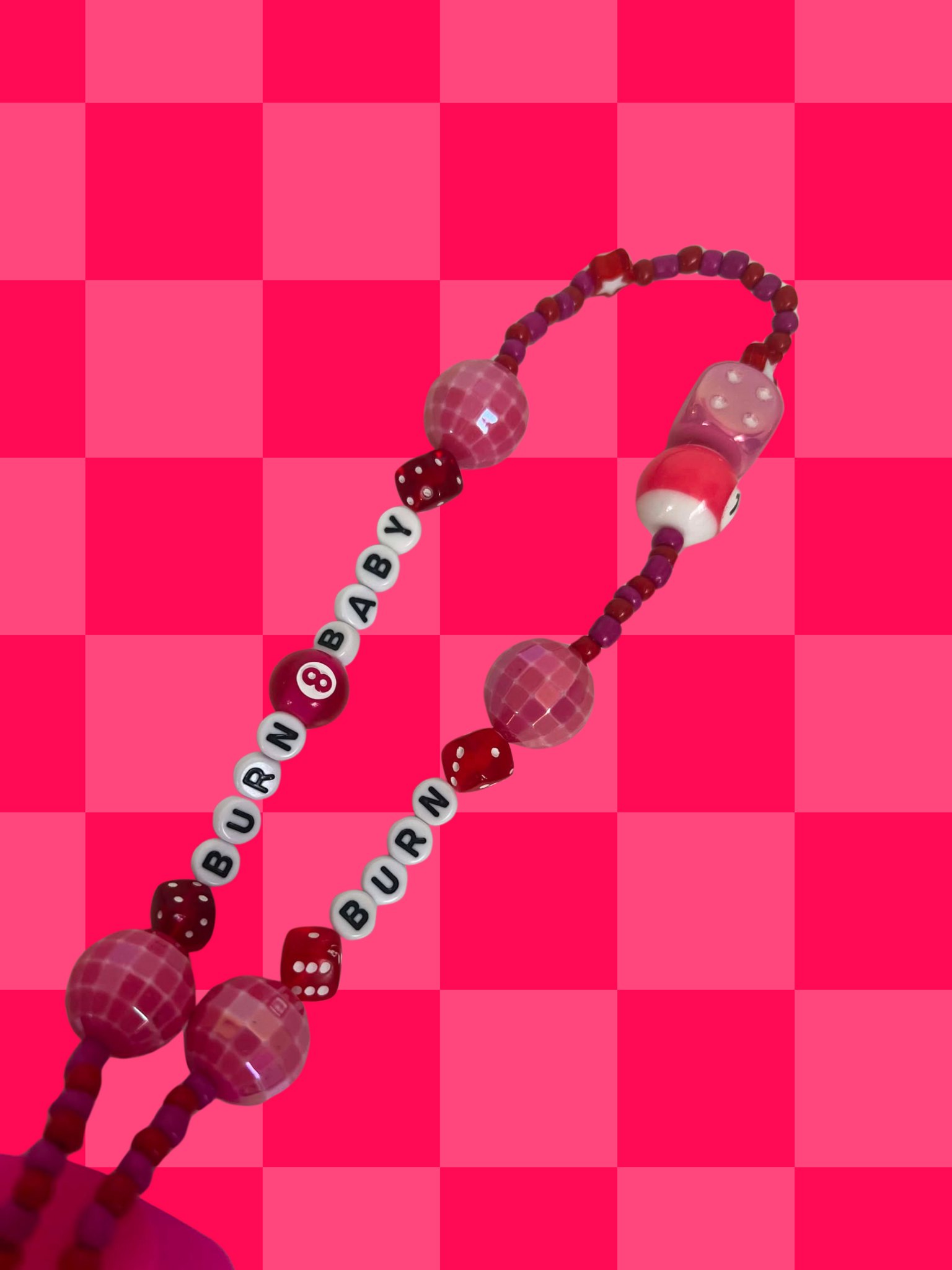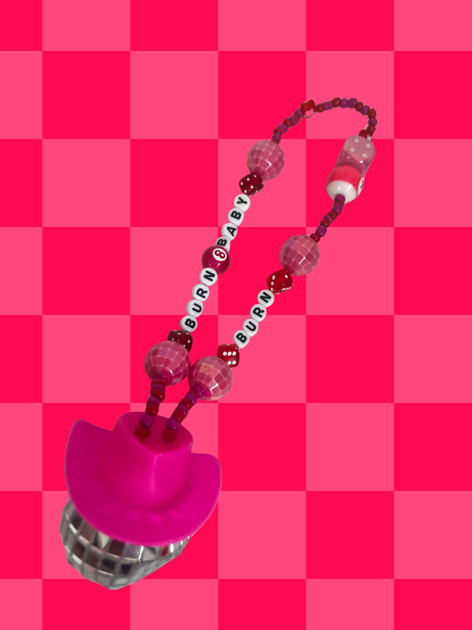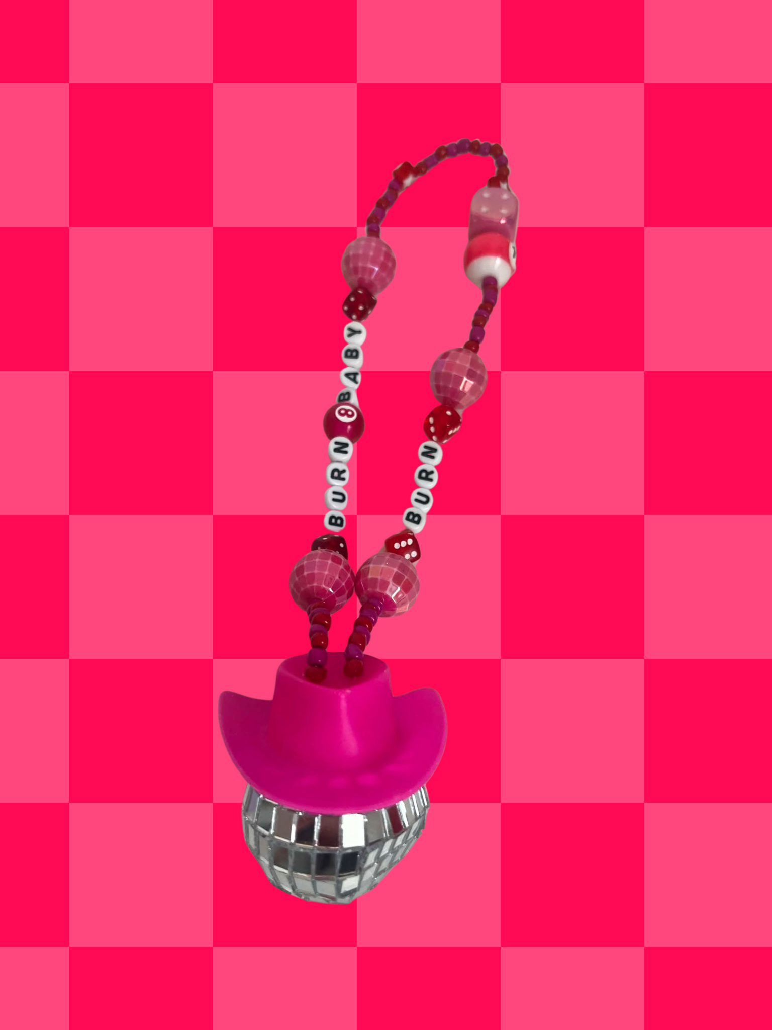 Burn baby burn rearview mirror charm, colored with red, pink and white, and the added touch pink cowgirl hat! Sparkle up your car with this whimsical, out of this world rearview mirror charm! This cute and trendy accessory is bound to add a fun touch to your car.