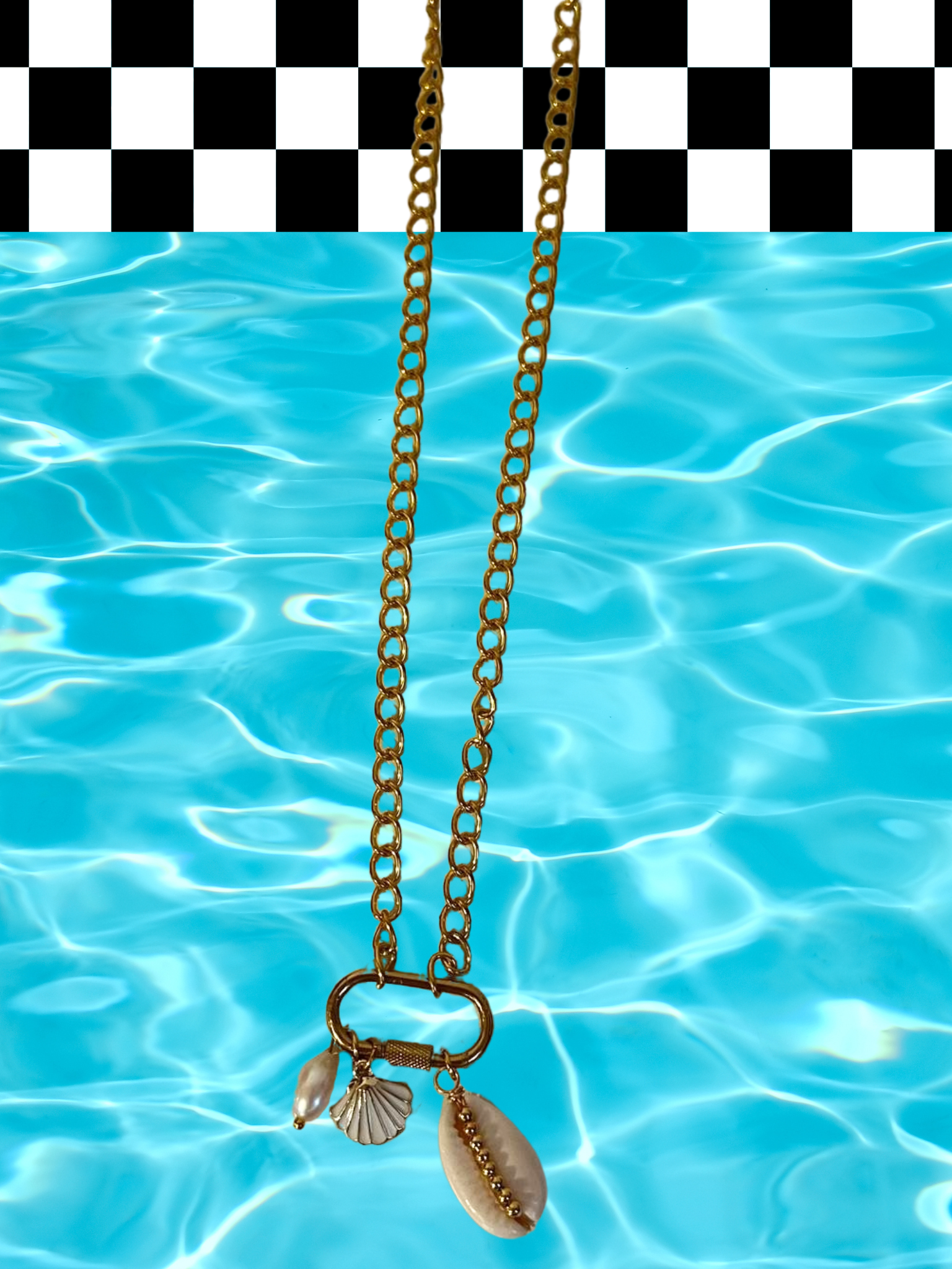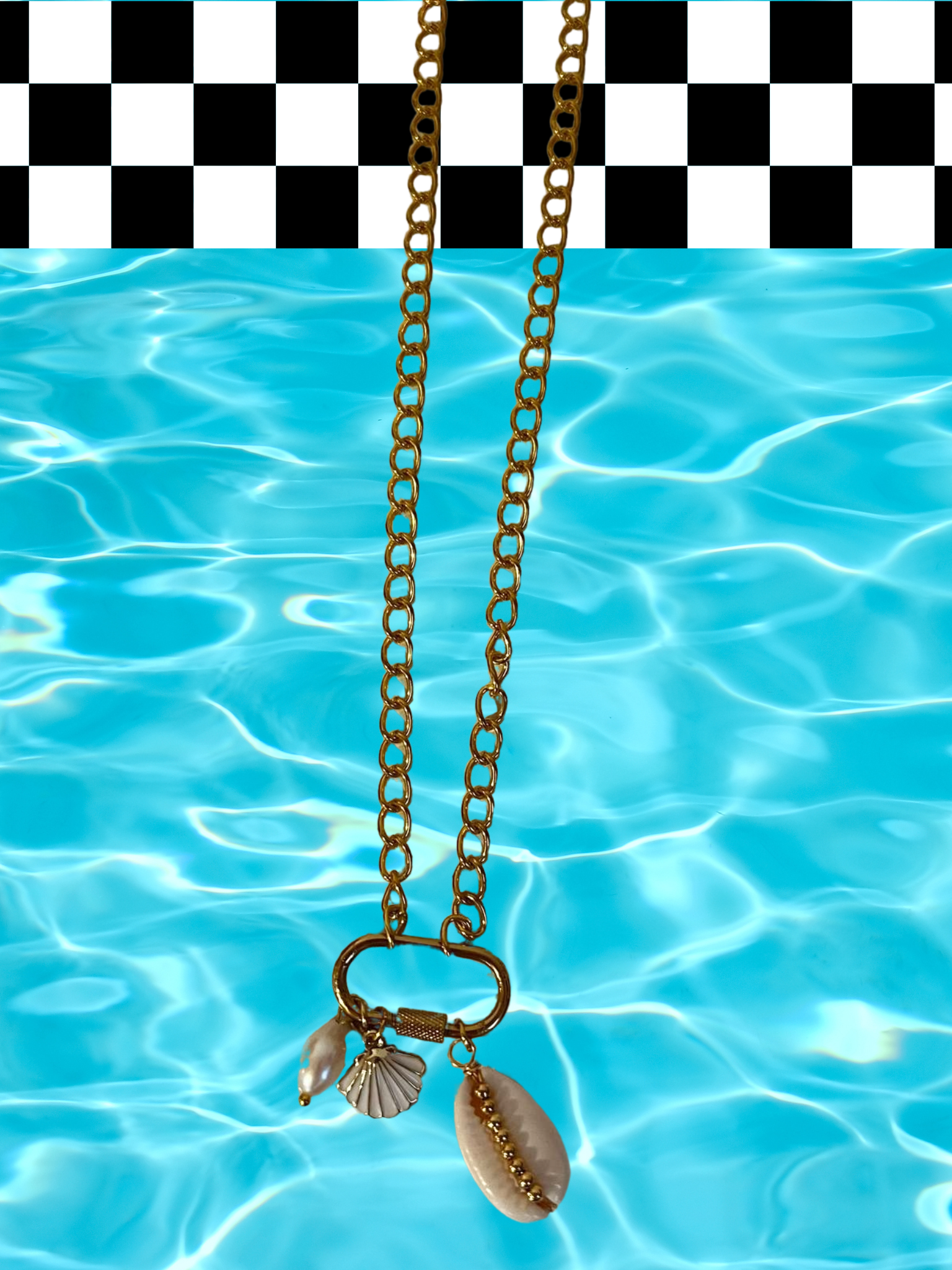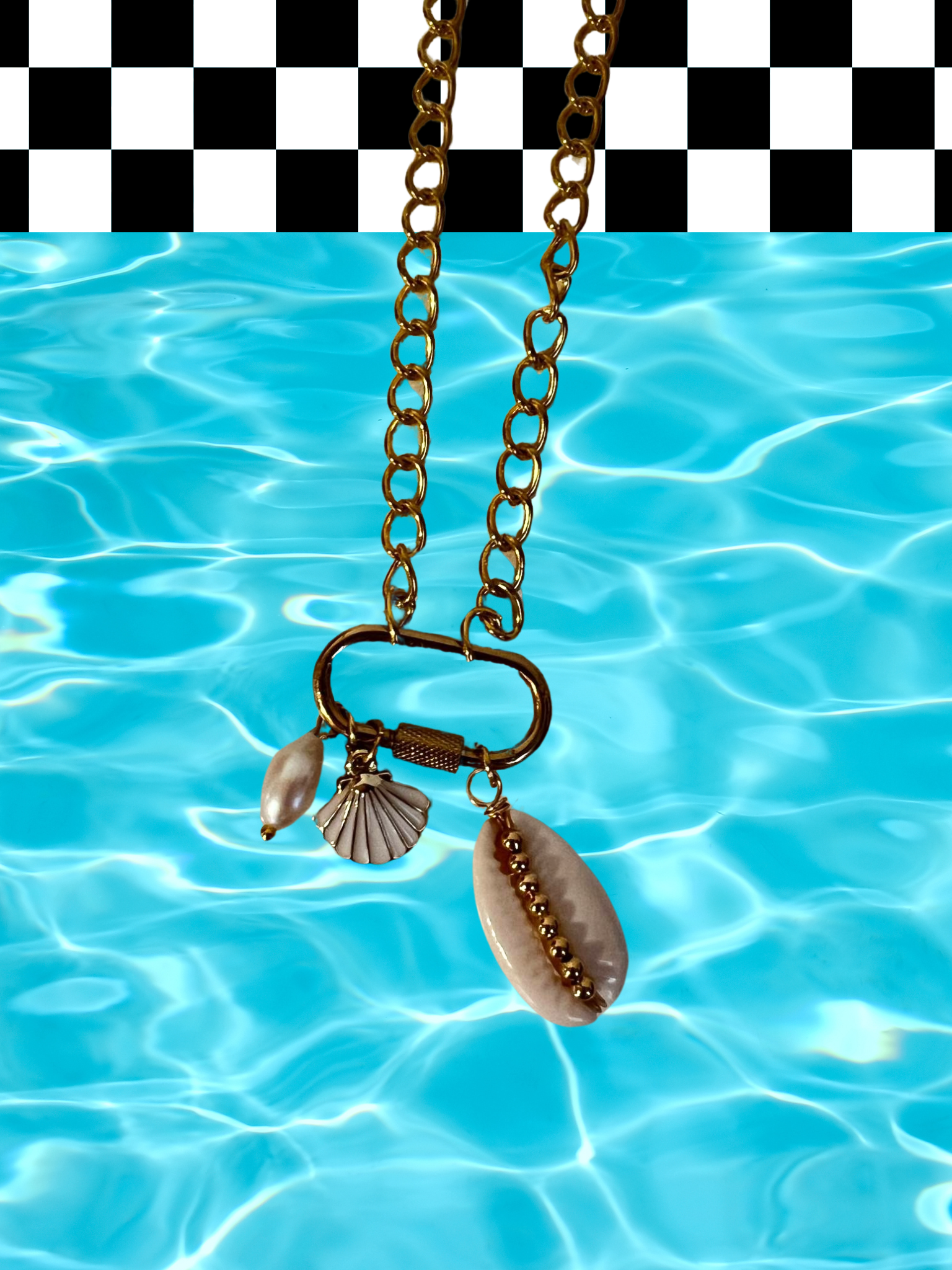 Call of the siren charm necklace, gold stainless steel O-chain, 14 inches in length, spiral clasp, charms included in this statement necklace are a pearl, scallop shell and seashell. Show out your everyday accessories with this unapologetic statement piece. Sure to bring a cool, bold, and groovy vibe to your everyday clothing wear!Ā