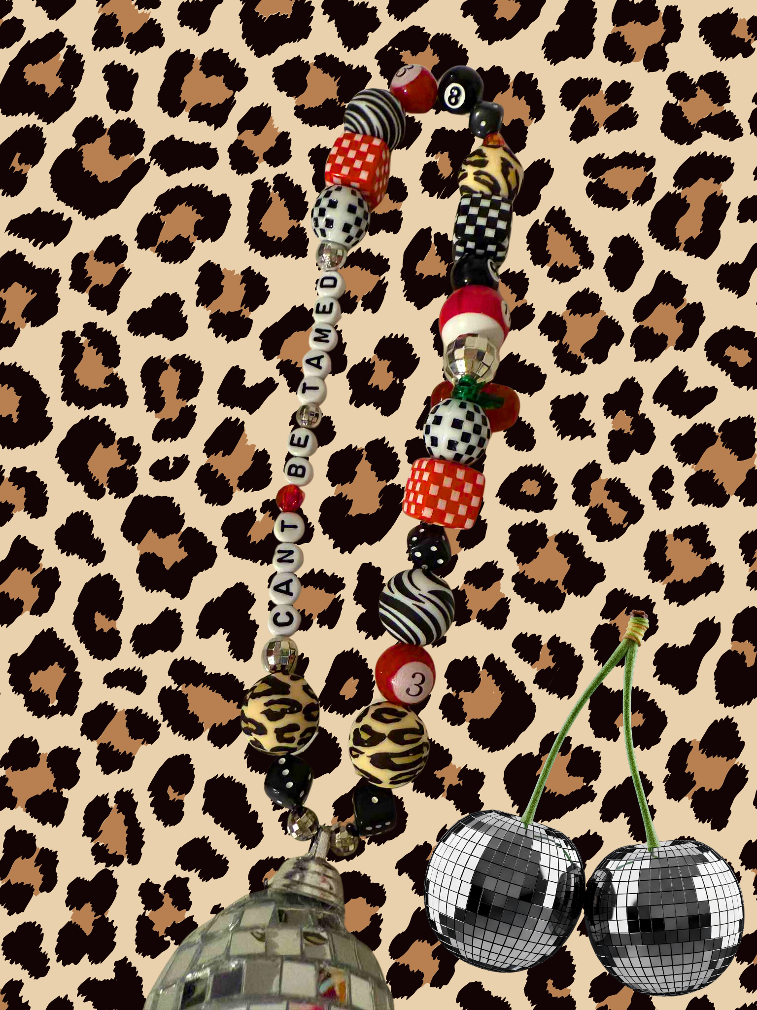 Can't be tamed rearview mirror charm, paired with pool balls, disco balls, checkered beads, dice, cherries and animal print beads! Sparkle up your car with this whimsical, out of this world rearview mirror charm! This cute and trendy accessory is bound to add a fun touch to your car.