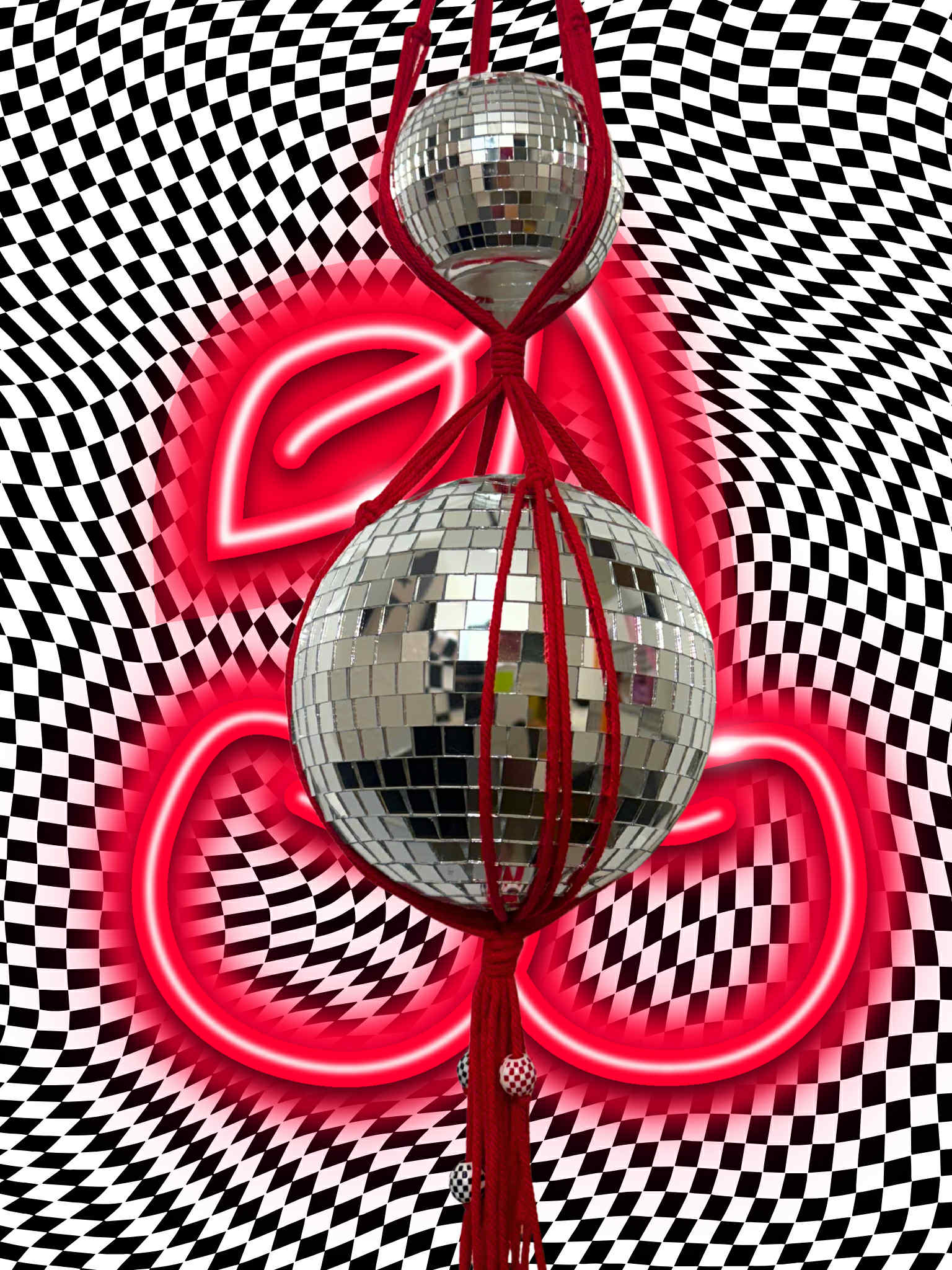 Catch me if you can macrame disco ball hanger, braided with red macrame rope and comes with a 3-inch and 6-inch disco ball, as well as a 4-inch disco ball planter! Sparkle up your home with this whimsical, fun addition! Bound to add sunshine, fun and grooviness to any room and every in your home. 👽🌈