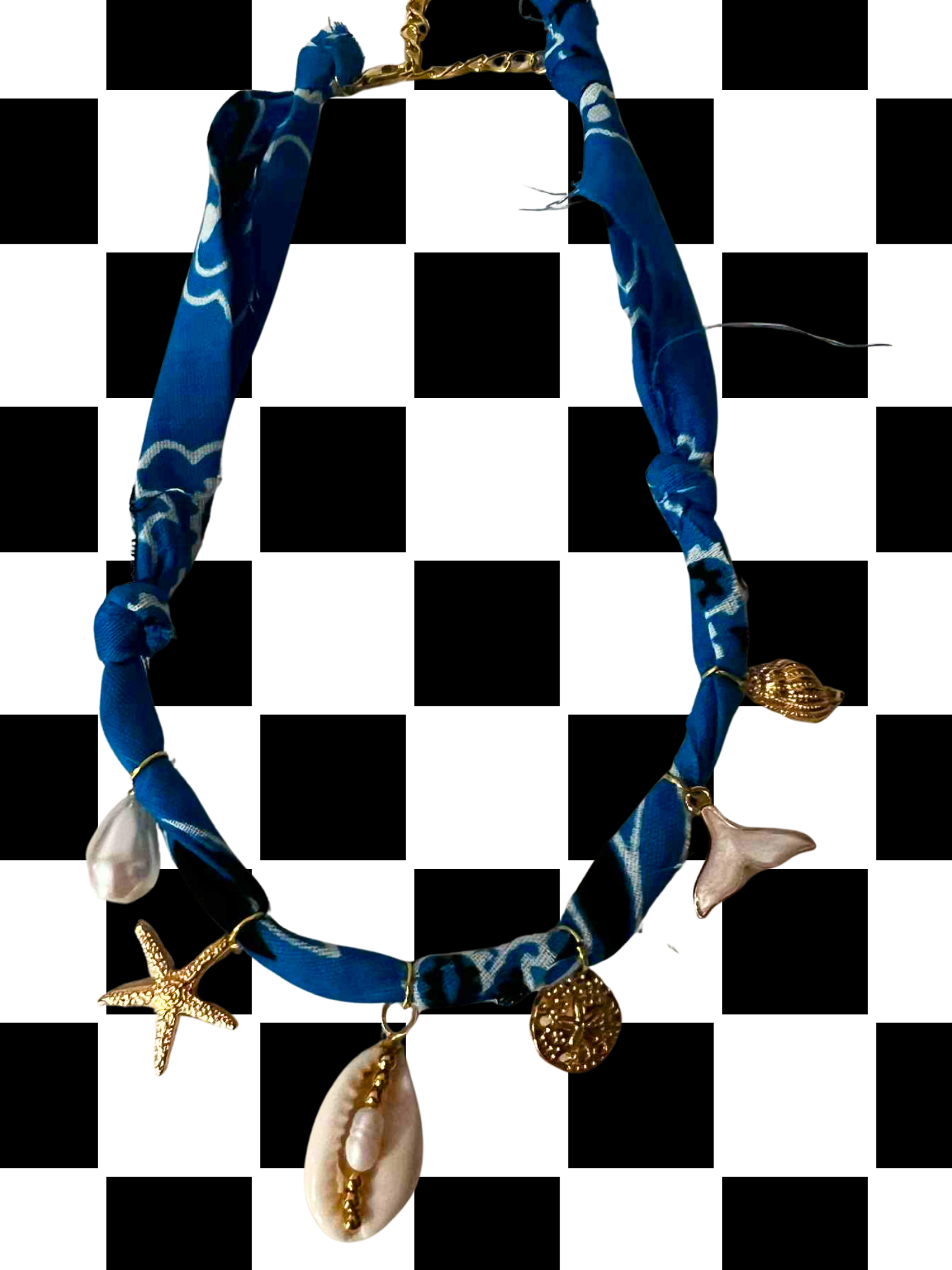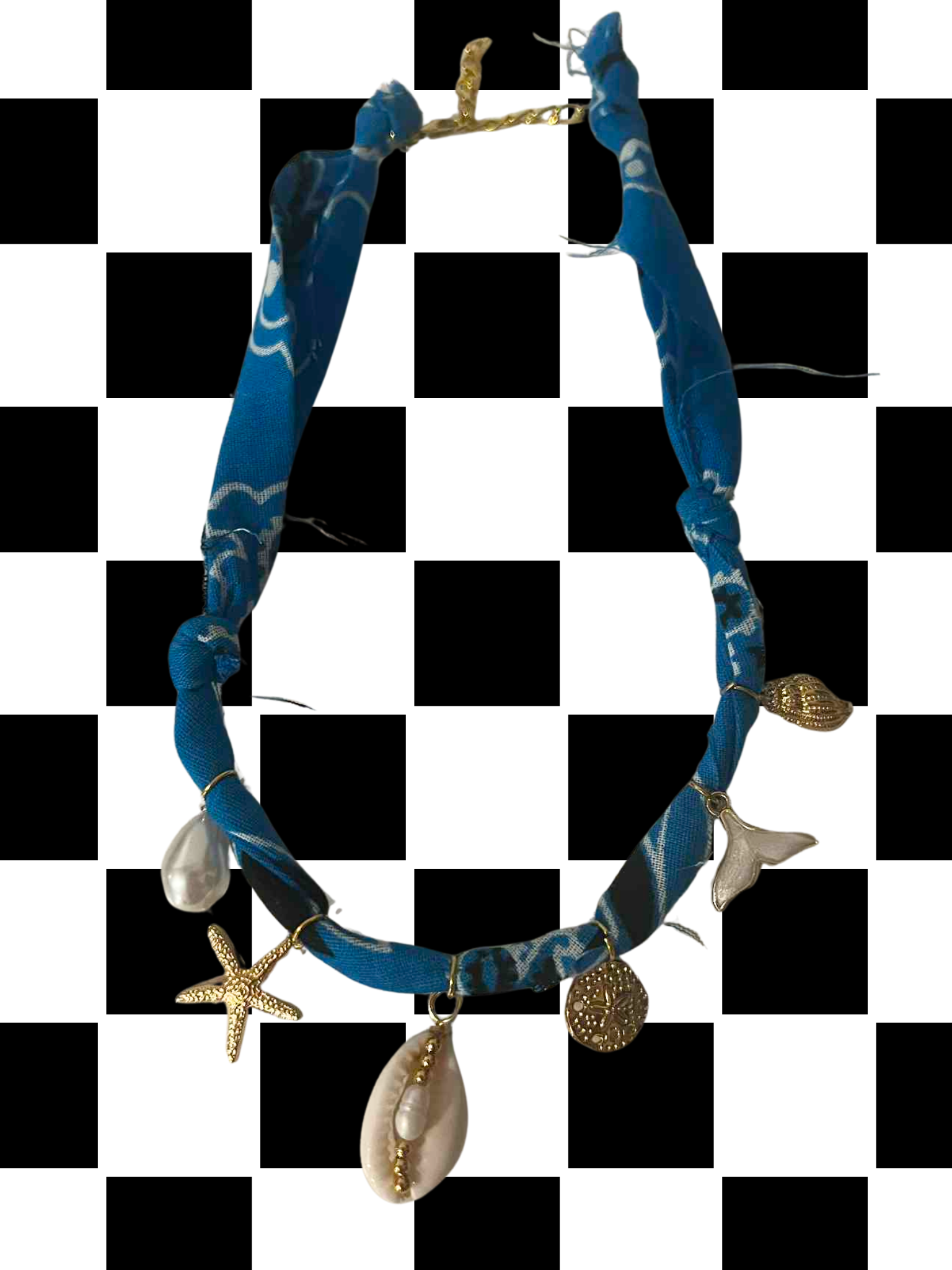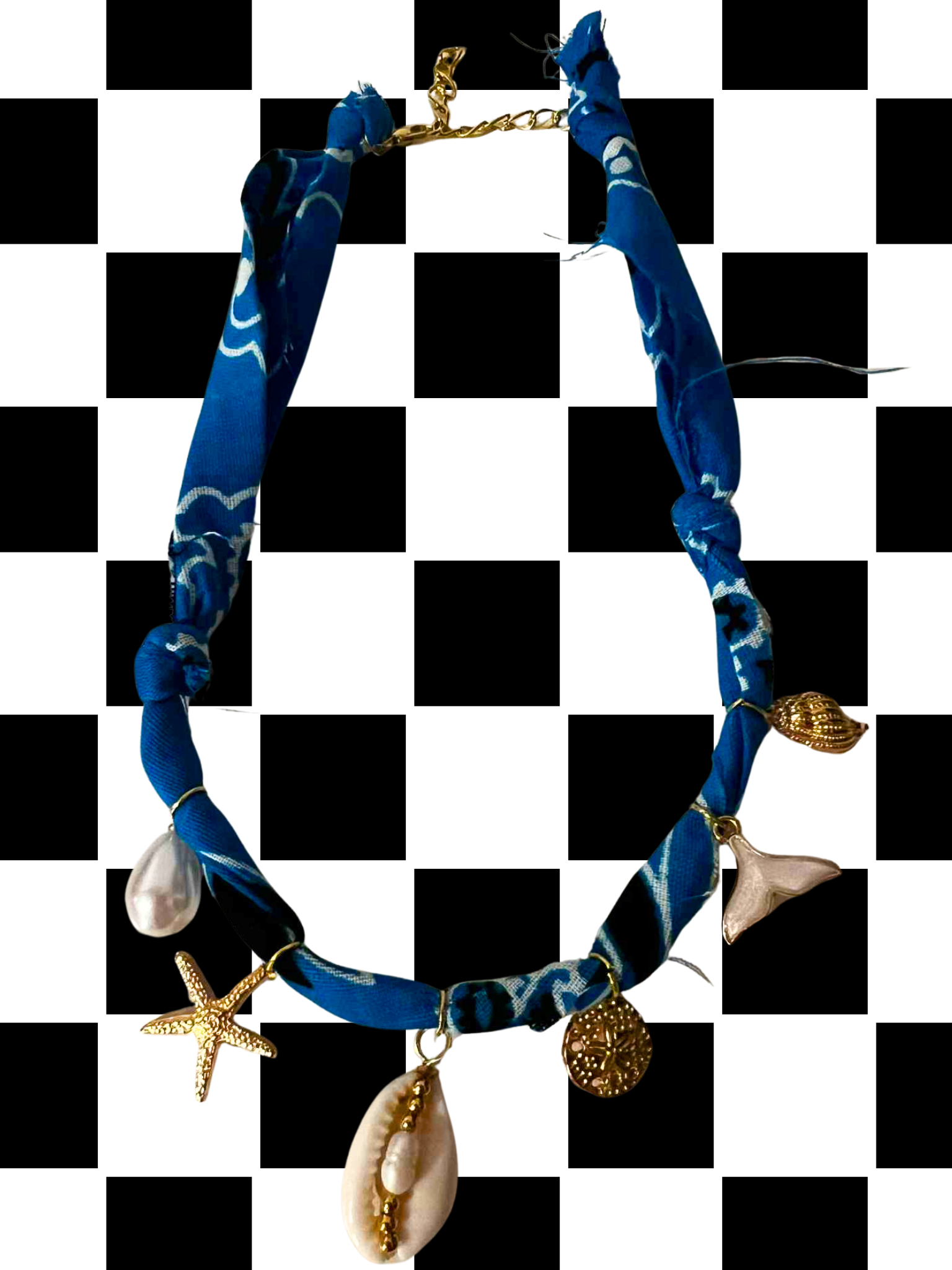 Caught in a riptide bandana charm necklace, wrapped in a royal blue bandana, 13 inches in length, tail chain added for extra comfort fit, charms included in this statement necklace are a pearl, starfish, shell with an added pearl in the center, sand dollar, mermaid tail and a conch shell. Show out your everyday accessories with this unapologetic statement piece. Sure to bring a cool, bold, and groovy vibe to your everyday clothing wear!Ā