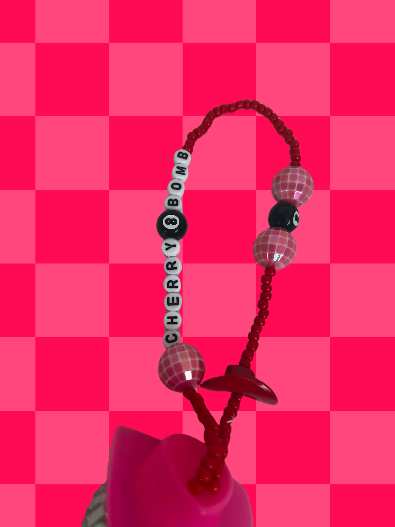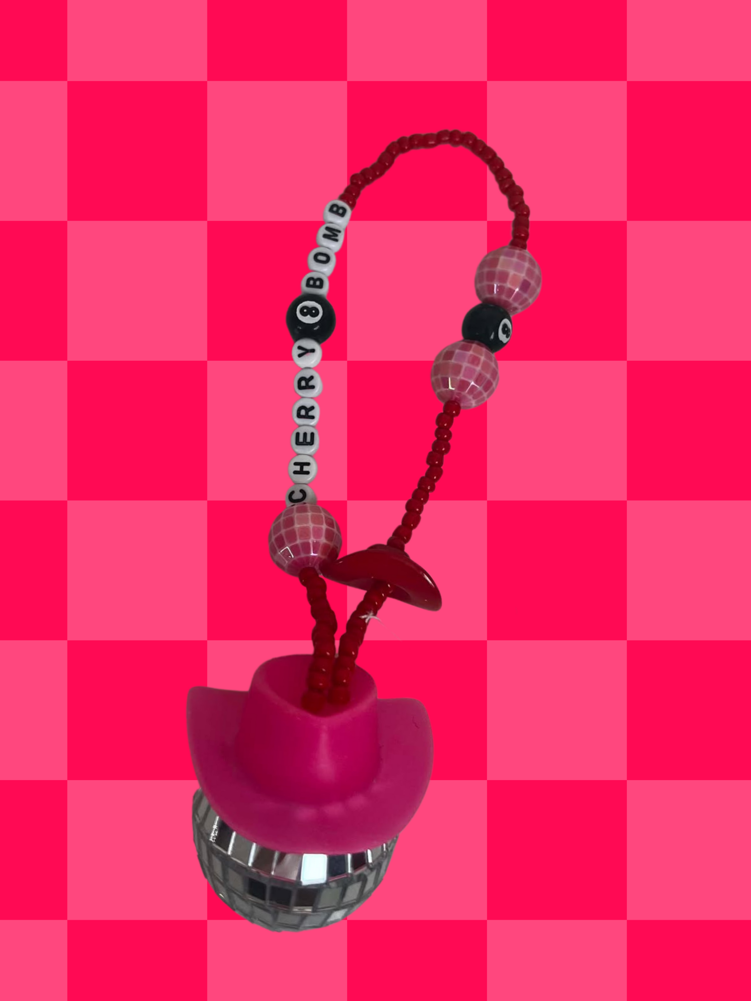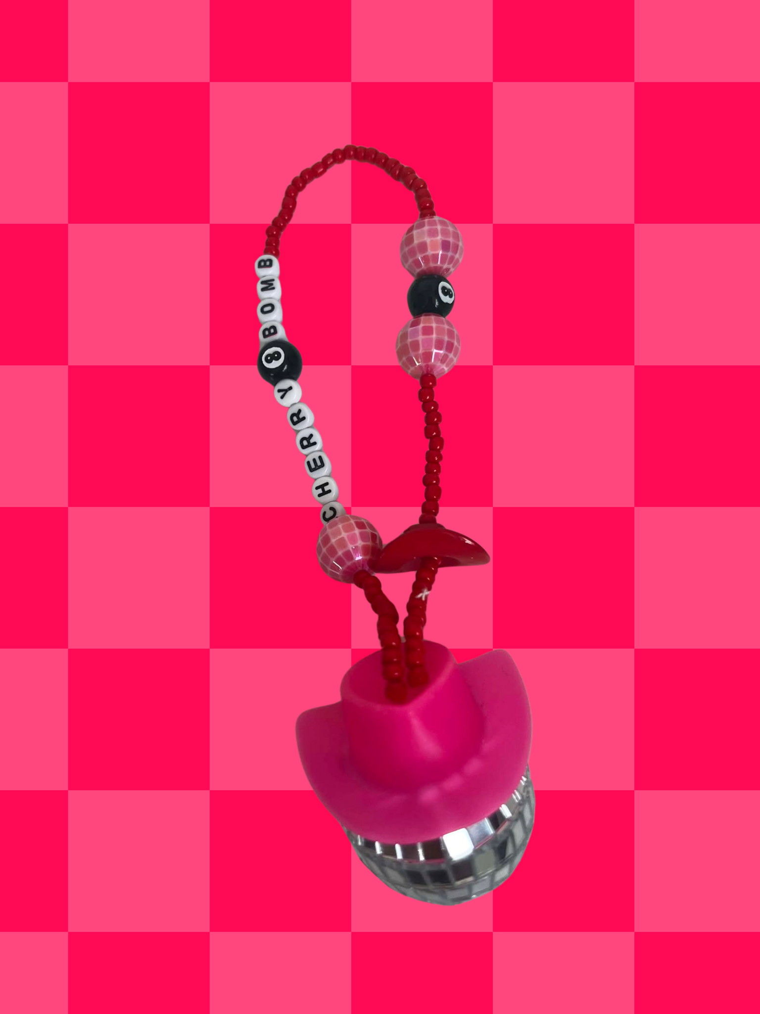 Cherry bomb rearview mirror charm, colored with red, pink, black and white, and the added touch pink cowgirl hat! Sparkle up your car with this whimsical, out of this world rearview mirror charm! This cute and trendy accessory is bound to add a fun touch to your car.