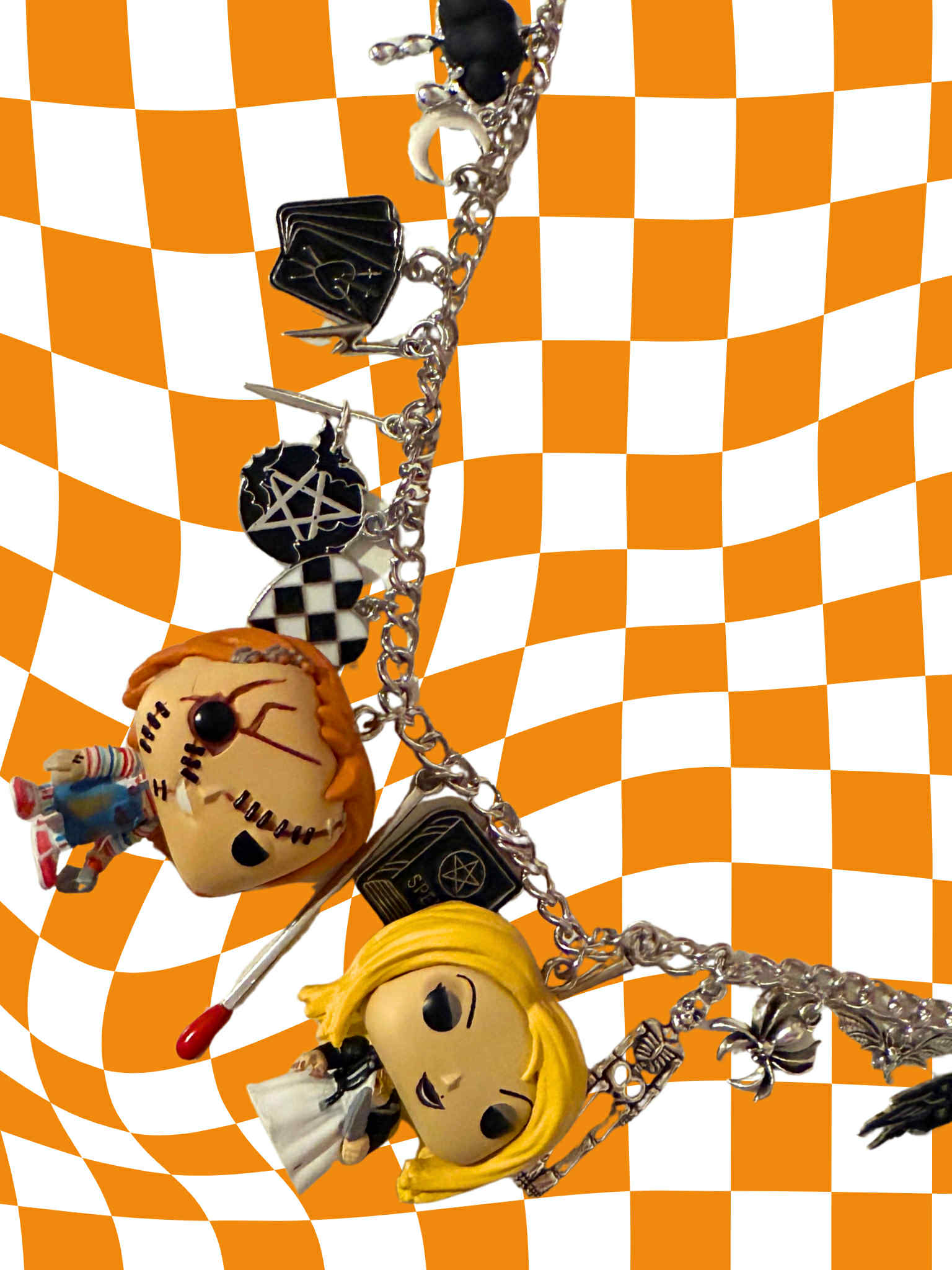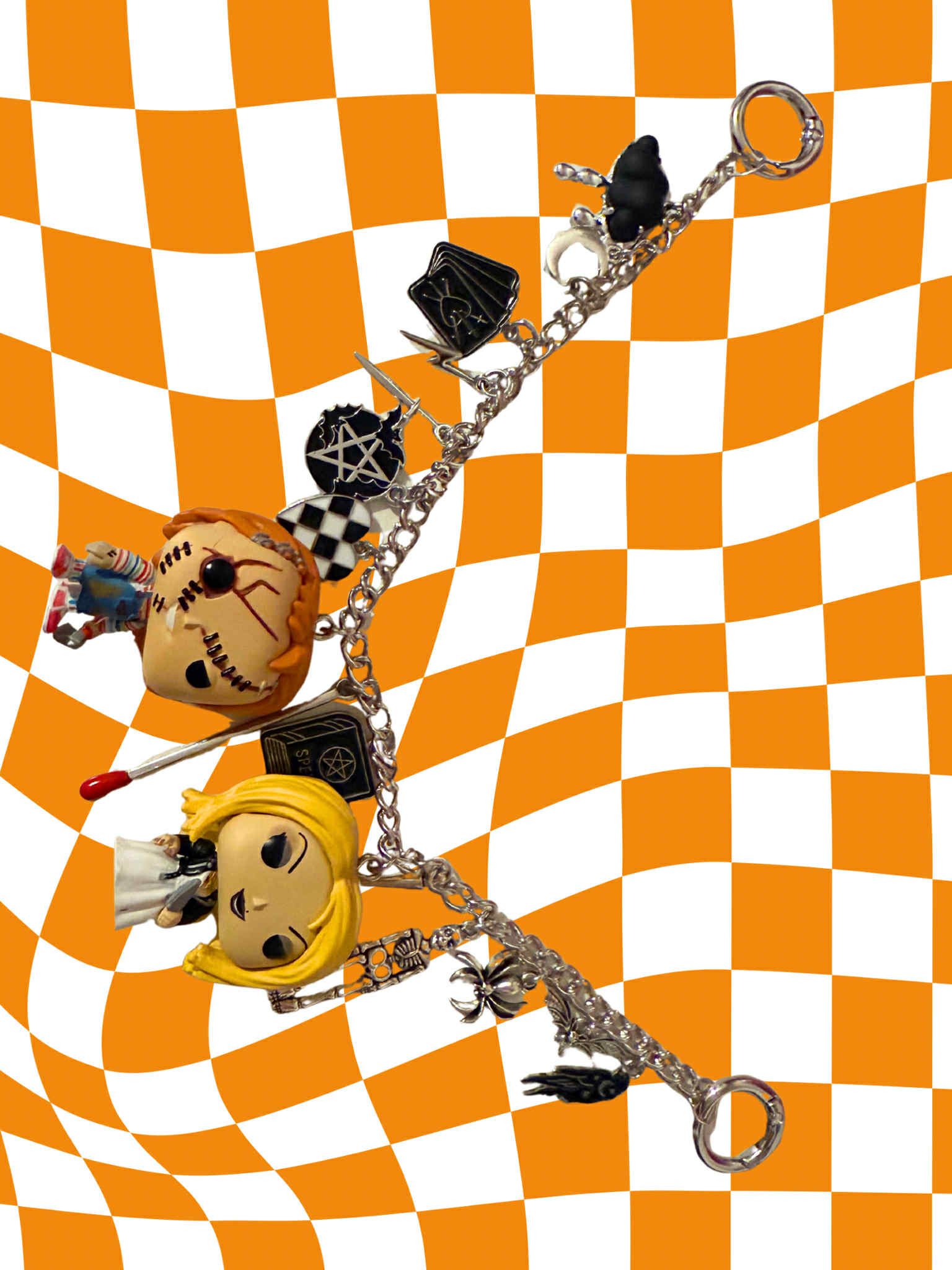 Chucky and Tiffany purse charm, silver stainless steel chain, 13 inches in length, there are many charms included along the chain to match and make your character/s standout. Added charms have been soldered to ensure hold on chain. Show out your everyday accessories with this unapologetic statement piece. Sure to bring a cool, bold, and groovy vibe to your everyday clothing wear!
