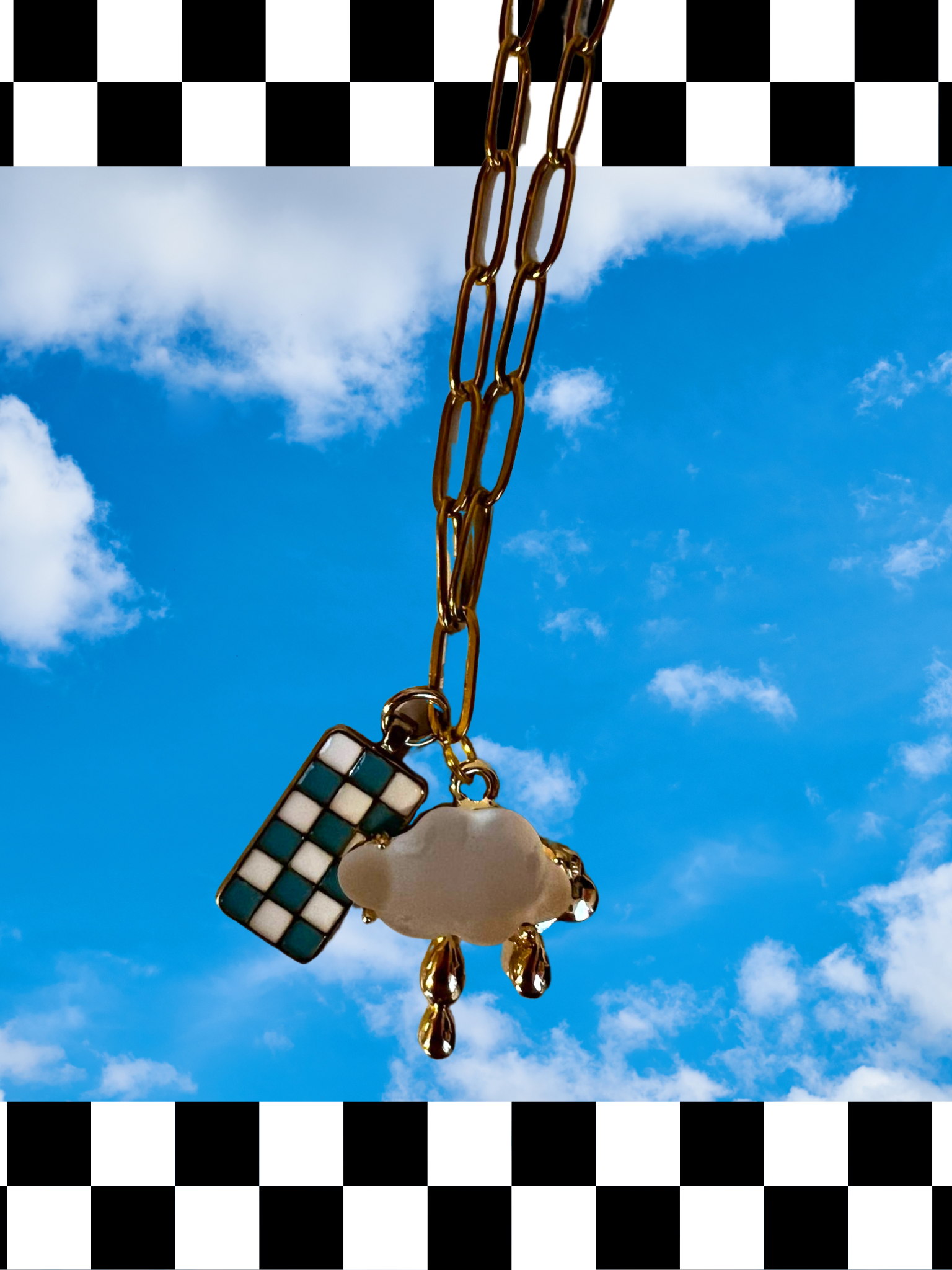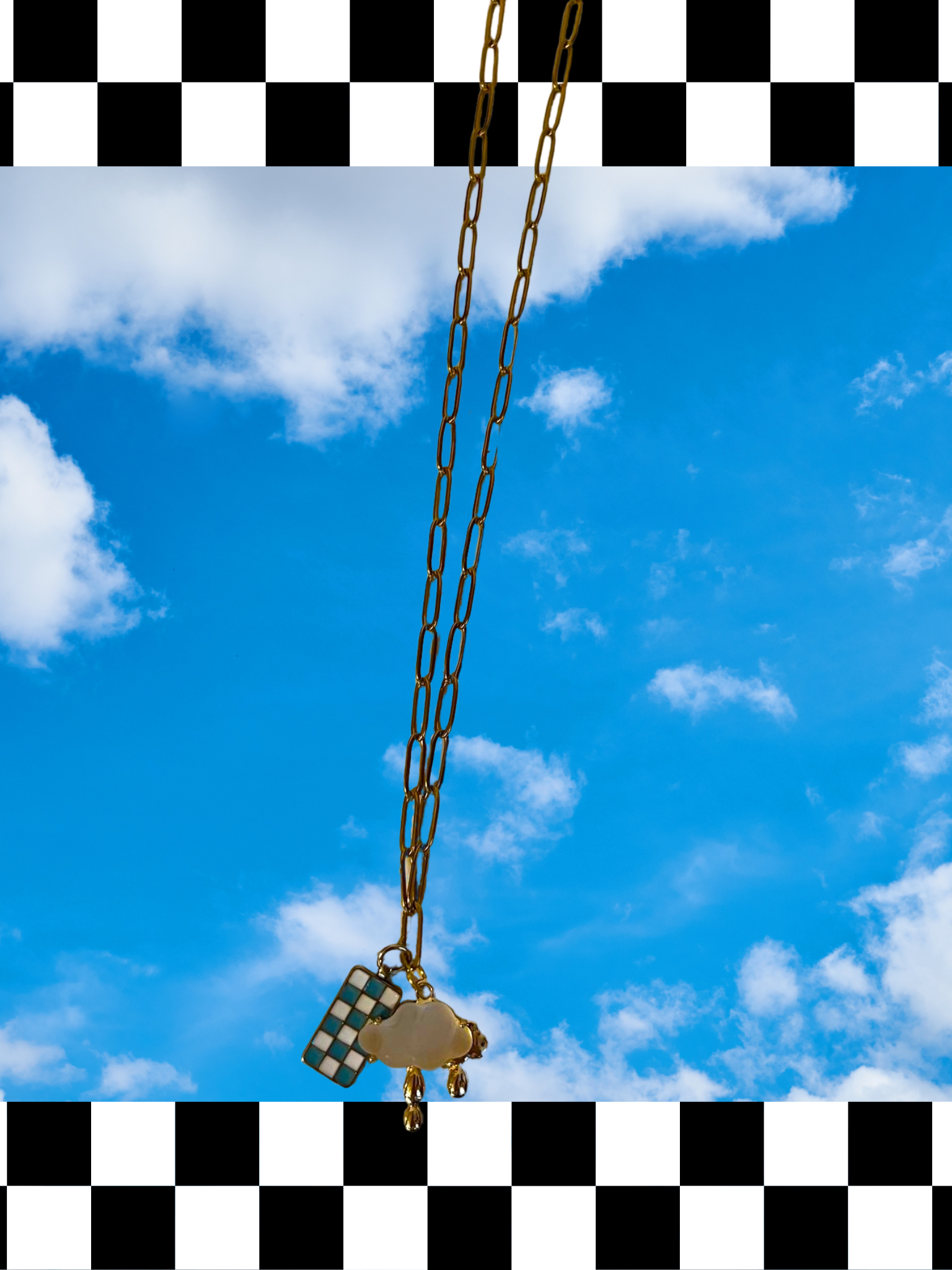 Cloudy skies charm necklace, gold stainless steel paperclip chain, 15 inches in length, tail chain added for extra comfort fit, charms included in this statement necklace are a blue checkered piece and rain cloud charm. Show out your everyday accessories with this unapologetic statement piece. Sure to bring a cool, bold, and groovy vibe to your everyday clothing wear!Ā