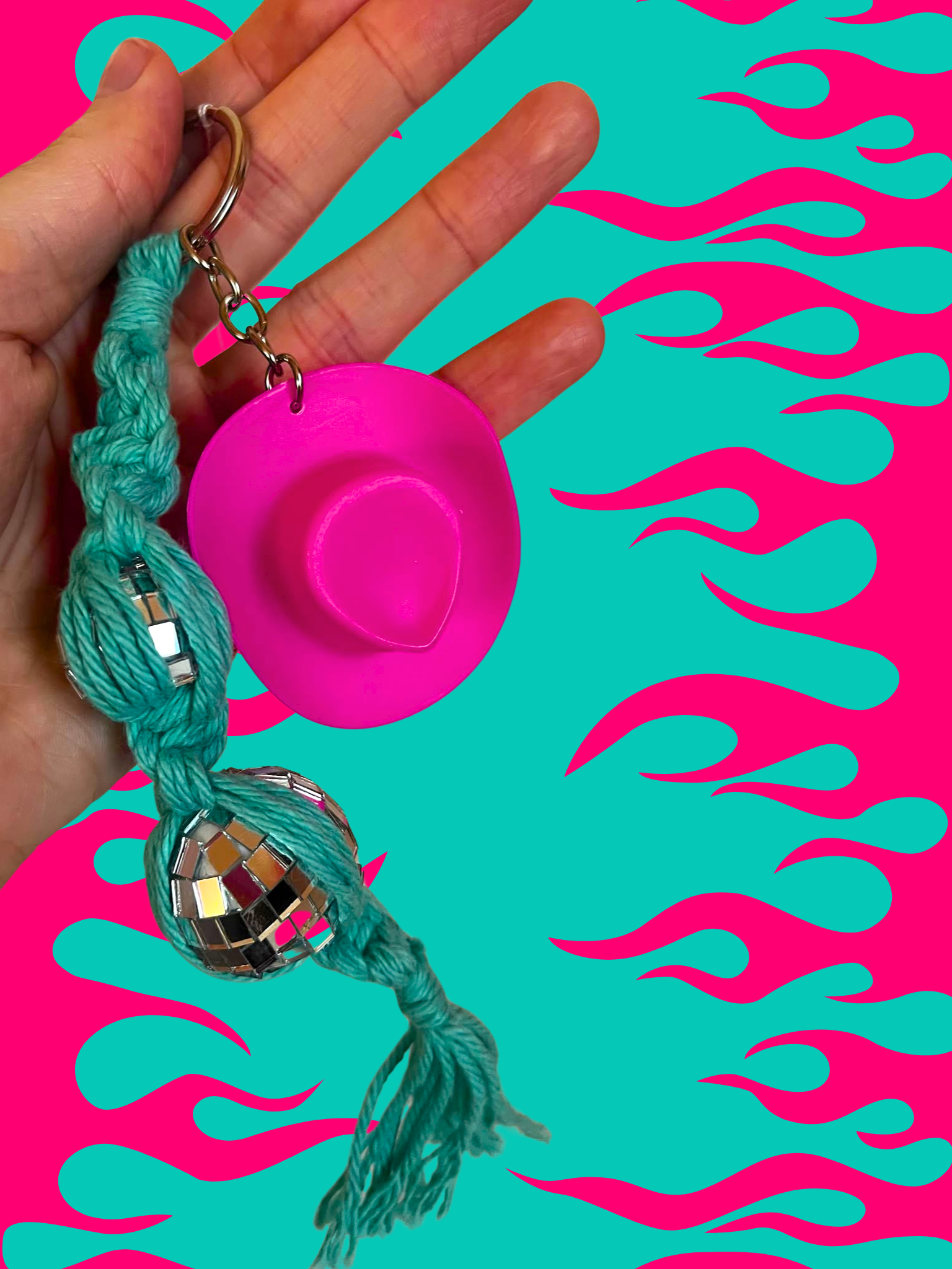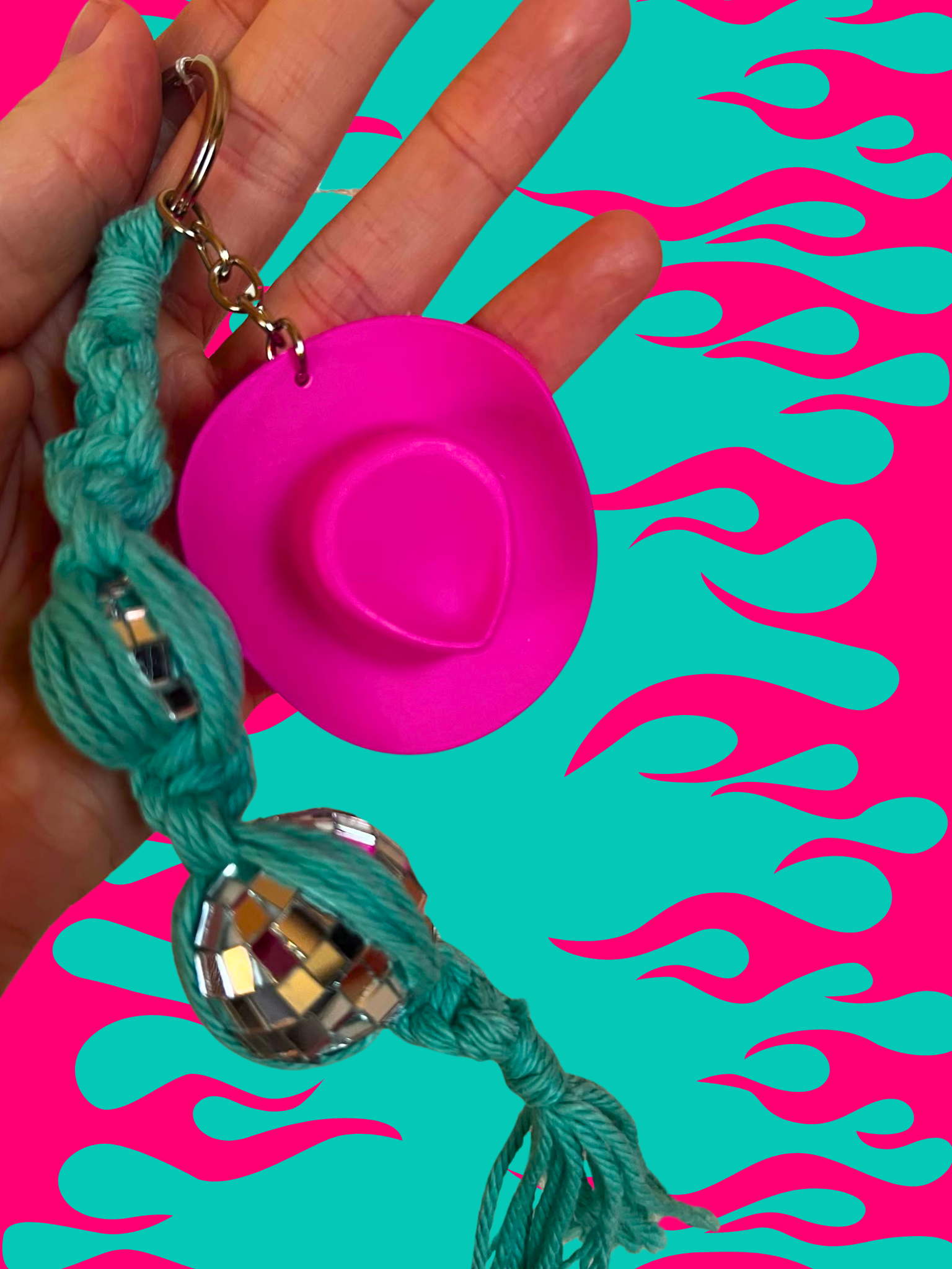 Cowgirl barbie macrame keychain, braided with teal colored rope, and the added touch double disco balls! Sparkle up your keys, purse, backpack, gym bag, etc. with this whimsical, fun keychain! This cute and trendy accessory is bound to add a fun touch to your everyday accessories.