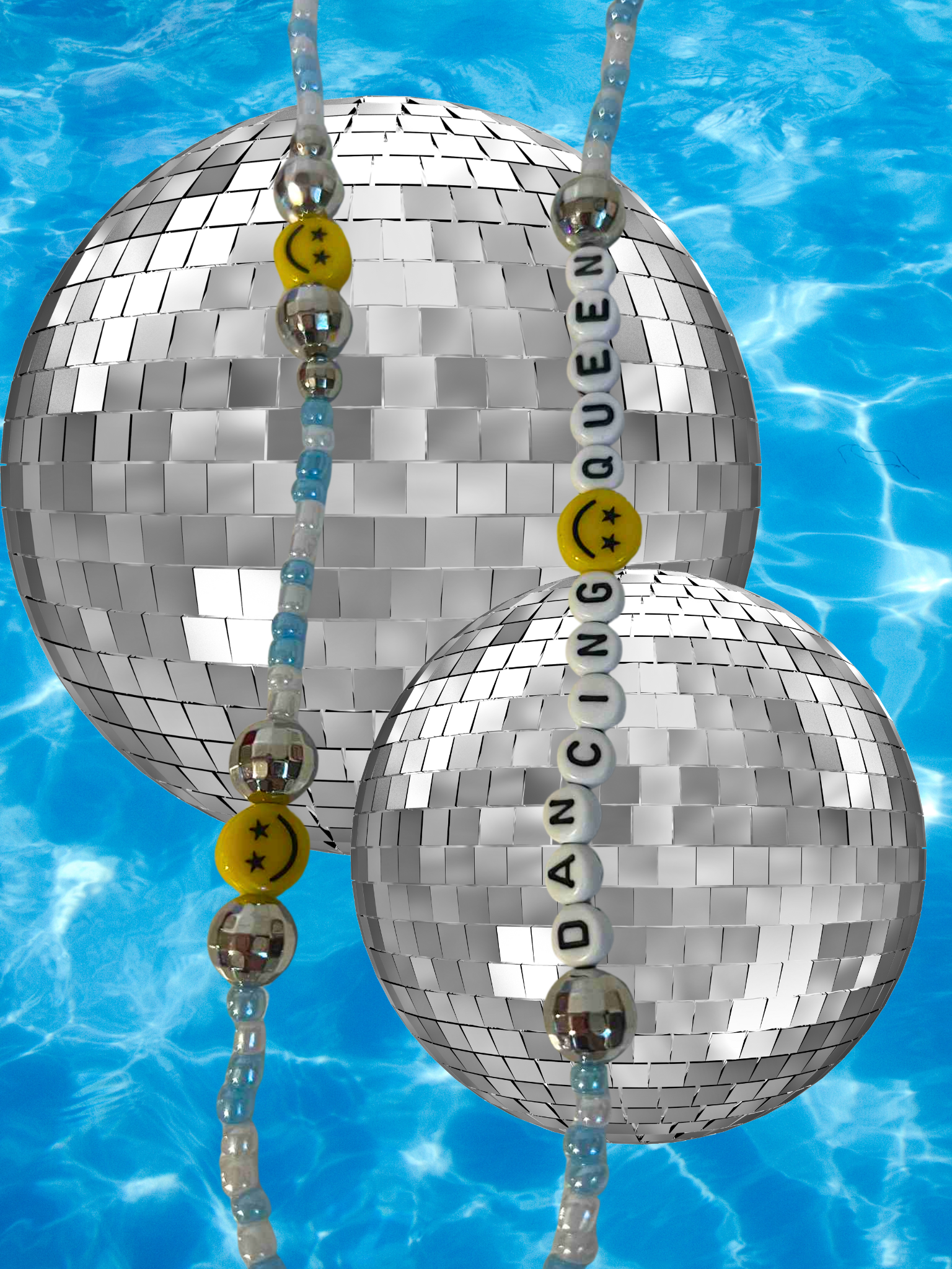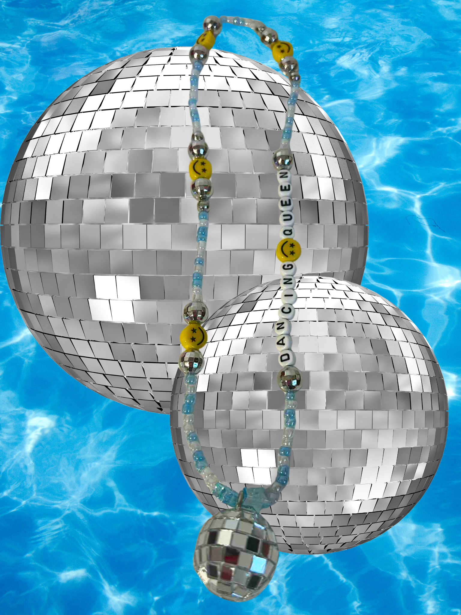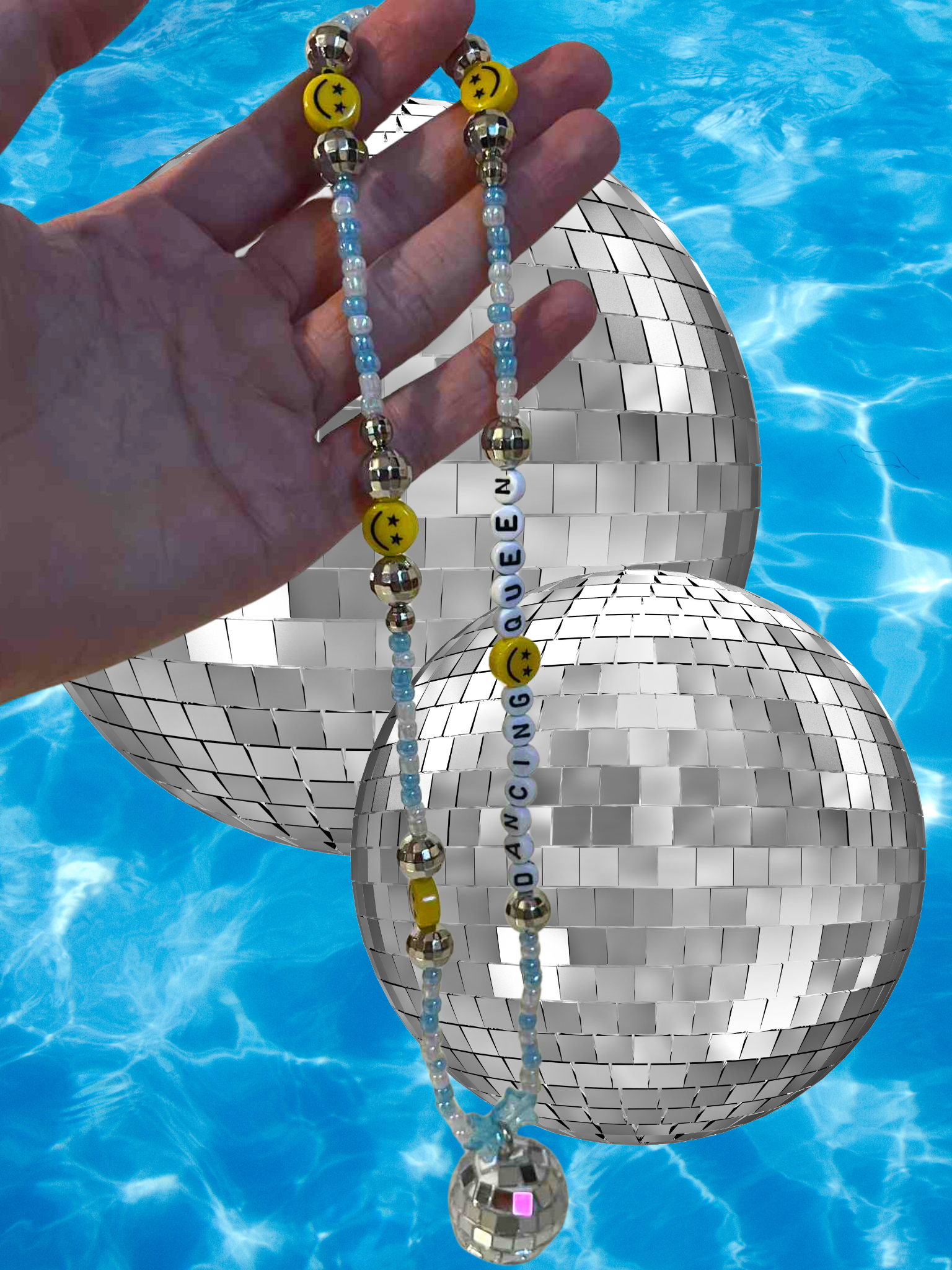 Dancing queen rearview mirror charm, colored with blue, white, yellow and silver, and the added touch disco ball! Sparkle up your car with this whimsical, out of this world rearview mirror charm! This cute and trendy accessory is bound to add a fun touch to your car.