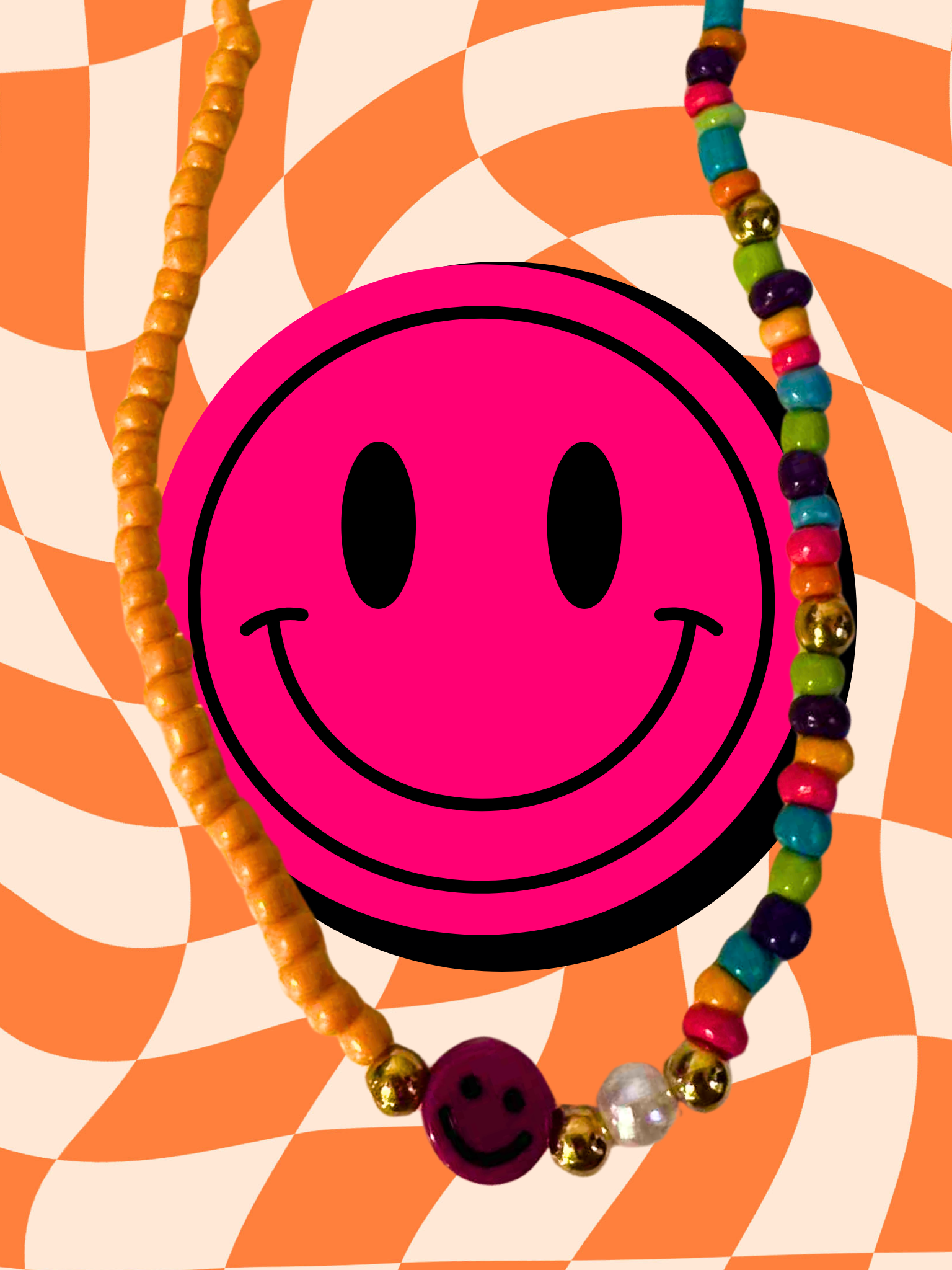 Diva funk beaded necklace, threaded with orange beads on one side, the other rainbow mixed with gold beads, a pearl and the added pink smiley face in between! Sparkle up your everyday accessories with this fun statement piece. Sure to bring a funky, colorful, fun vibe to your everyday clothing wear! Threaded with stretchy elastic string, length is 17 inches.