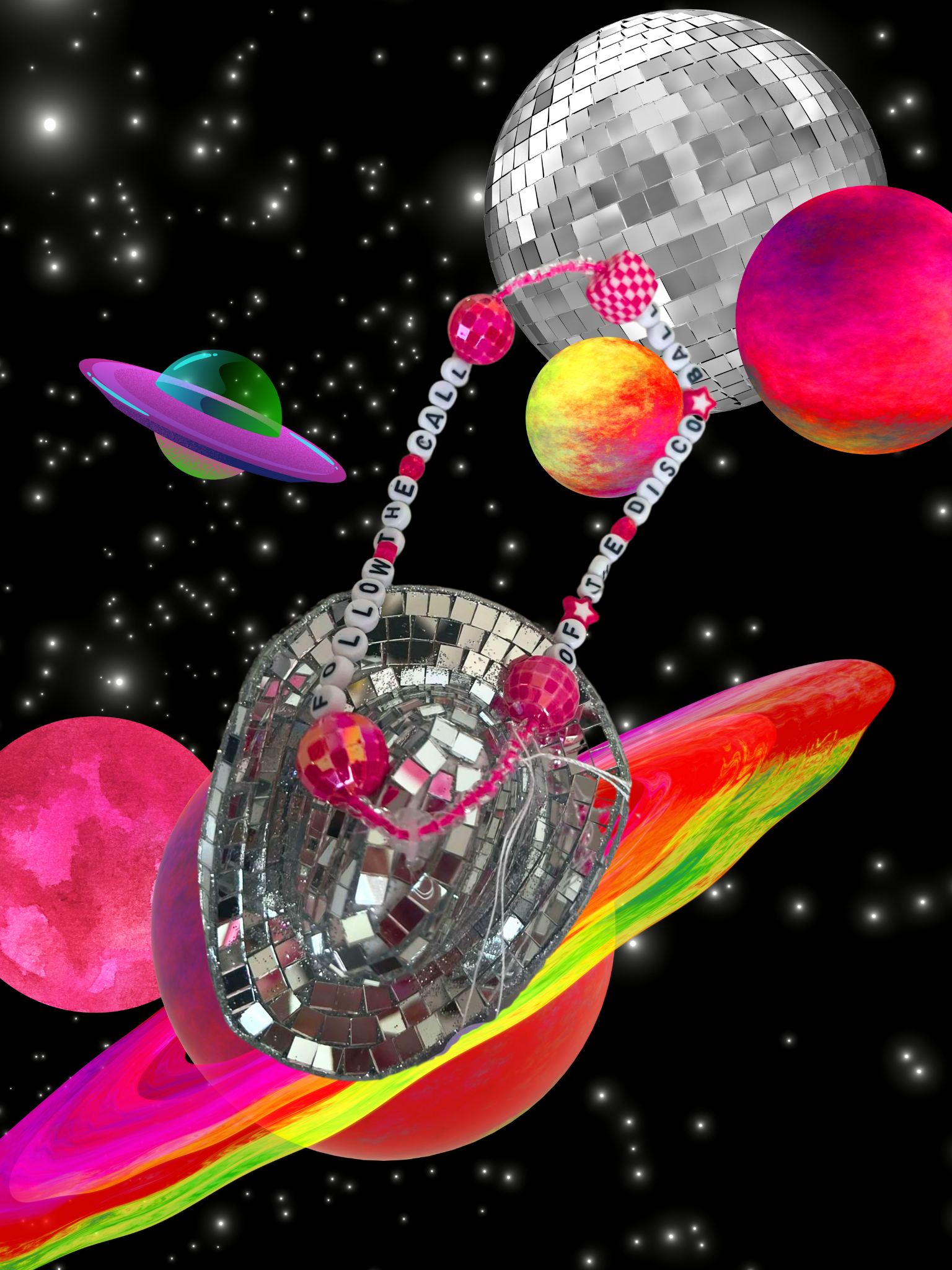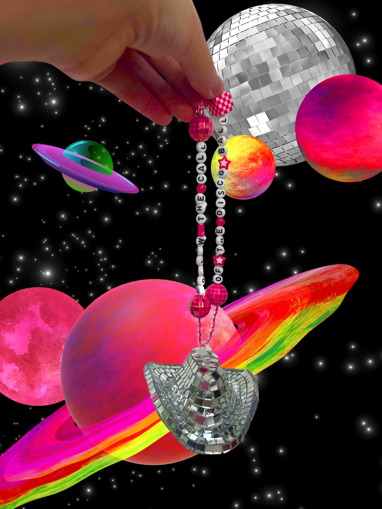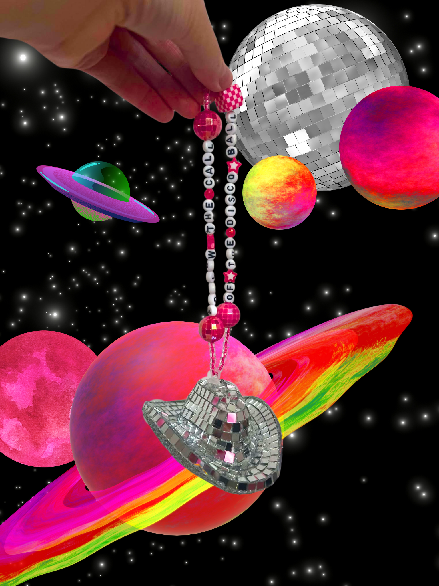 Follow the call of the disco ball rearview mirror charm, colored with pink and white, and the added touch disco cowgirl hat! Sparkle up your car with this whimsical, out of this world rearview mirror charm! This cute and trendy accessory is bound to add a fun touch to your car.