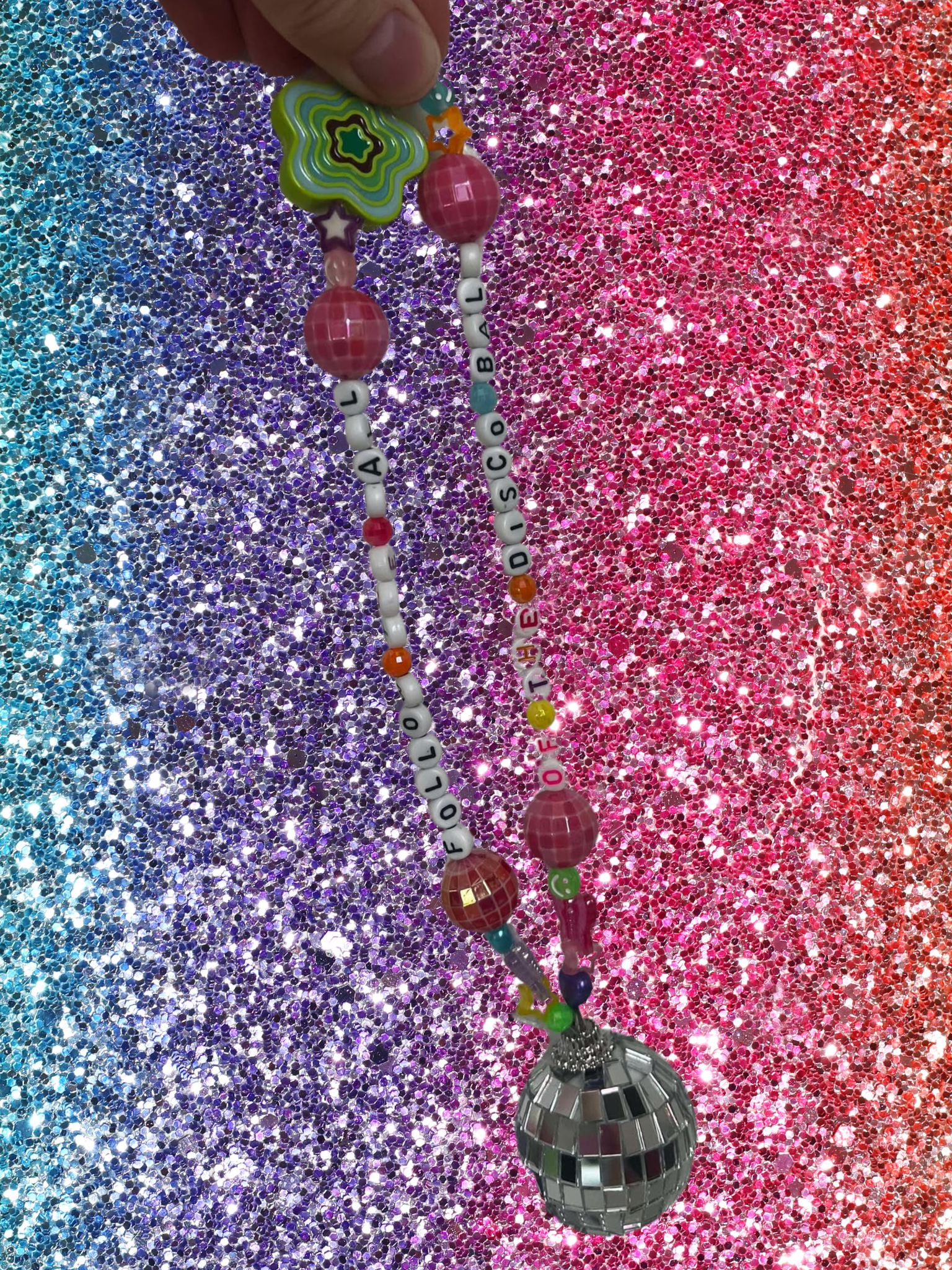 Follow the call of the disco ball rearview mirror charm, colored with green, pink, purple, orange, green, yellow and blue, and the added touch disco! Sparkle up your car with this whimsical, out of this world rearview mirror charm! This cute and trendy accessory is bound to add a fun touch to your car.