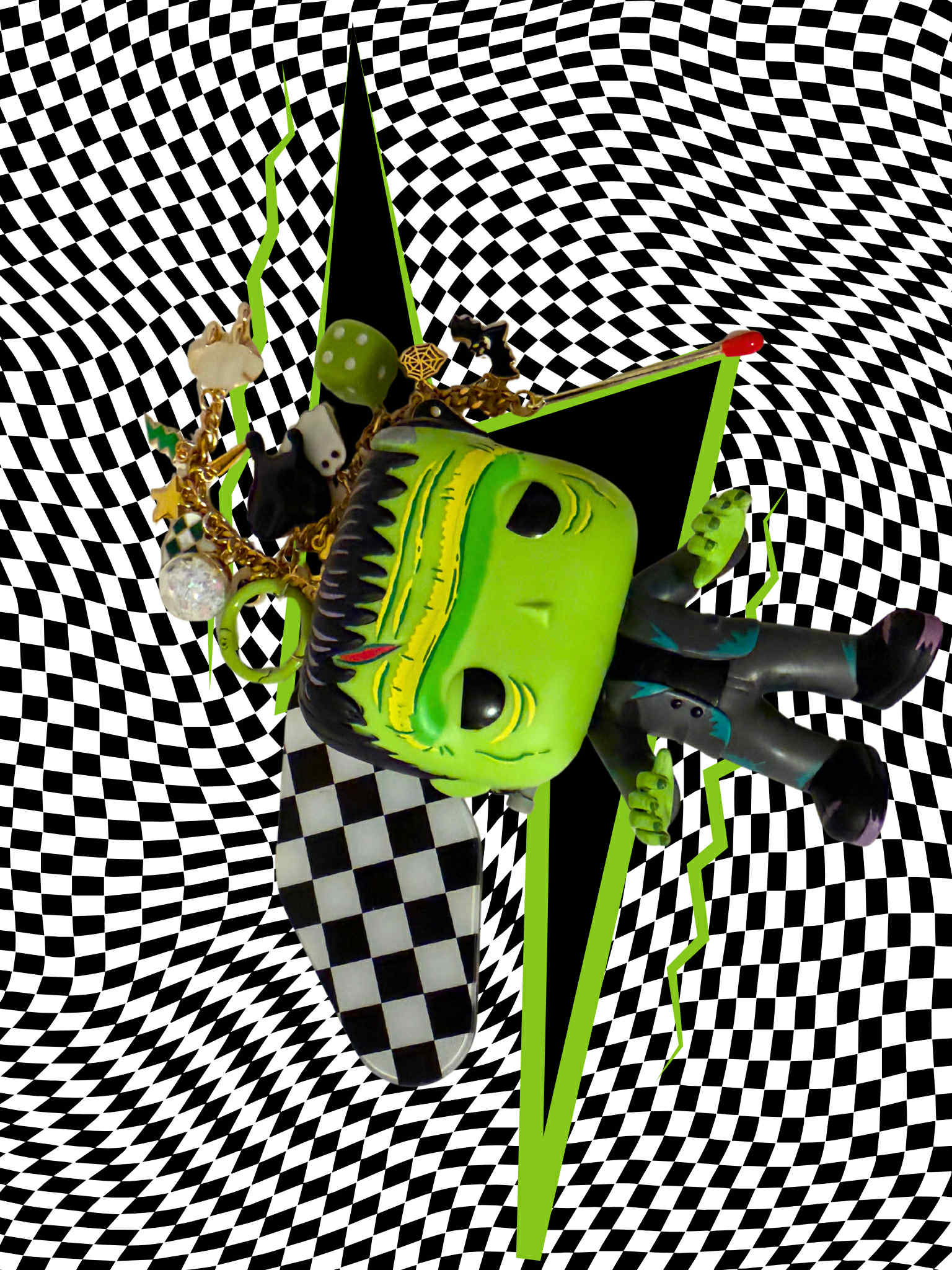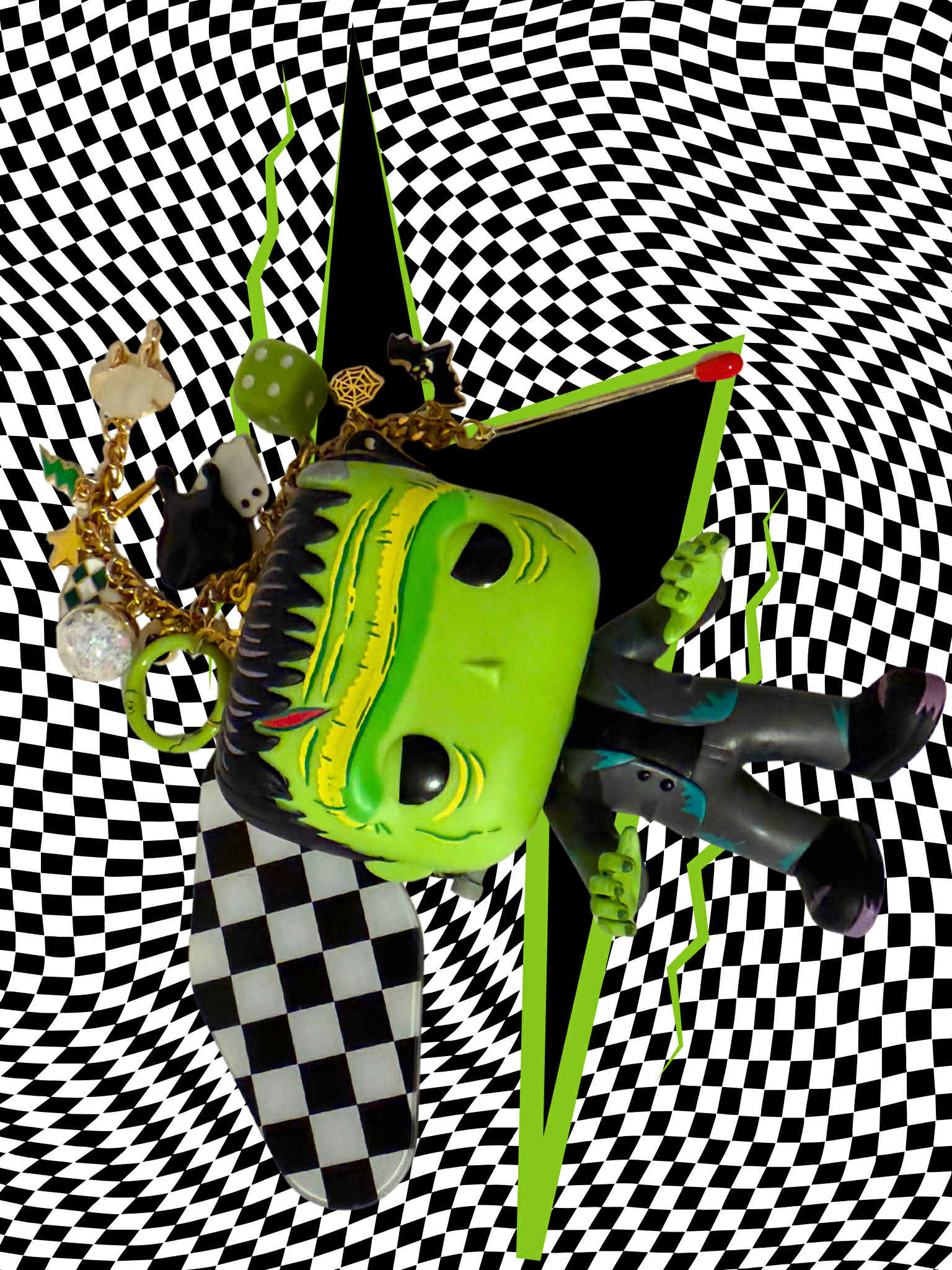 Frankenstein figure keychain, hand made into the coolest, cutest, grooviest keychain. Added is additional O-chains in gold, varied in different lengths, as well as many different charms included along the chains to match and make your figure standout. Added chains have been soldered to ensure hold on keychain.