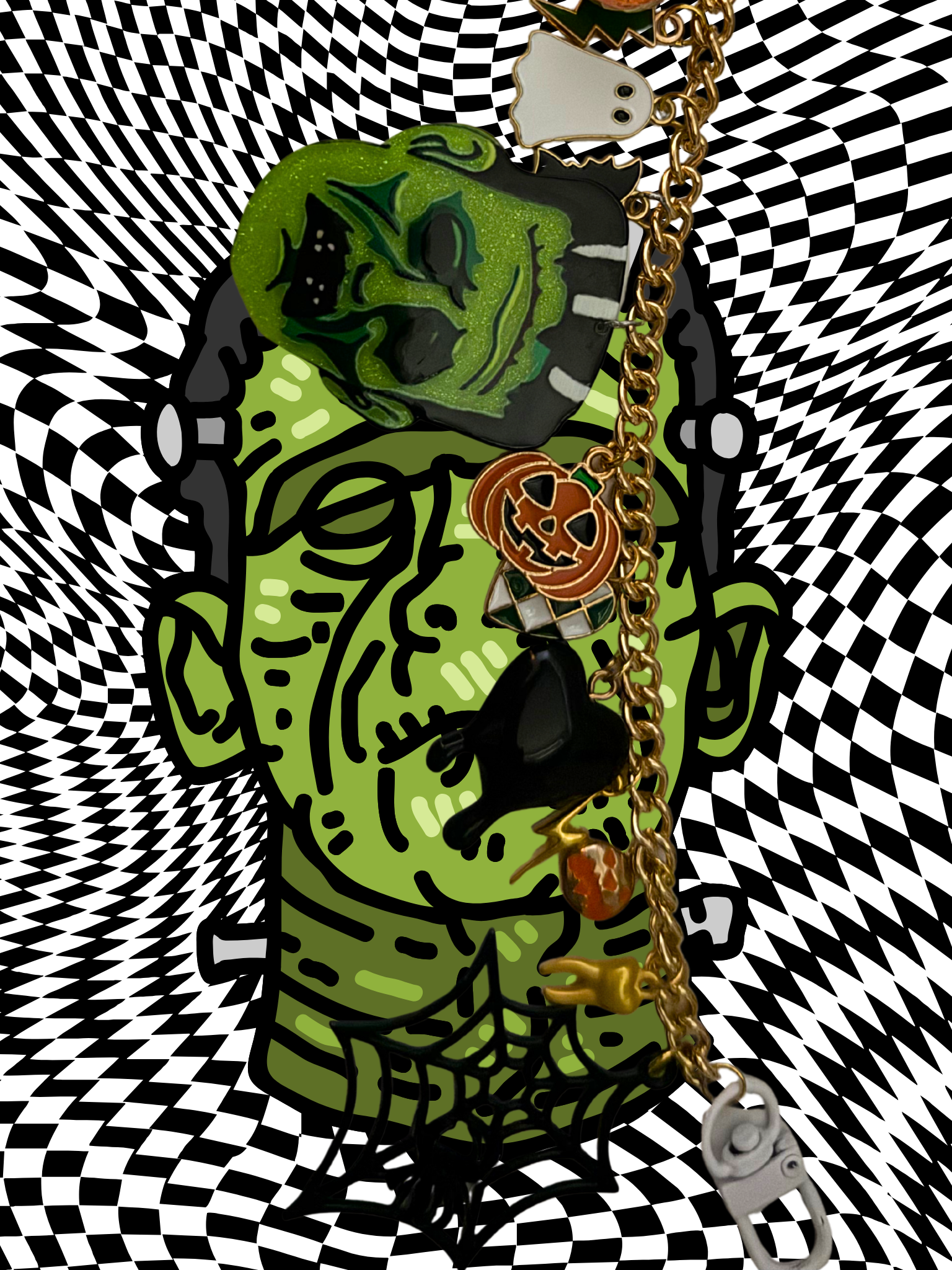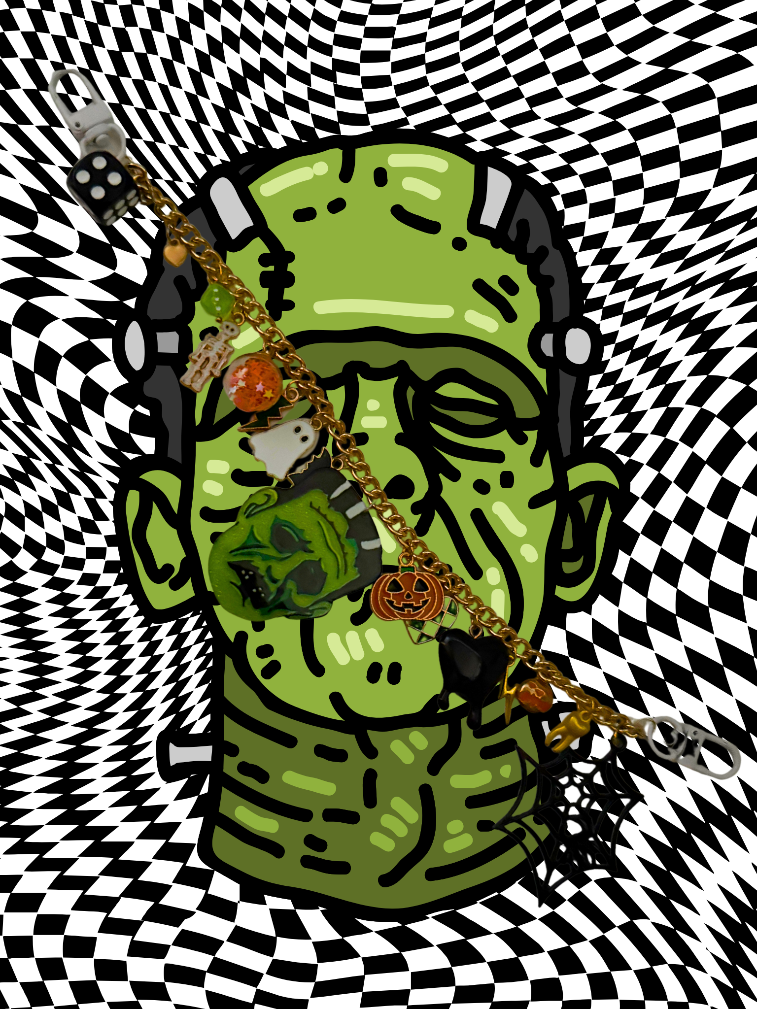 Frankenstein purse charm, gold stainless steel chain, 13 inches in length, there are many charms included along the chain to match and make your character/s standout. Added charms have been soldered to ensure hold on chain. Show out your everyday accessories with this unapologetic statement piece. Sure to bring a cool, bold, and groovy vibe to your everyday clothing wear!