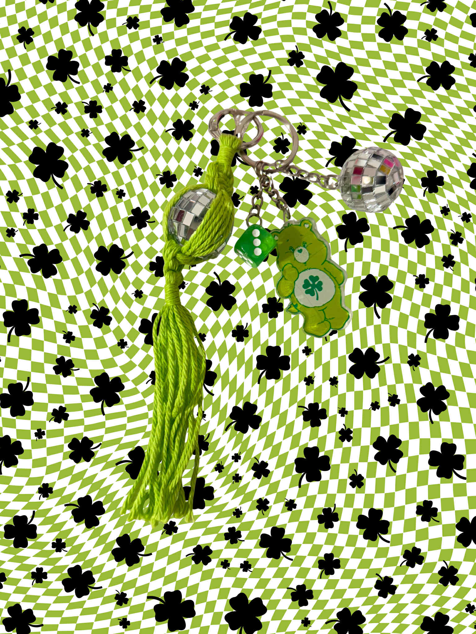 Good luck bear macrame keychain, braided with green colored macrame rope, a disco ball keychain and a good luck bear care bear keychain, and the added touch disco ball! Sparkle up your keys, purse, backpack, gym bag, etc. with this whimsical, fun keychain! This cute and trendy accessory is bound to add a fun touch to your everyday accessories.