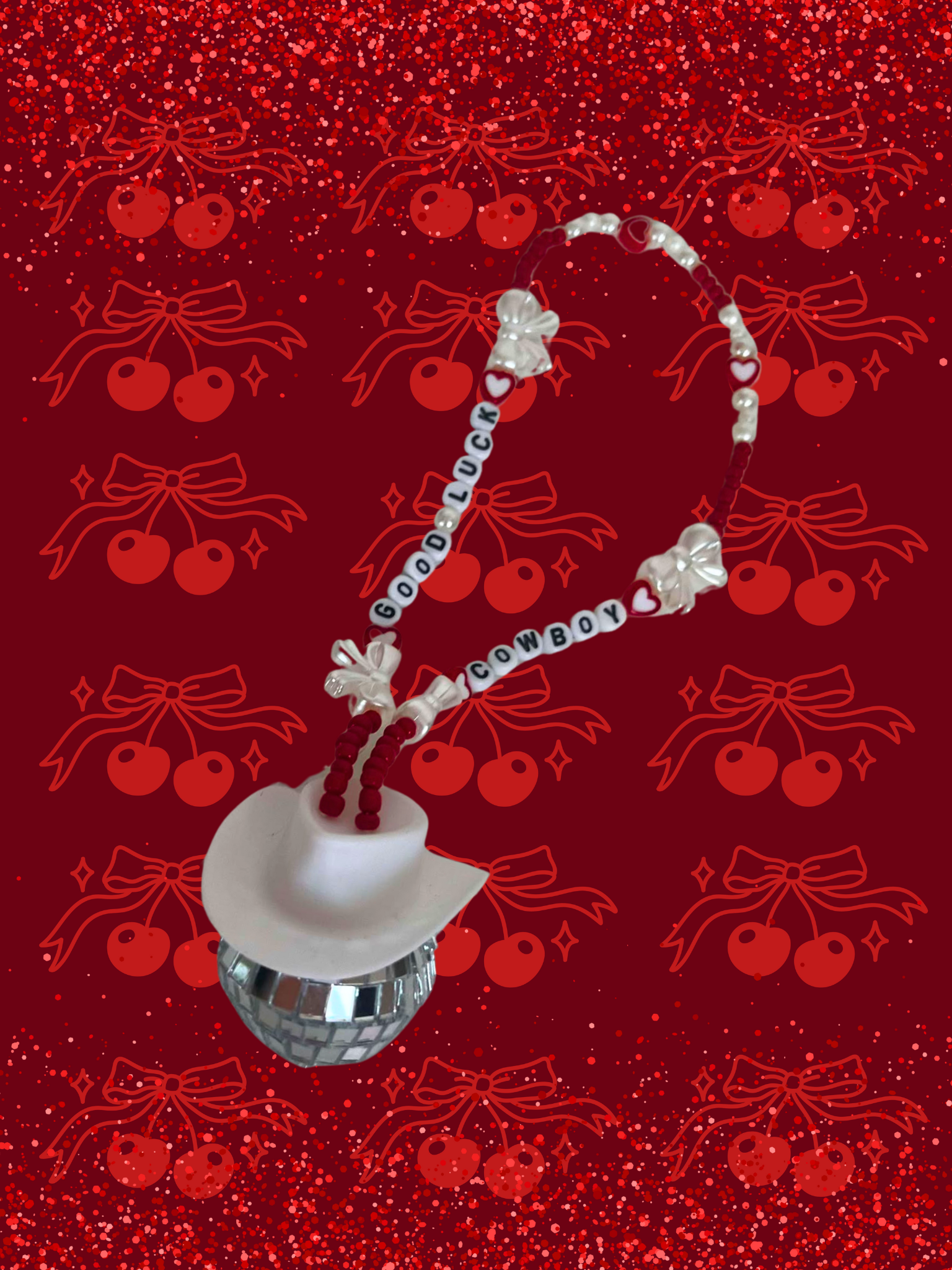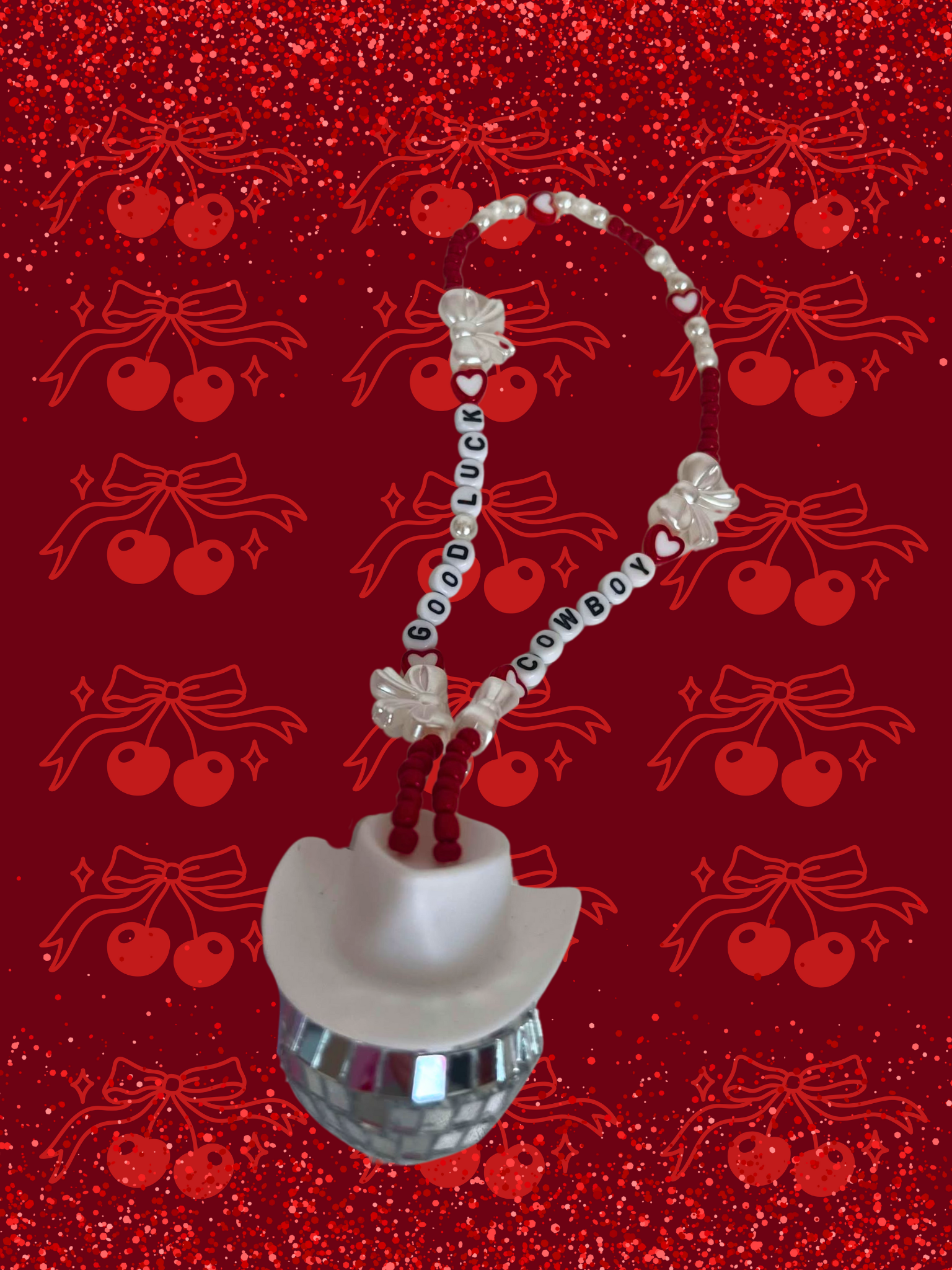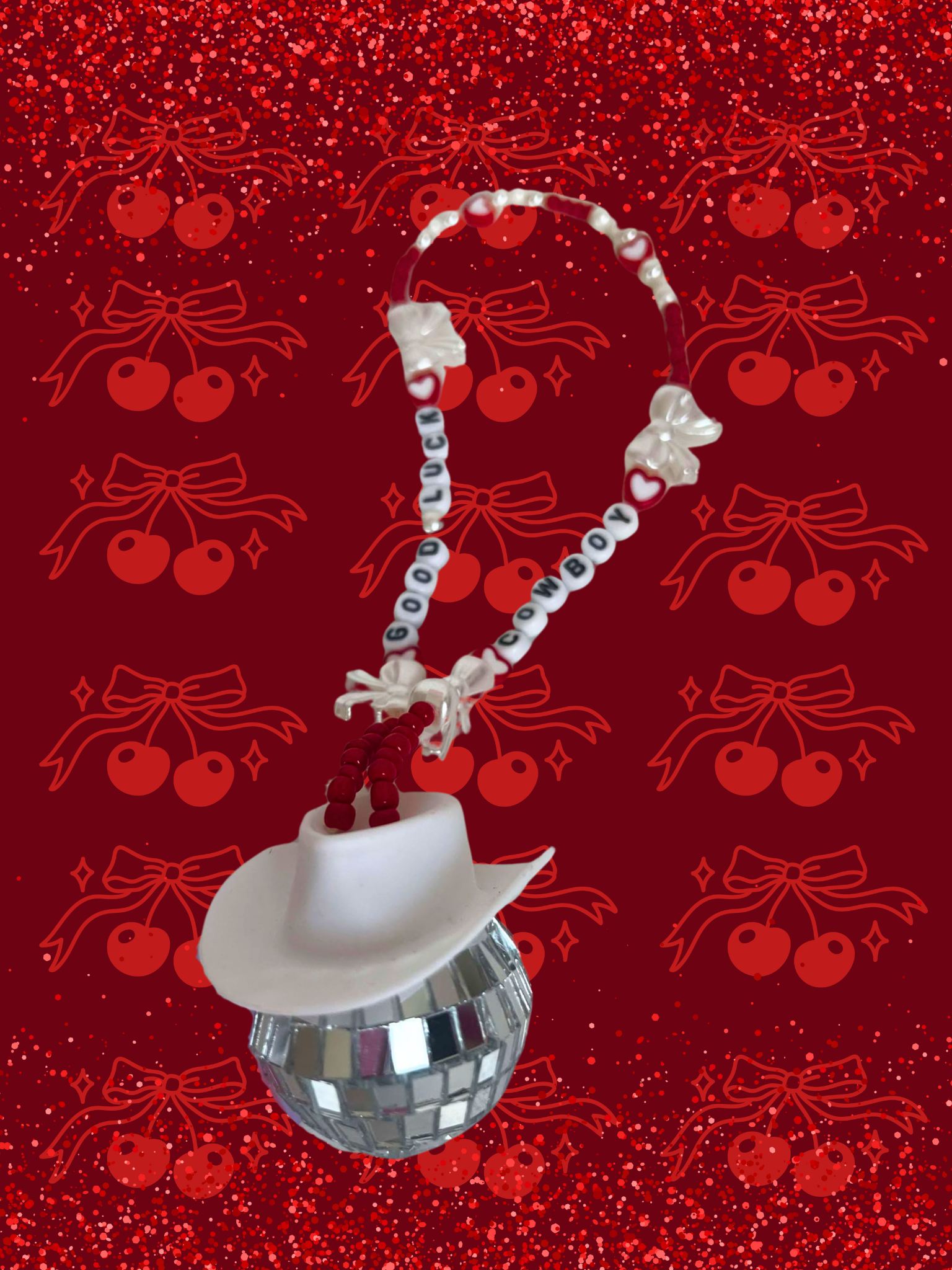 Good Luck Cowboy rearview mirror charm, colored with red and white, and the added touch white cowgirl hat! Sparkle up your car with this whimsical, out of this world rearview mirror charm! This cute and trendy accessory is bound to add a fun touch to your car.