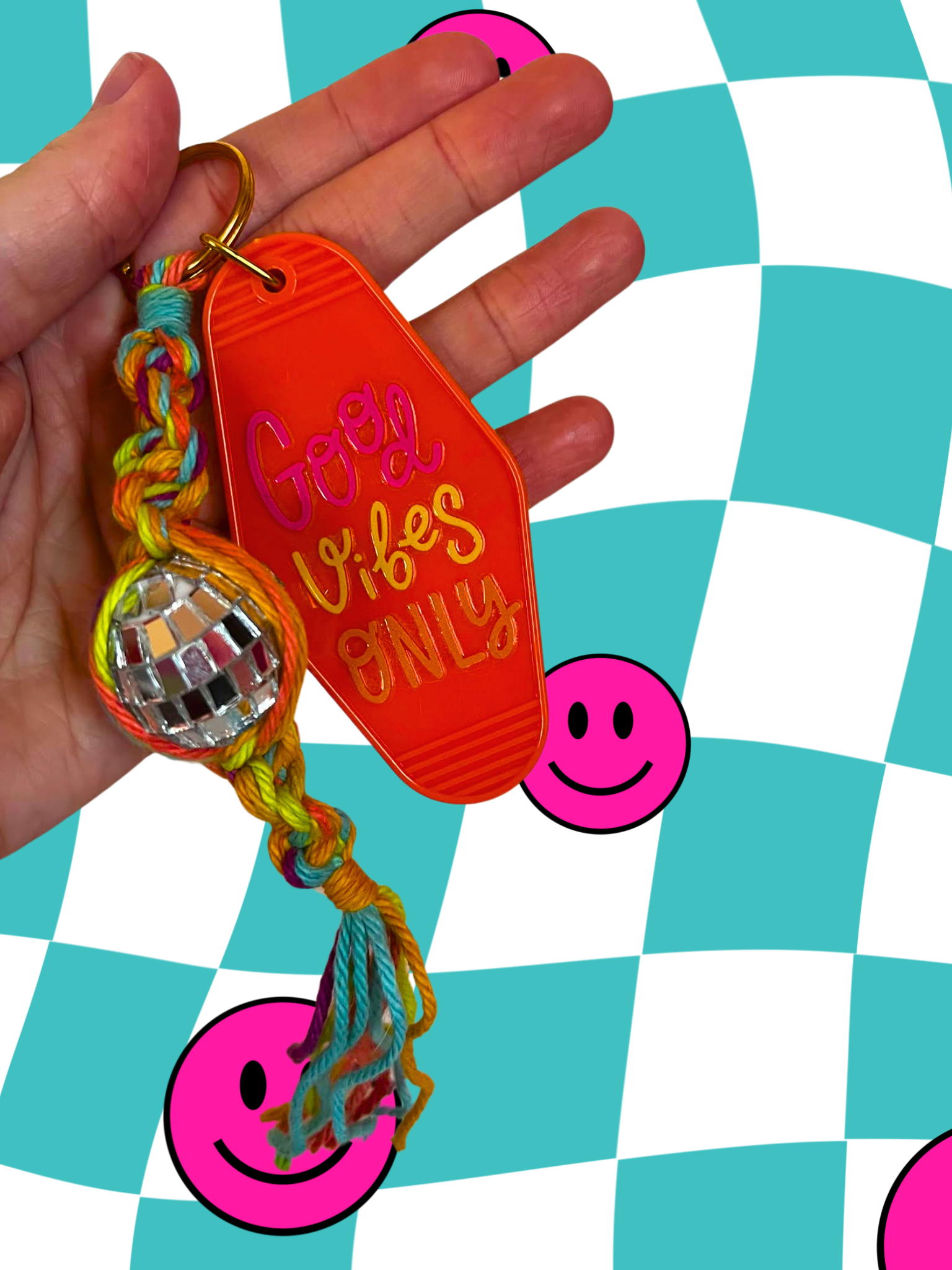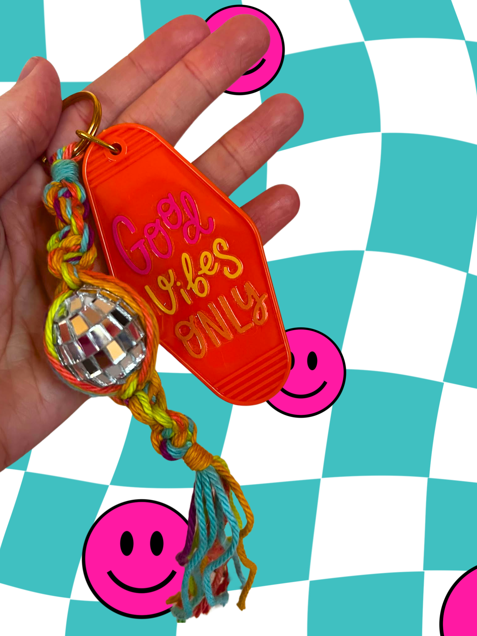 Good vibes only macrame keychain, braided with blue, purple, green, pink and orange colored rope, and the added touch disco ball! Sparkle up your keys, purse, backpack, gym bag, etc. with this whimsical, fun keychain! This cute and trendy accessory is bound to add a fun touch to your everyday accessories.