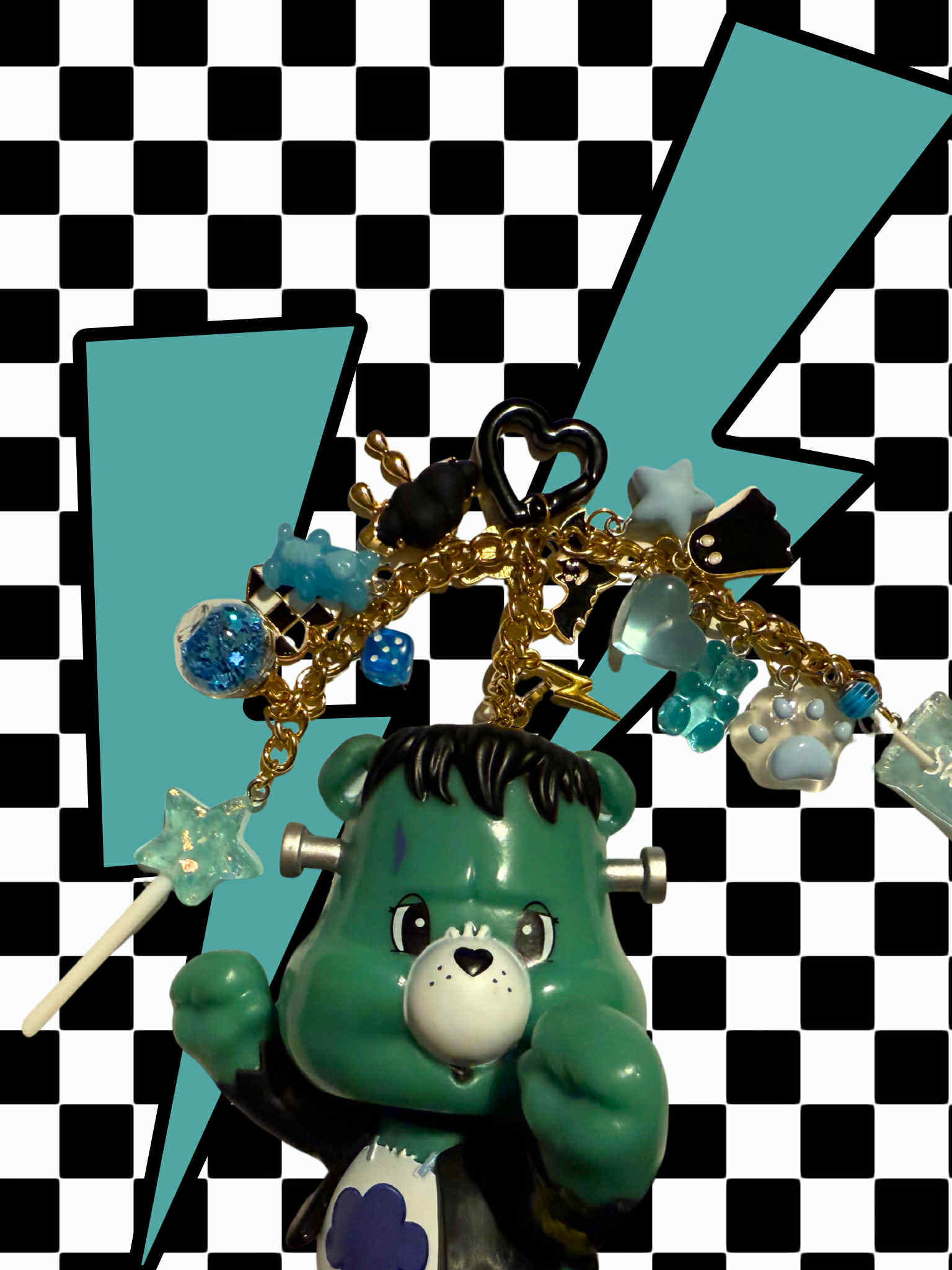 Carebears x Universal Monsters Grumpy Bear as Frankenstein bobblehead keychain, hand made into the coolest, cutest, grooviest keychain. Added is additional O-chains in gold, varied in different lengths, as well as many different charms included along the chains to match and make your figure standout. Added chains have been soldered to ensure hold on keychain.