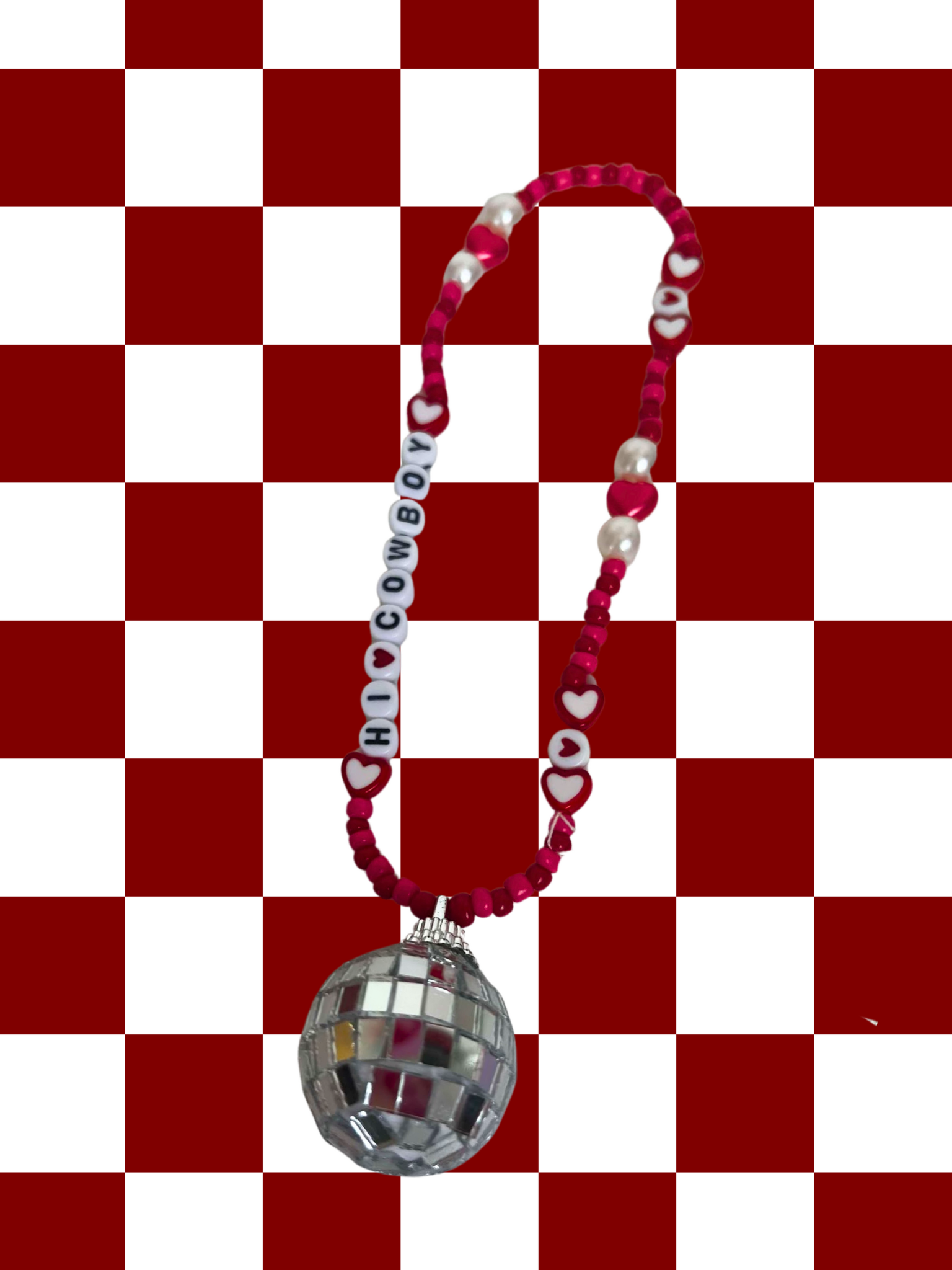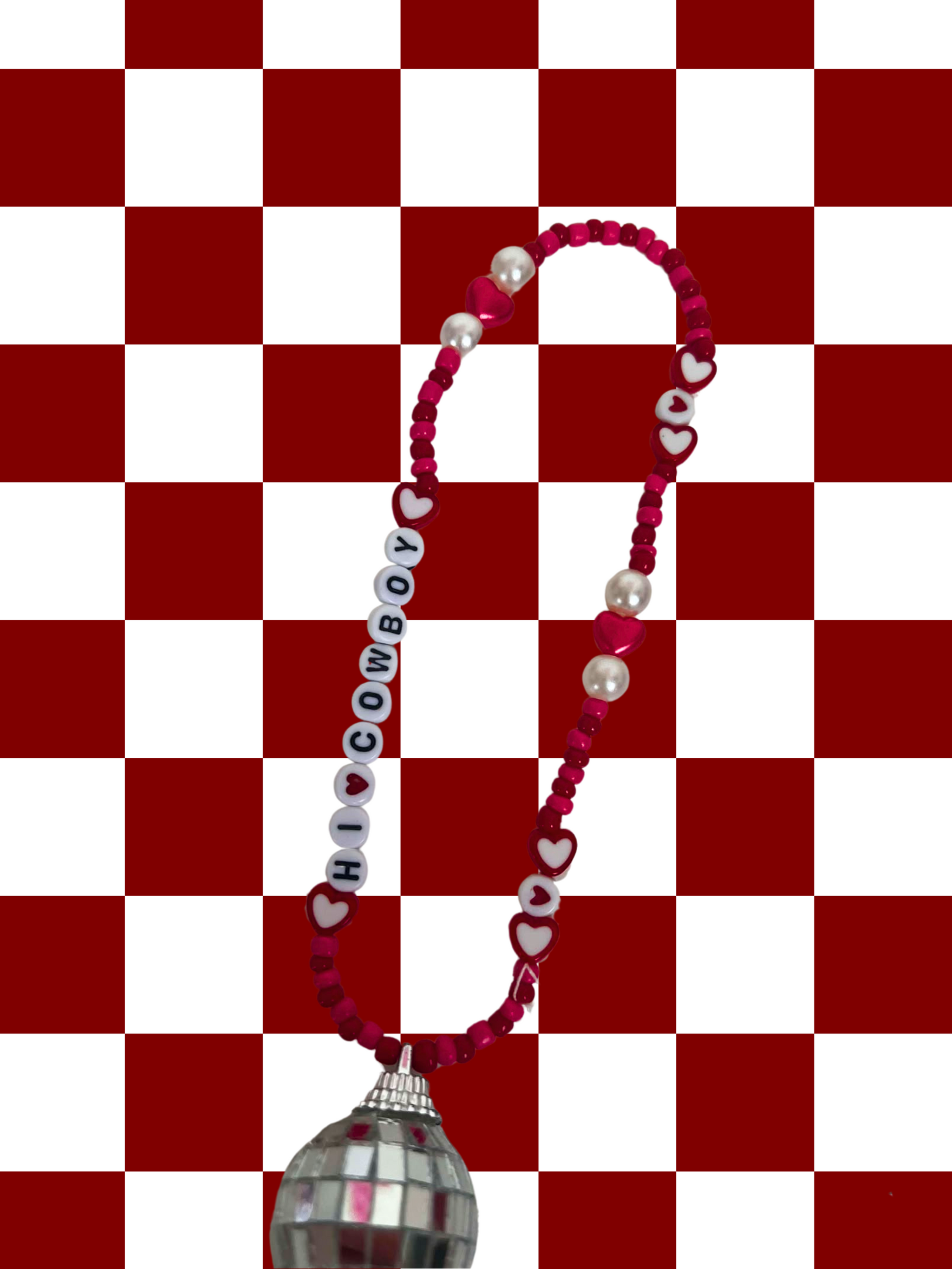 Hi cowboy rearview mirror charm, colored with red, pink and white, and the added touch disco ball! Sparkle up your car with this whimsical, out of this world rearview mirror charm! This cute and trendy accessory is bound to add a fun touch to your car.