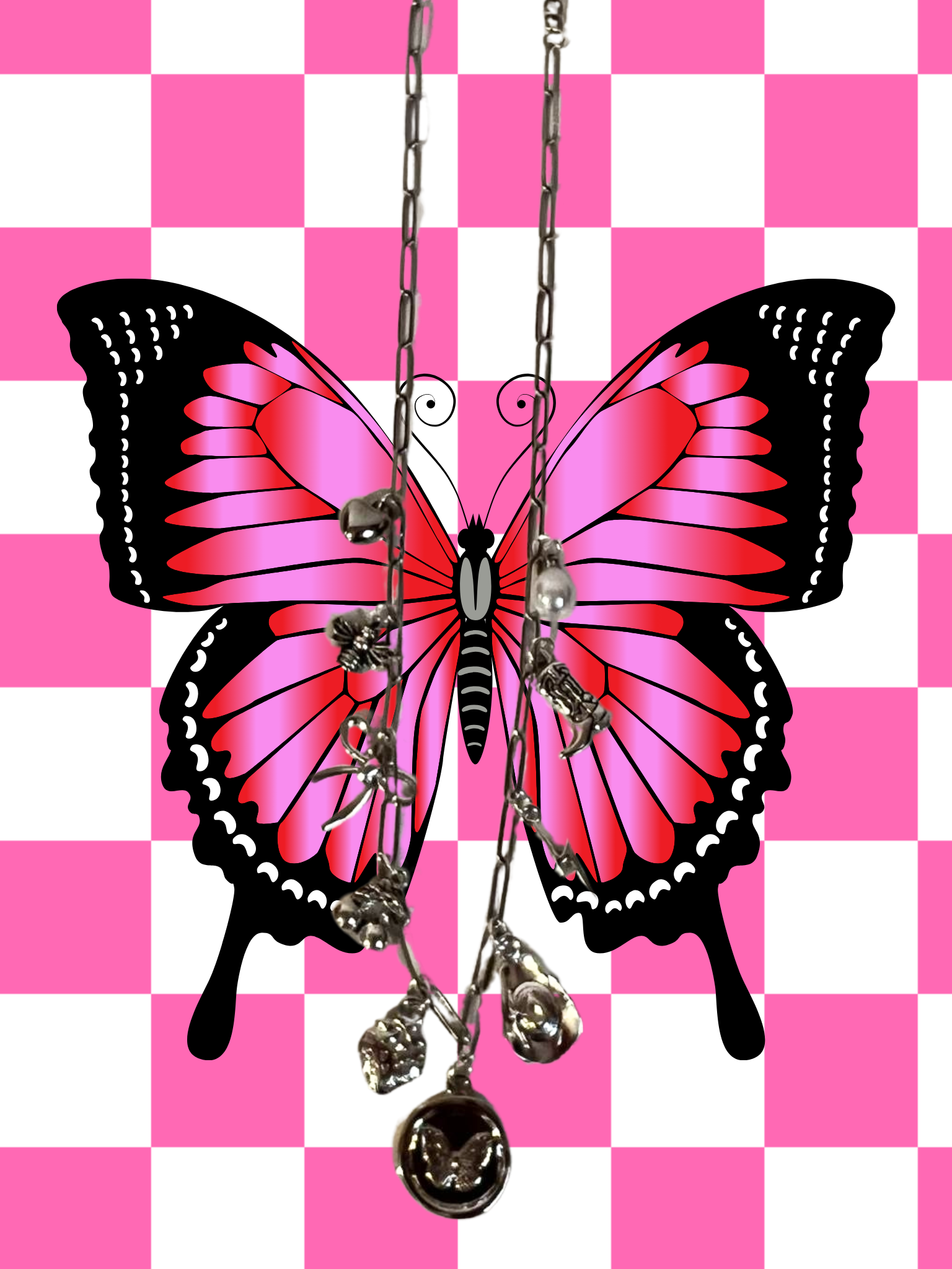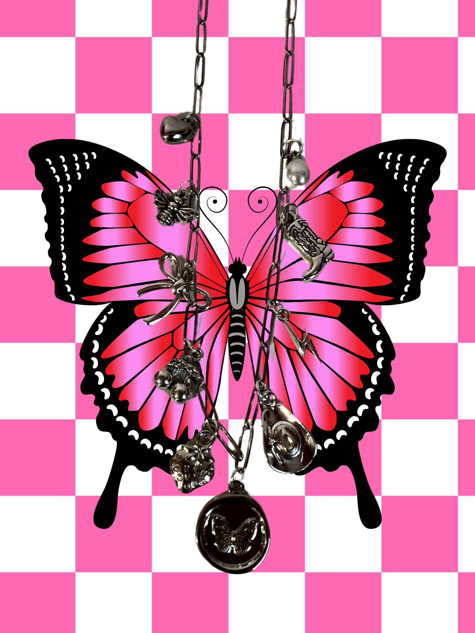 Honey honey charm necklace, silver stainless steel paperclip chain, 15 inches in length, tail chain added for extra comfort fit, charms included in this statement necklace are a heart, bee, bow, cherries, strawberry, butterfly, cowgirl hat, lightning bolt, cowgirl boot and pearl charm. Show out your everyday accessories with this unapologetic statement piece. Sure to bring a cool, bold, and groovy vibe to your everyday clothing wear!Ā