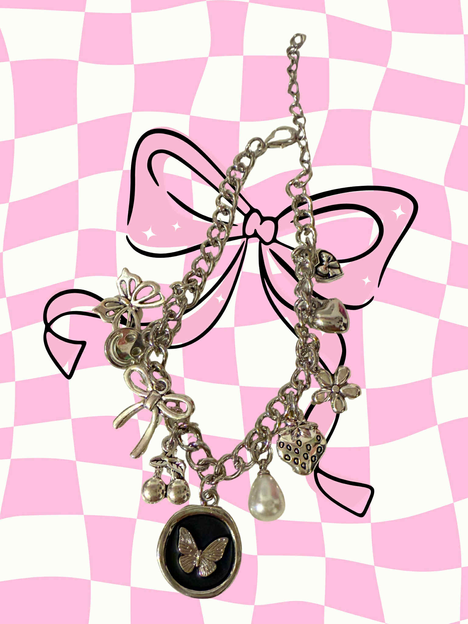 Just a girl charm bracelet, silver stainless steel o-chain, 7 inches in length, tail chain added for extra comfort fit, charms included in this statement bracelet are a butterfly, smiley face, bow, cherries, butterfly pendant, pearl, strawberry, flower, heart, and a heart with a bow charm. Show out your everyday accessories with this unapologetic statement piece. Sure to bring a cool, bold, and groovy vibe to your everyday clothing wear!Ā