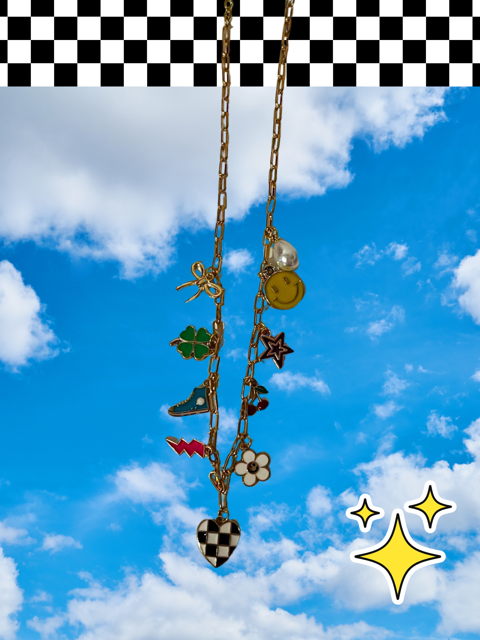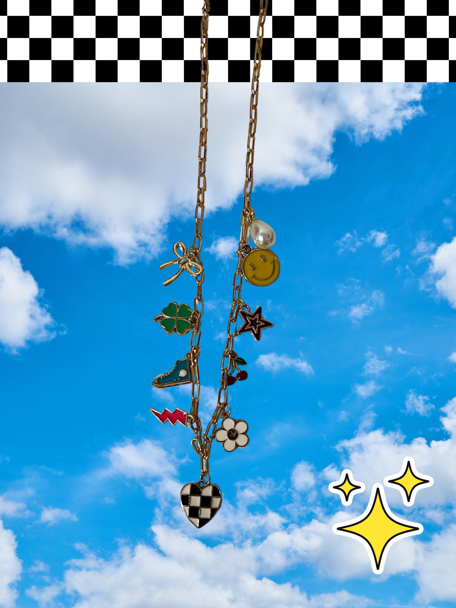 Just a girl charm necklace, gold stainless steel paperclip chain, 16 inches in length, tail chain added for extra comfort fit, charms included in this statement necklace are a bow, four leaf clover, blue converse, pink lightning bolt, checkered heart, flower smiley face, cherries, purple star, yellow smiley face and pearl. Show out your everyday accessories with this unapologetic statement piece. Sure to bring a cool, bold, and groovy vibe to your everyday clothing wear!Ā