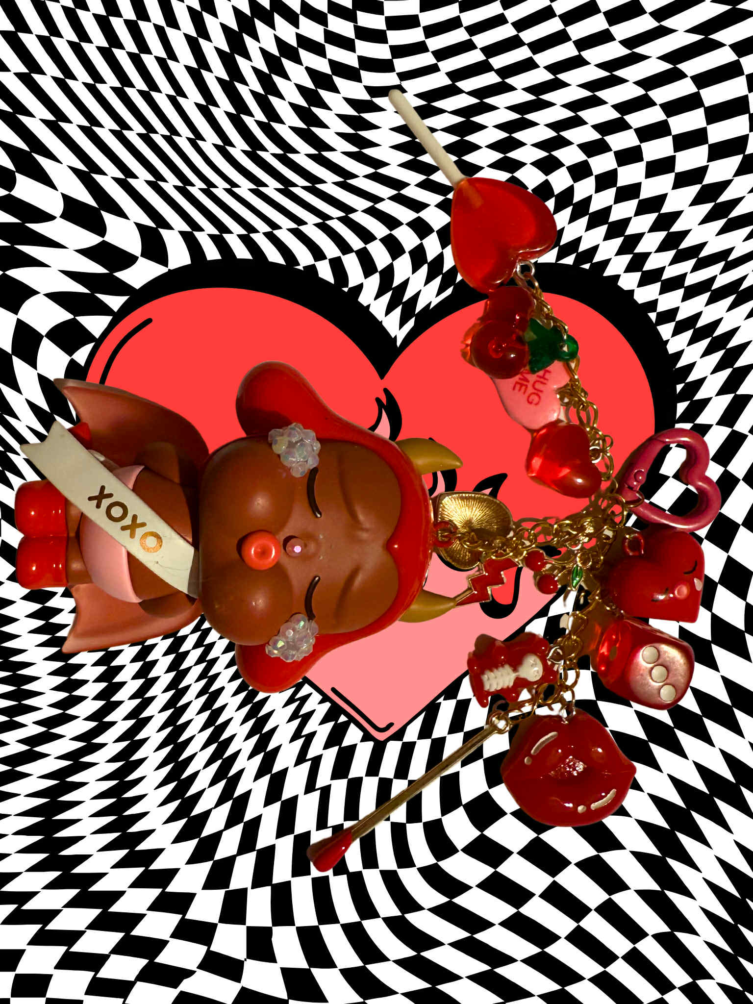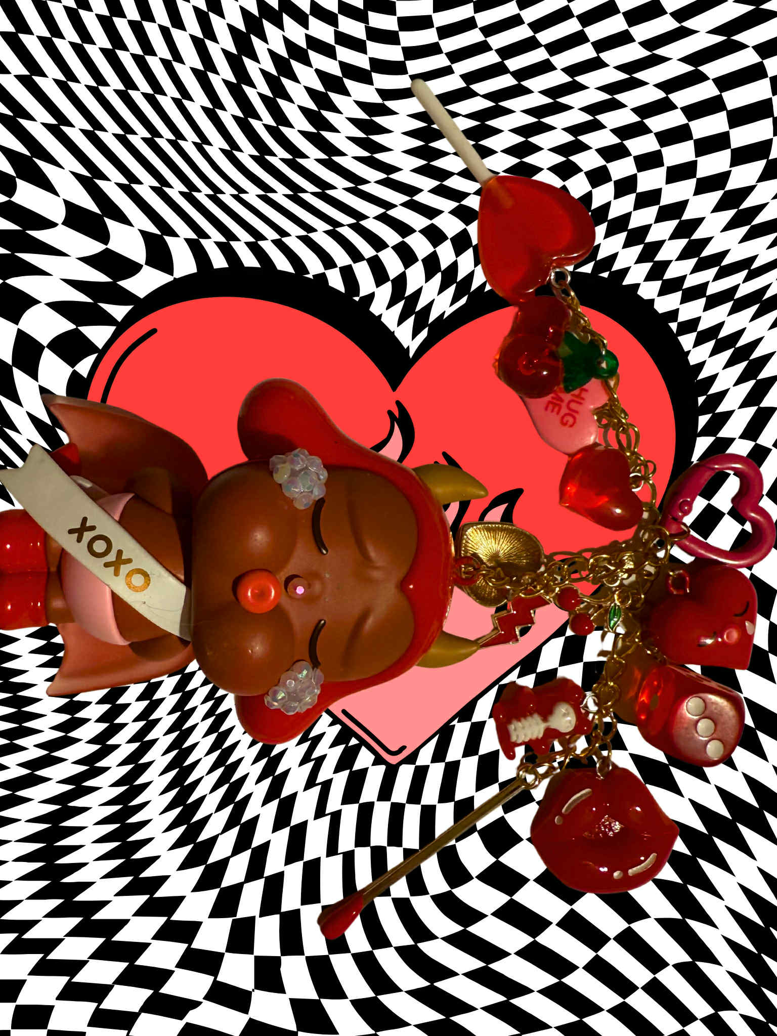 Kiss Kiss- Devil Vers. crybaby crying for love keychain, hand made into the sparkliest, cutest, grooviest keychain. Added sparkles on her tears and nose as pictured above. Added is three additional O-chains in gold, varied in different lengths, there are many charms included along the chains to match and make your figure standout. Added chains have been soldered to ensure hold on keychain. All figurines/plushies are 100% authentic and will come with original box and included card, among other varied accessories if necessary if available.