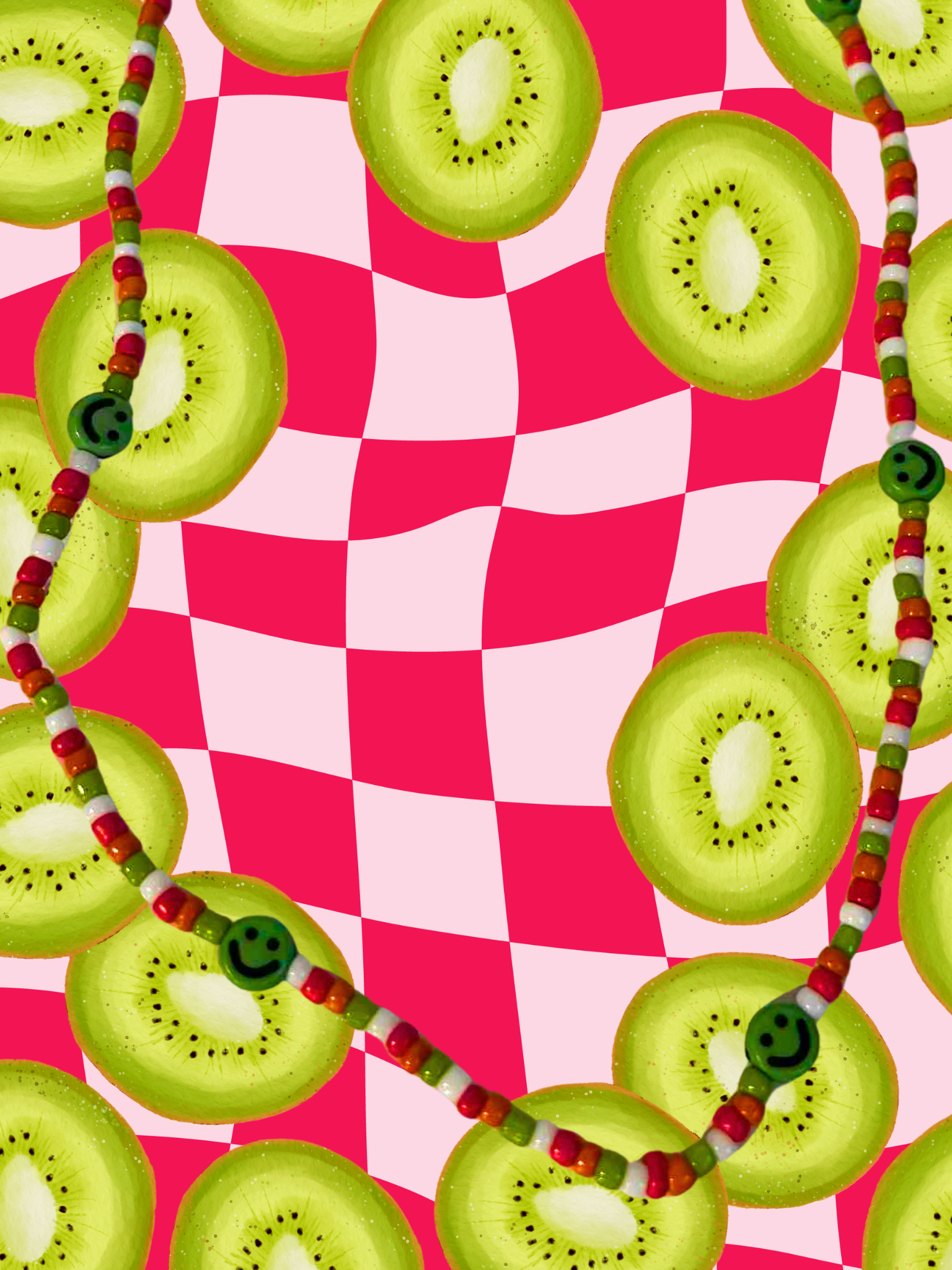 Kiwi Dreaming beaded necklace, threaded with orange, pink, white and green beads and the added green smiley face beads! Sparkle up your everyday accessories with this fun statement piece. Sure to bring a funky, colorful, fun vibe to your everyday clothing wear! Threaded with stretchy elastic string, length is 16 inches.