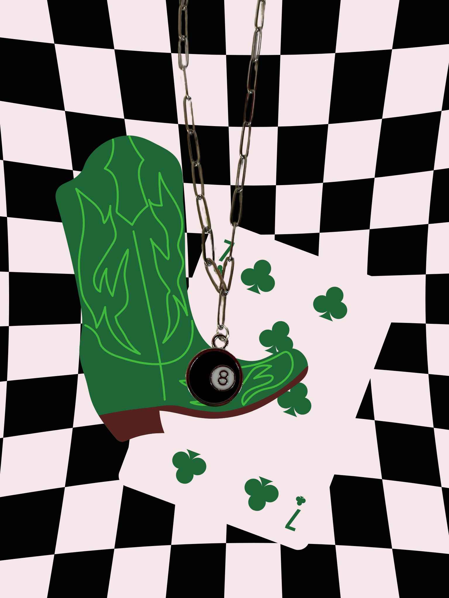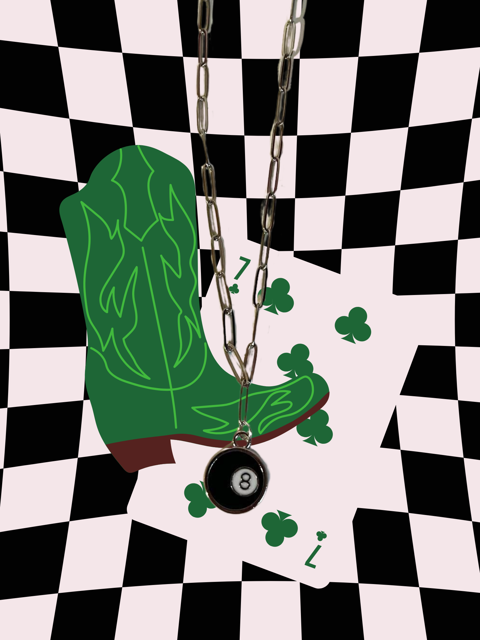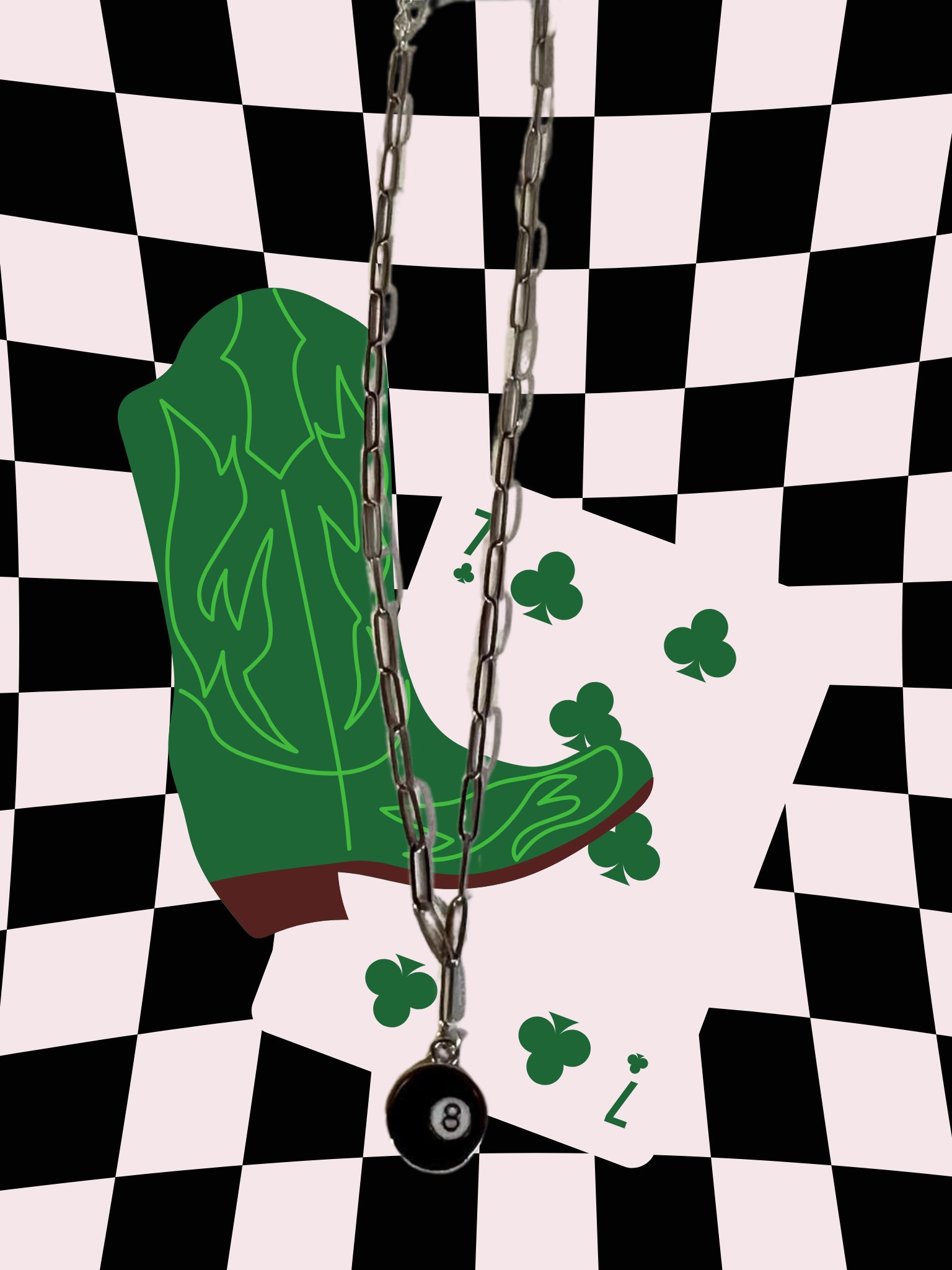 Lady luck charm necklace, silver stainless steel paperclip chain, 14 inches in length, tail chain added for extra comfort fit, charms included in this statement necklace are only an eightball charm. Show out your everyday accessories with this unapologetic statement piece. Sure to bring a cool, bold, and groovy vibe to your everyday clothing wear!Ā