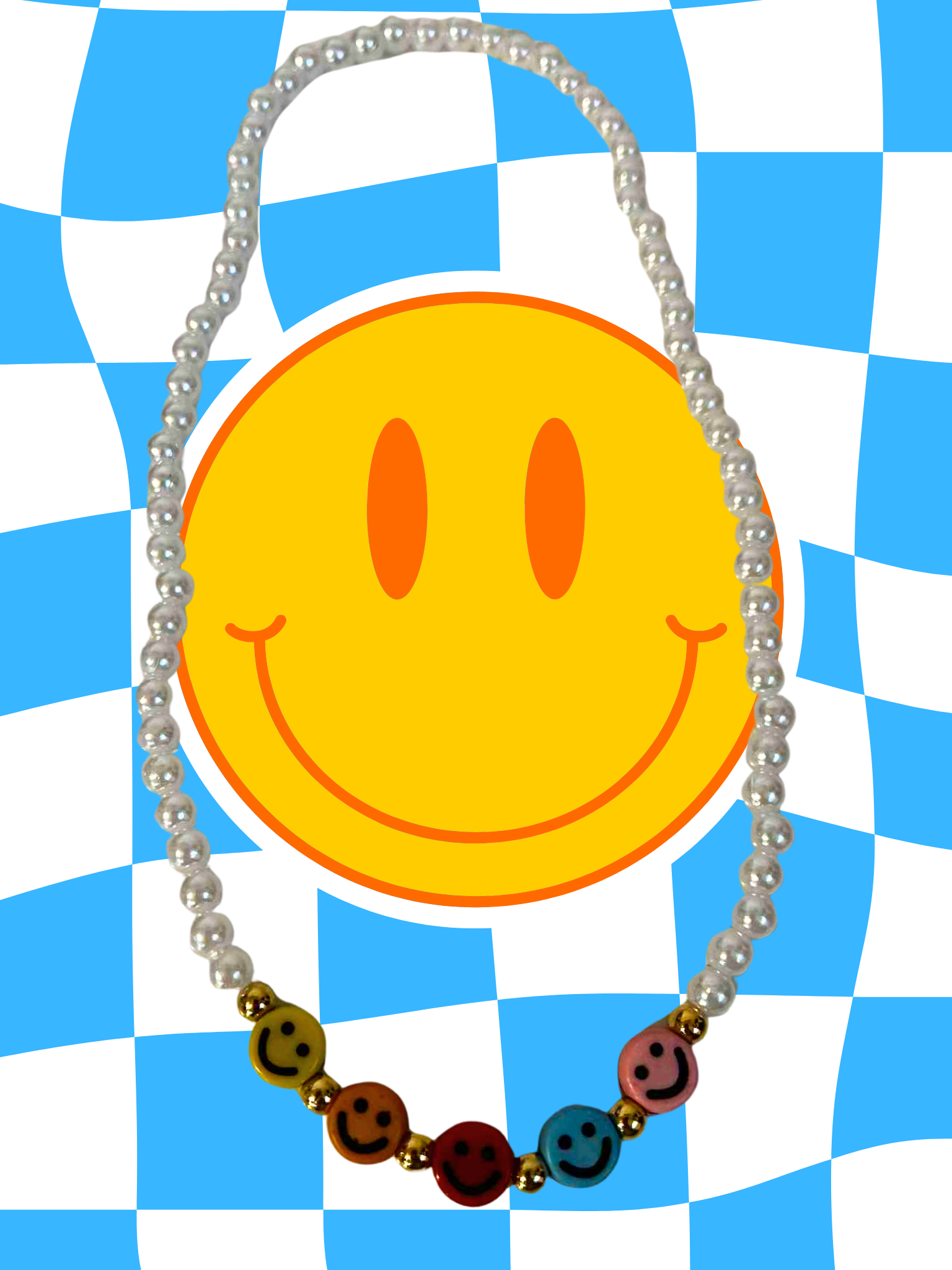 Life is Weird beaded necklace, threaded with pearls, gold beads, and an assortment of rainbow-colored smiley face beads! Sparkle up your everyday accessories with this fun statement piece. Sure to bring a funky, colorful, fun vibe to your everyday clothing wear! Threaded with stretchy elastic string, length is 16 inches.