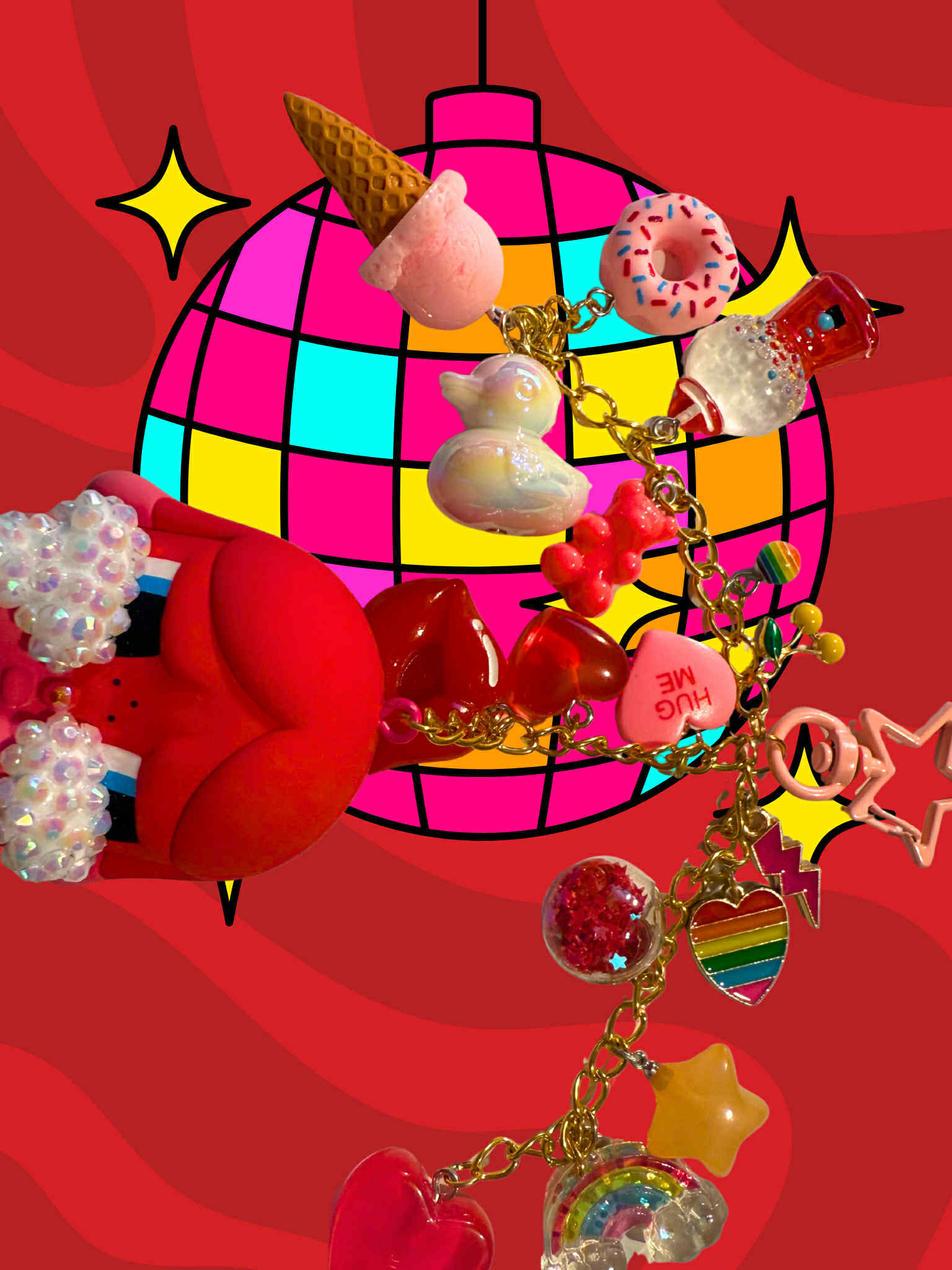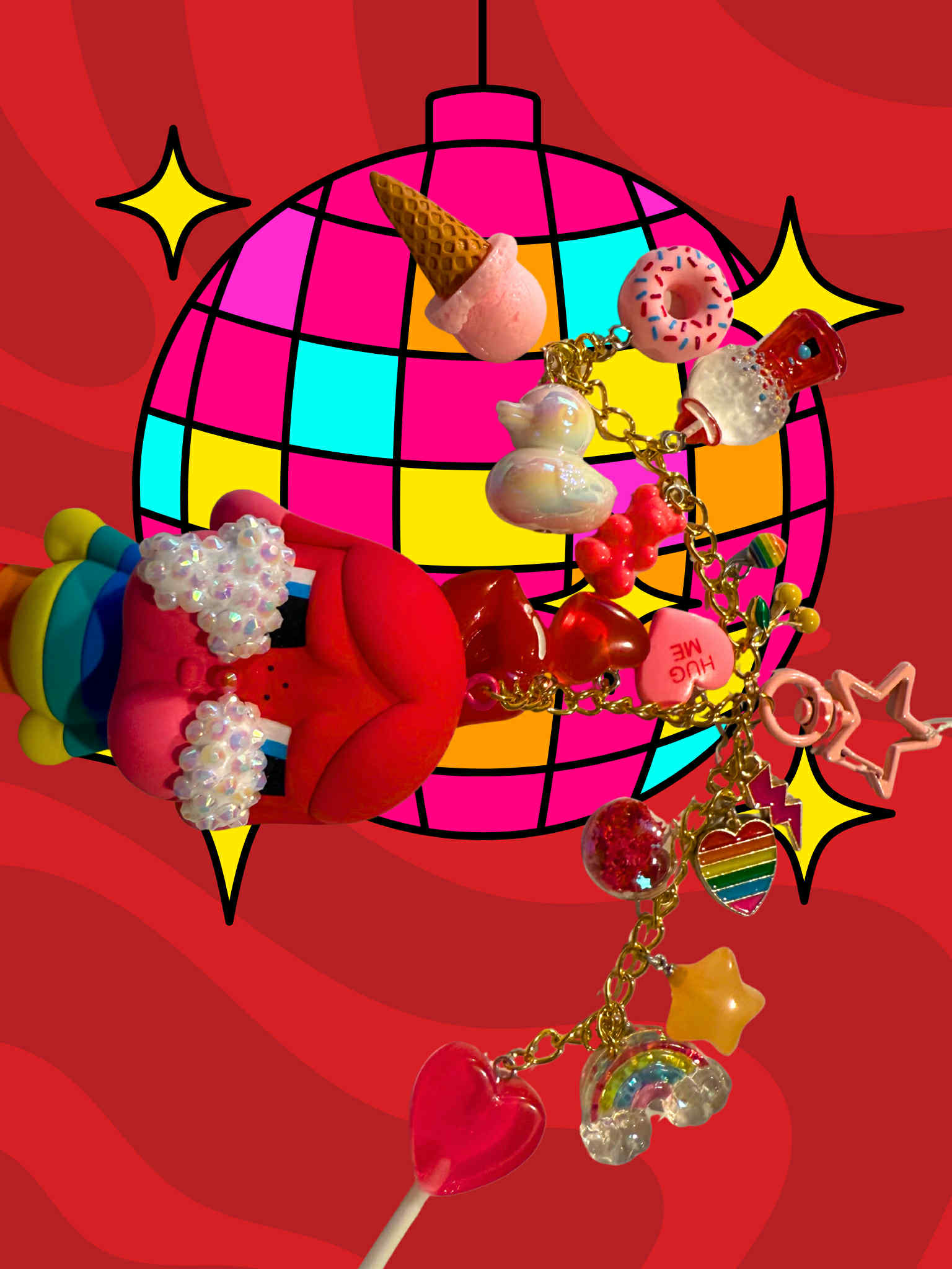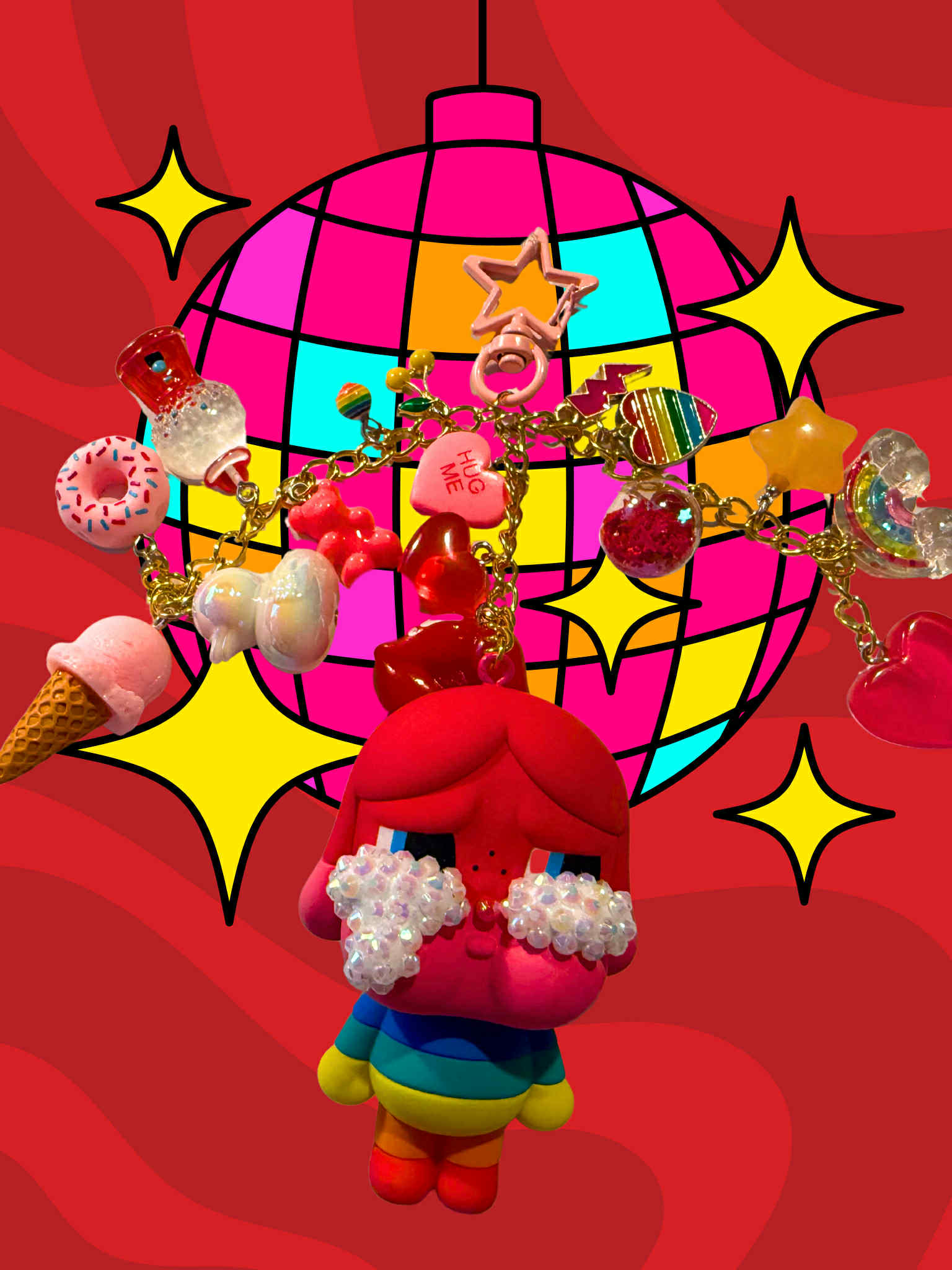 Love is love crying again crybaby keychain, hand made into the sparkliest, cutest, grooviest keychain. Added sparkles on her tears as pictured above. Added is three additional O-chains in gold, varied in different lengths, there are many charms included along the chains to match and make your figure standout. Added chains have been soldered to ensure hold on keychain. All figurines/plushies are 100% authentic and will come with original box and included card, among other varied accessories if necessary.