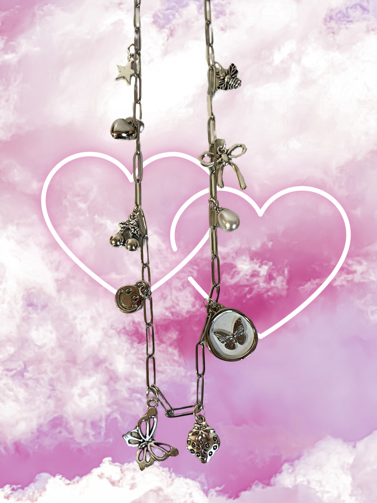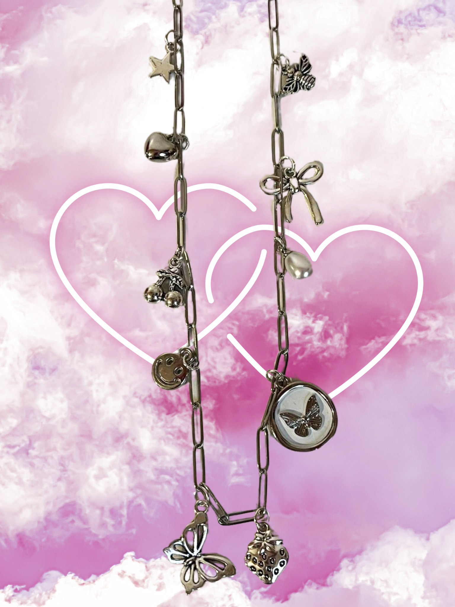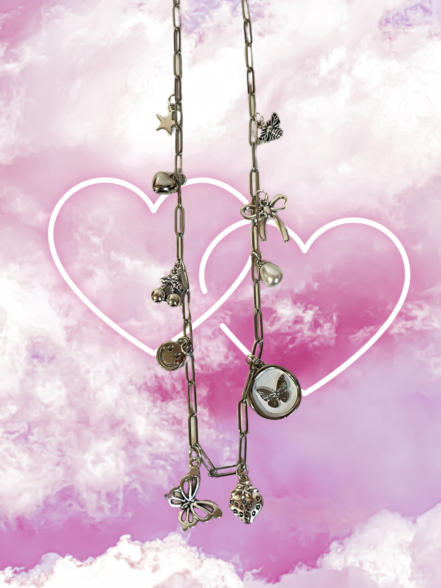 Lover charm necklace, silver stainless steel paperclip chain, 15 inches in length, tail chain added for extra comfort fit, charms included in this statement necklace are a star, heart, cherries, smiley face, butterfly, strawberry, butterfly, pearl, bow and bee charm. Show out your everyday accessories with this unapologetic statement piece. Sure to bring a cool, bold, and groovy vibe to your everyday clothing wear!Ā