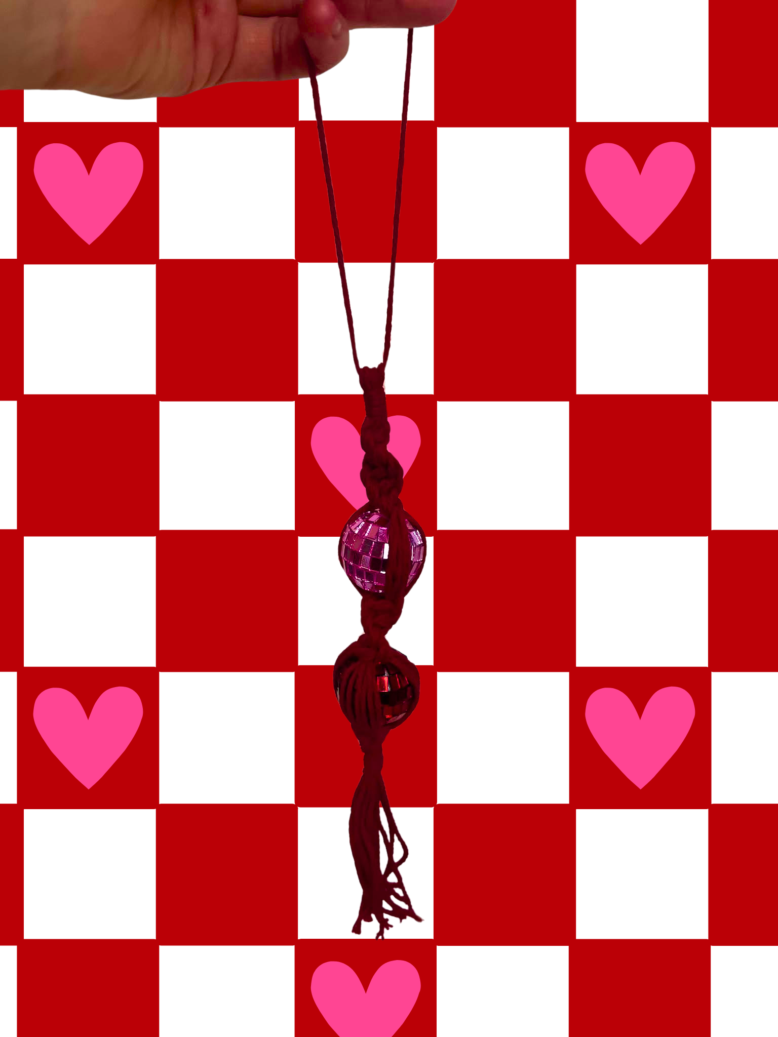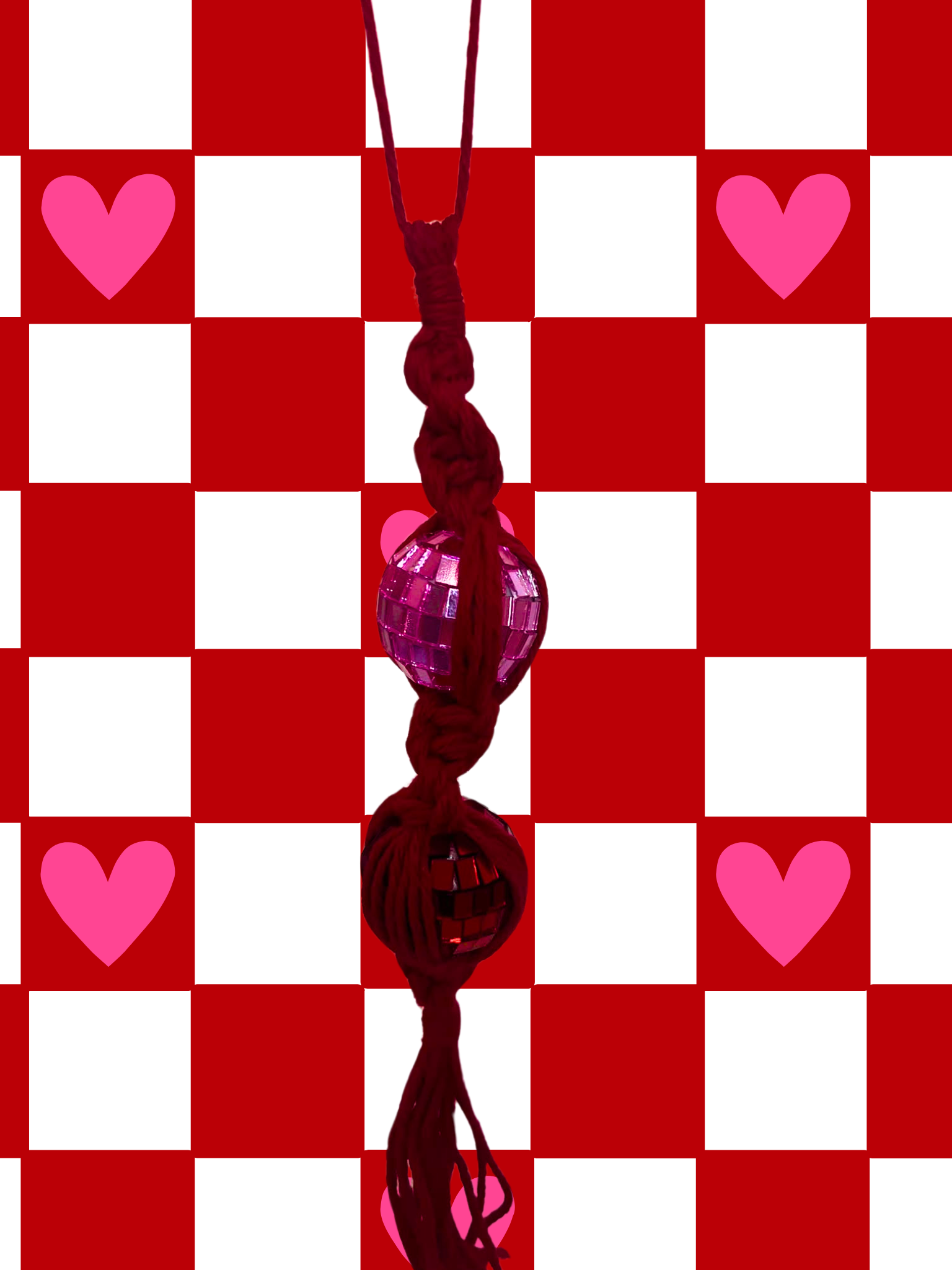 Lover girl macrame rearview mirror charm, braided with red colored rope, and the added touch double pink and red disco balls! Sparkle up your car with this whimsical, out of this world rearview mirror charm! This cute and trendy accessory is bound to add a fun touch to your car.