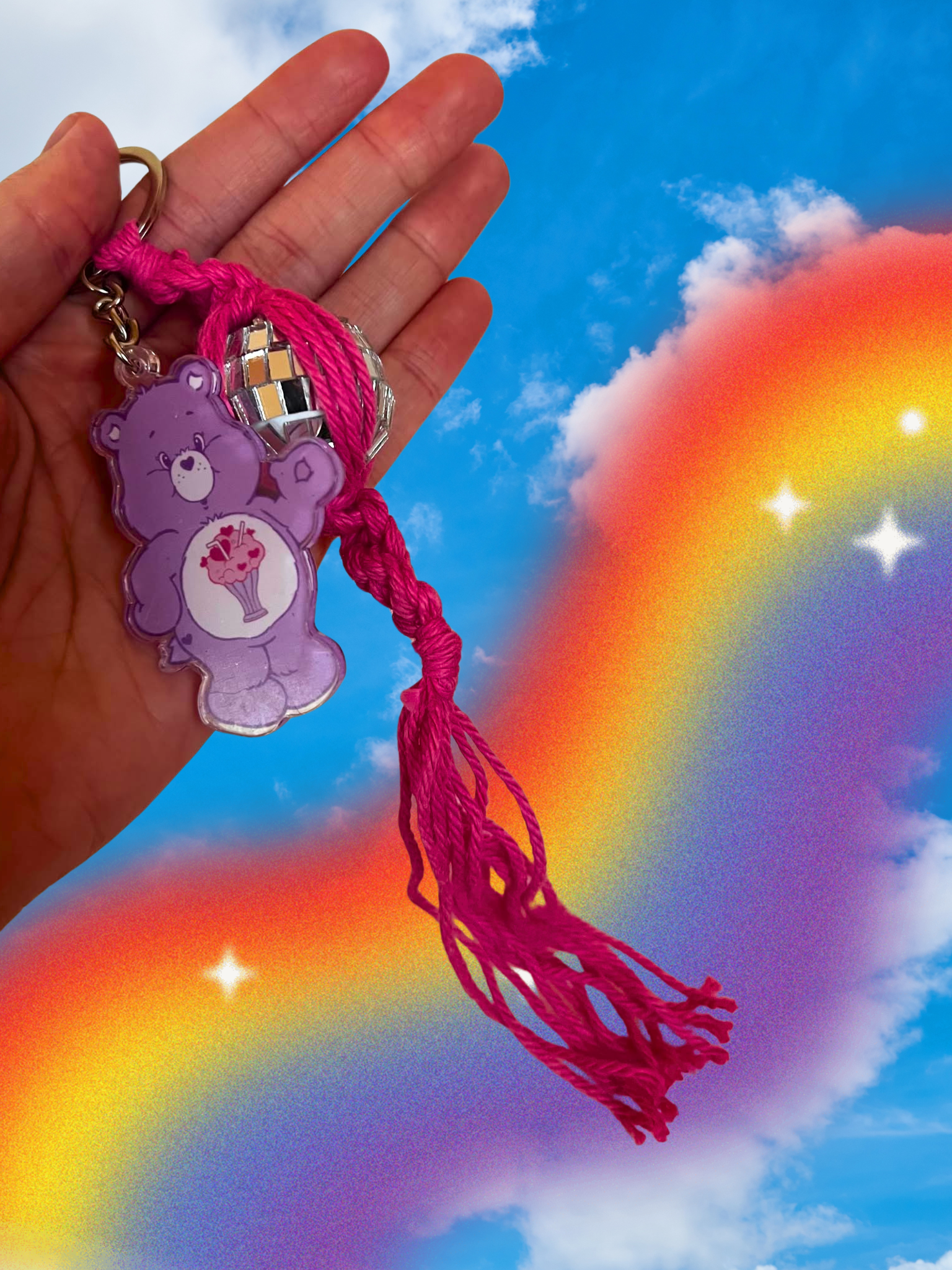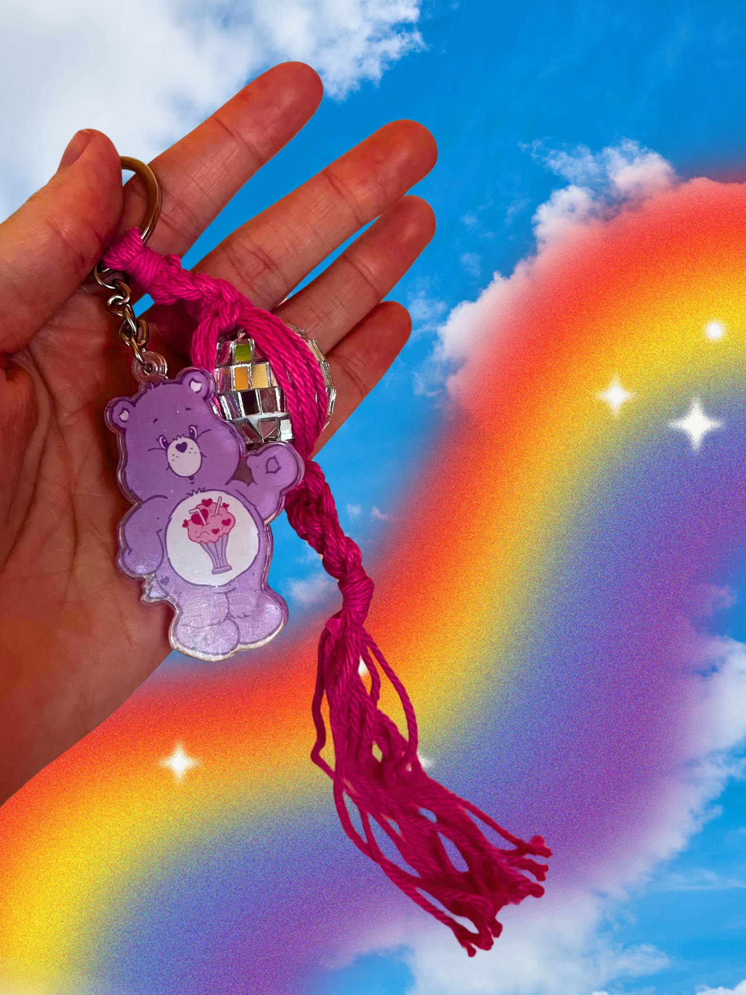 Loverr carebear macrame keychain, braided with pink colored rope, and the added touch disco ball! Sparkle up your keys, purse, backpack, gym bag, etc. with this whimsical, fun keychain! This cute and trendy accessory is bound to add a fun touch to your everyday accessories.