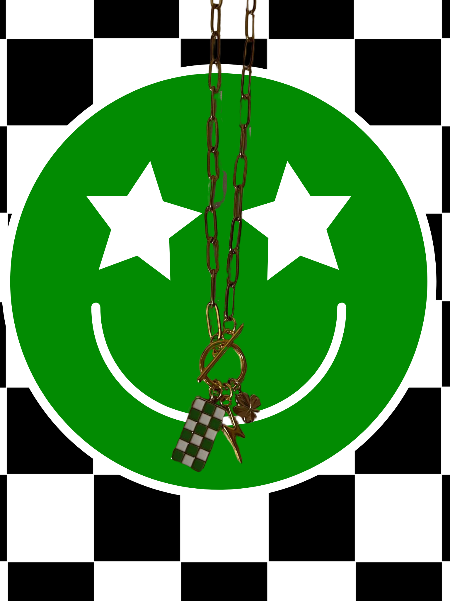 Lucky lucky girl charm necklace, gold stainless steel paperclip chain, 14 inches in length, toggle clasp, charms included in this statement necklace are a green checkered piece, lightning bolt and four leaf clover charm. Show out your everyday accessories with this unapologetic statement piece. Sure to bring a cool, bold, and groovy vibe to your everyday clothing wear!Ā