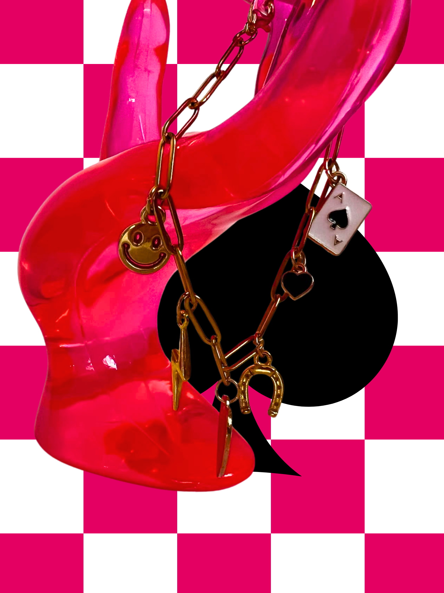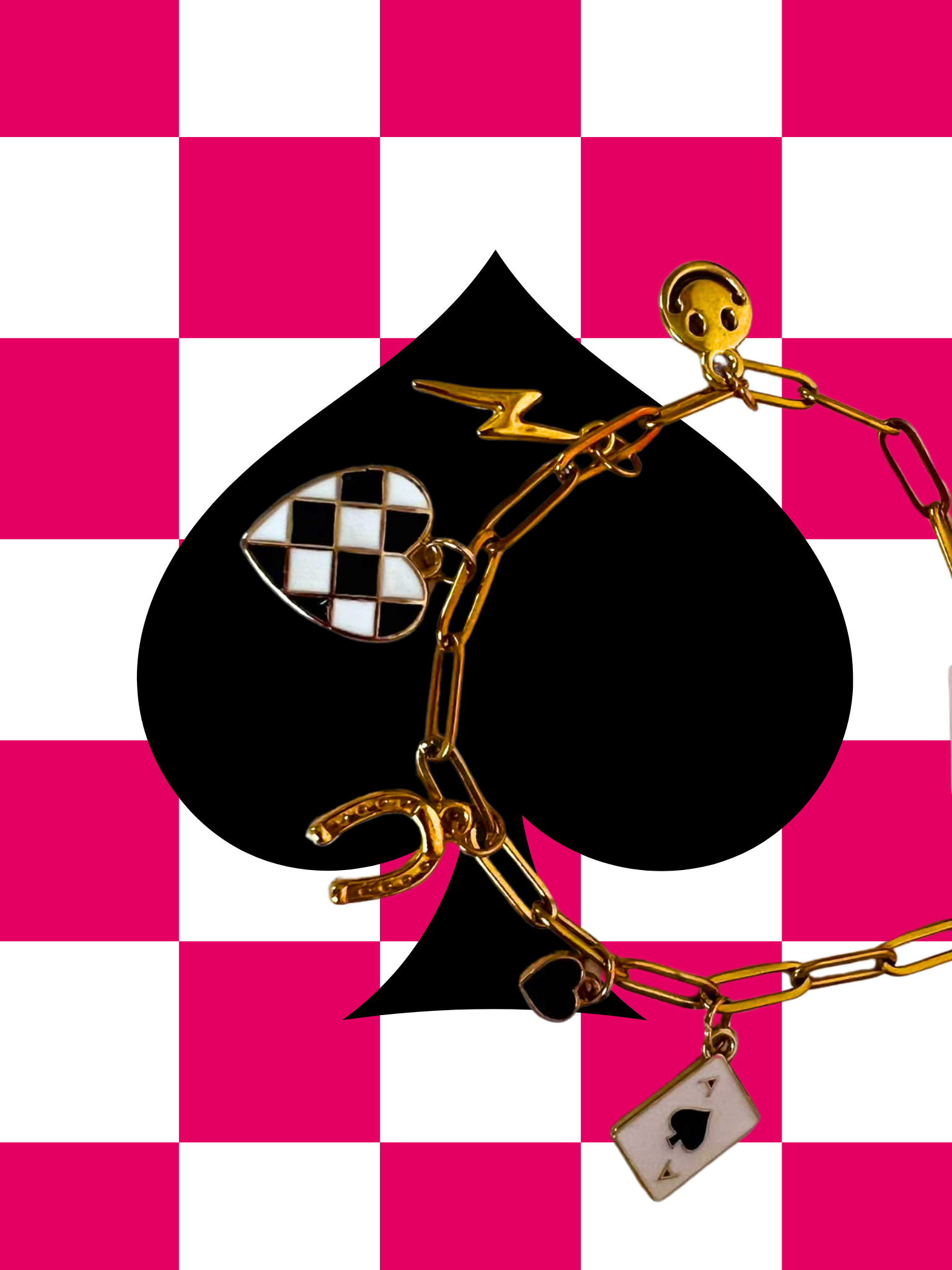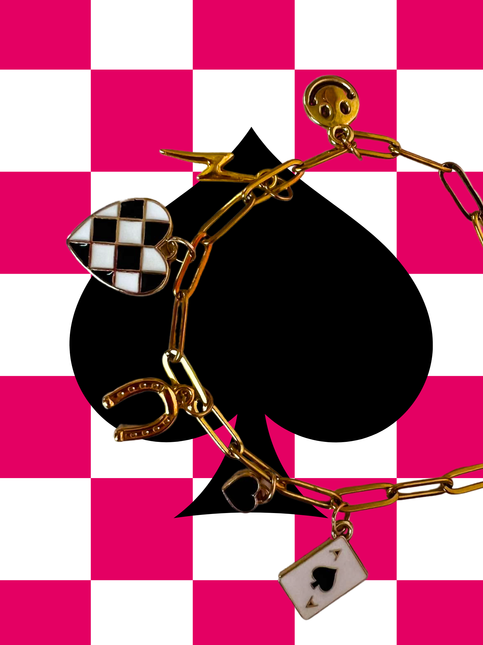Lucky nights charm bracelet, gold stainless steel paperclip chain, 7 inches in length, charms included in this statement bracelet are a smiley face, lightning bolt, checkered heart, horseshoe, black heart and ace of spades card charm. Show out your everyday accessories with this unapologetic statement piece. Sure to bring a cool, bold, and groovy vibe to your everyday clothing wear!Ā