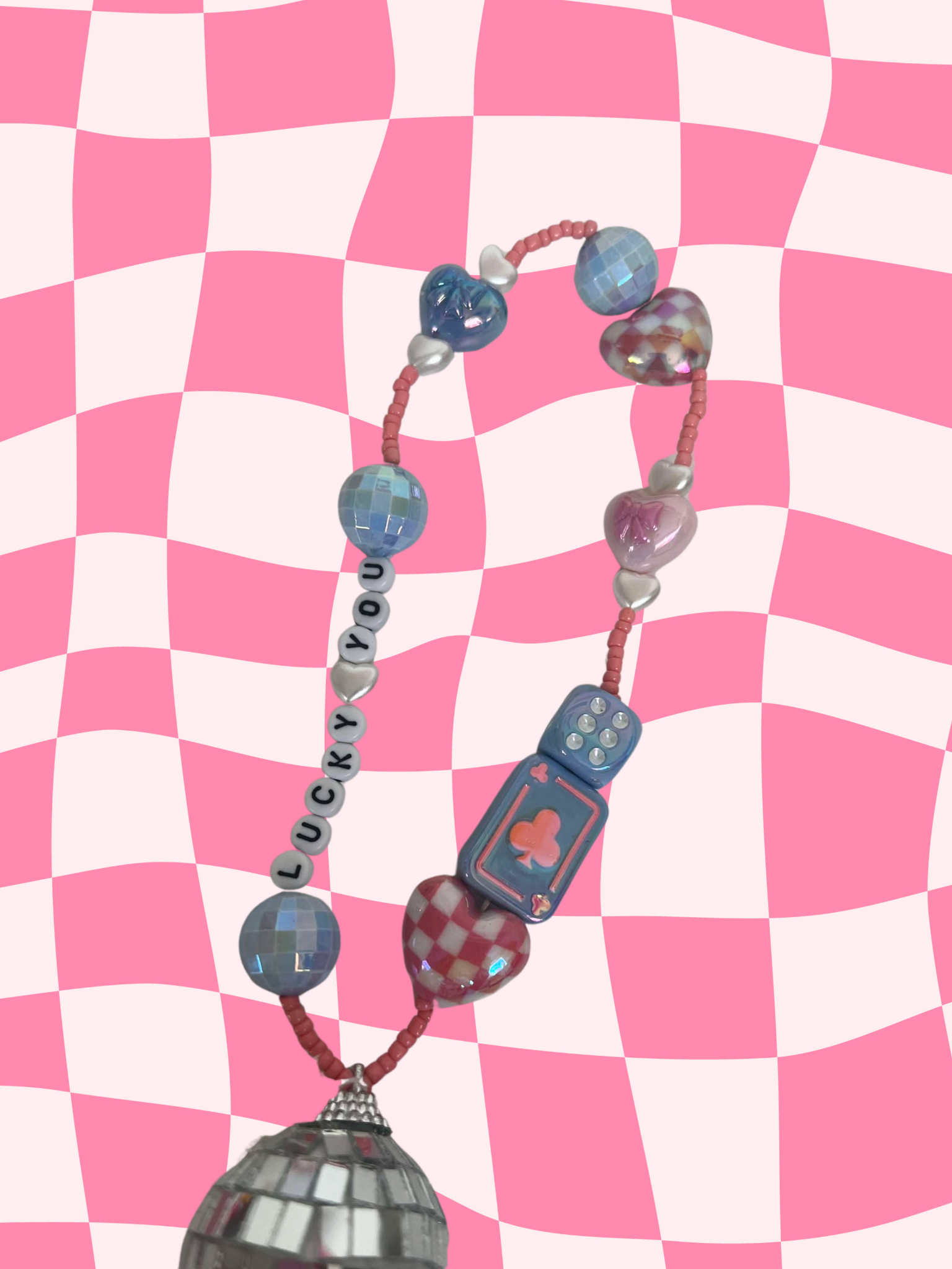 Lucky you rearview mirror charm, colored with blue, pink and white, and the added touch disco ball! Sparkle up your car with this whimsical, out of this world rearview mirror charm! This cute and trendy accessory is bound to add a fun touch to your car.