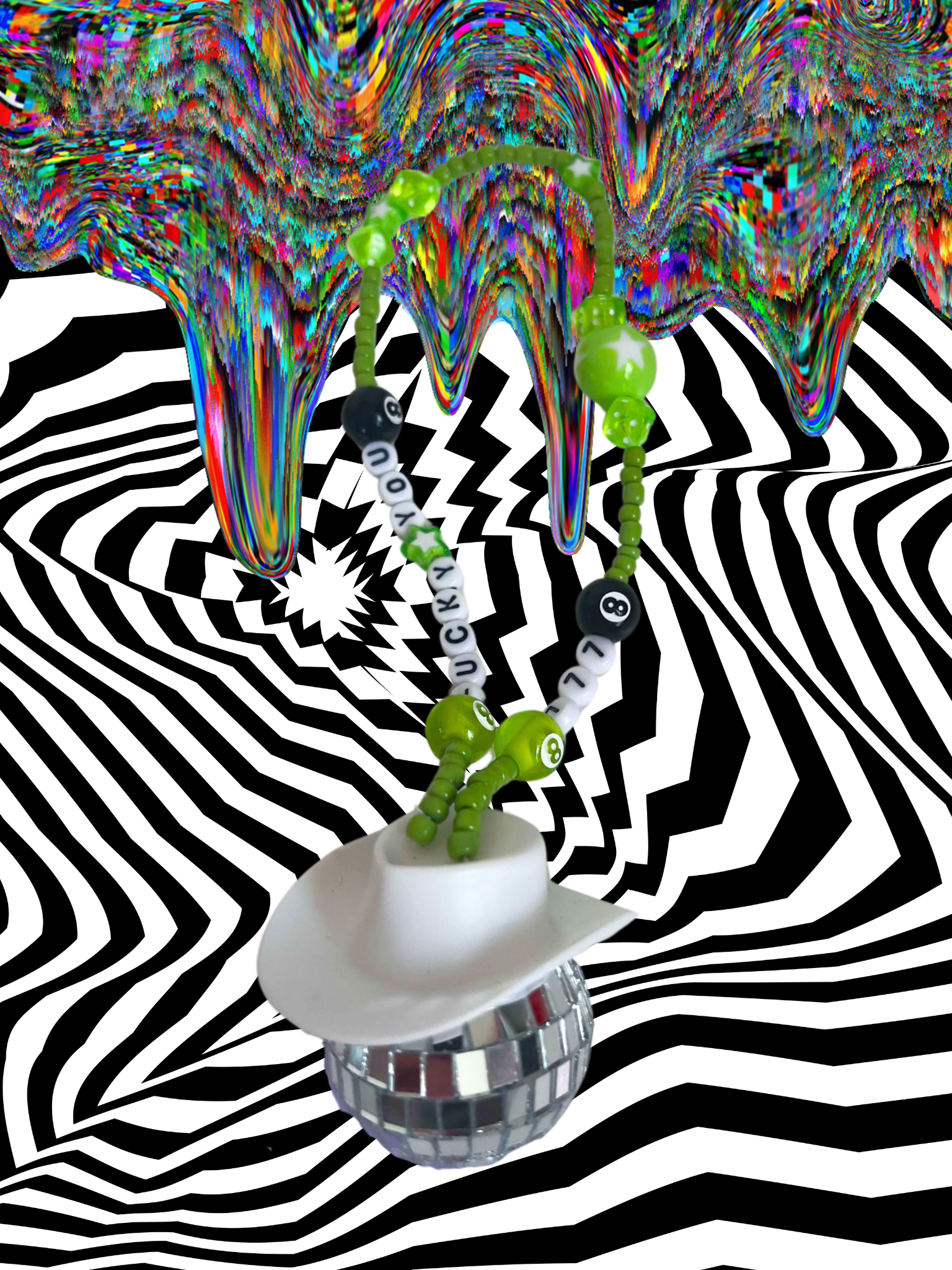 Lucky you rearview mirror charm, colored with green, white and black, and the added touch white cowgirl hat! Sparkle up your car with this whimsical, out of this world rearview mirror charm! This cute and trendy accessory is bound to add a fun touch to your car.