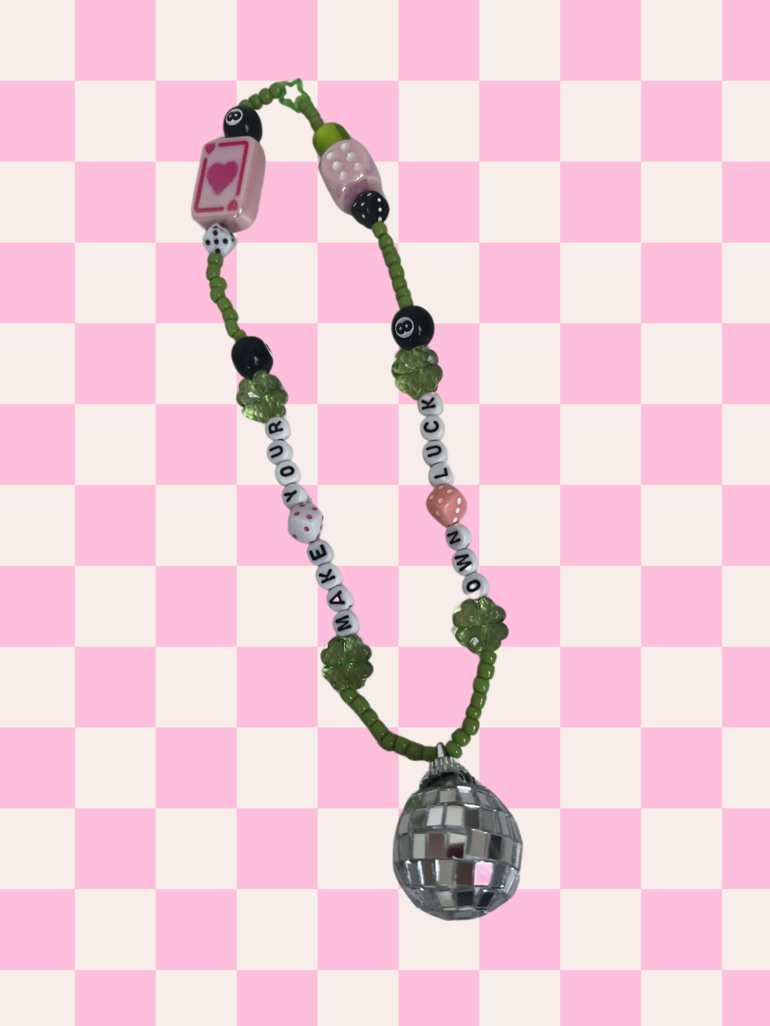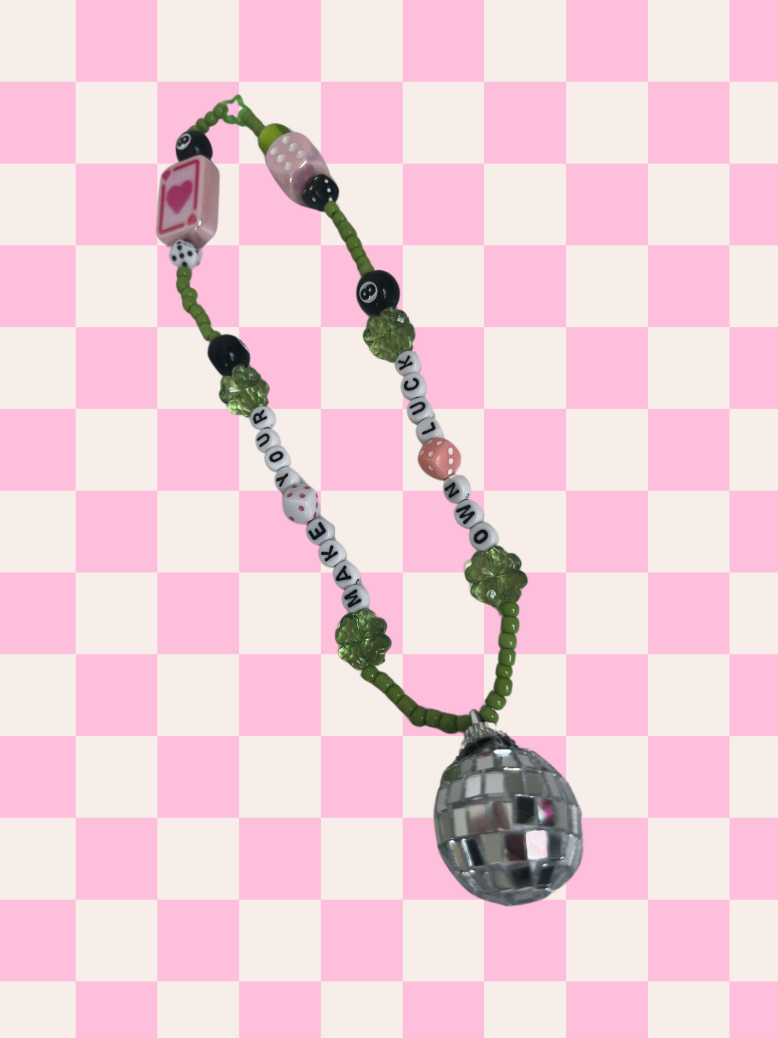 Make your own luck rearview mirror charm, colored with green, pink and black, and the added touch disco! Sparkle up your car with this whimsical, out of this world rearview mirror charm! This cute and trendy accessory is bound to add a fun touch to your car.