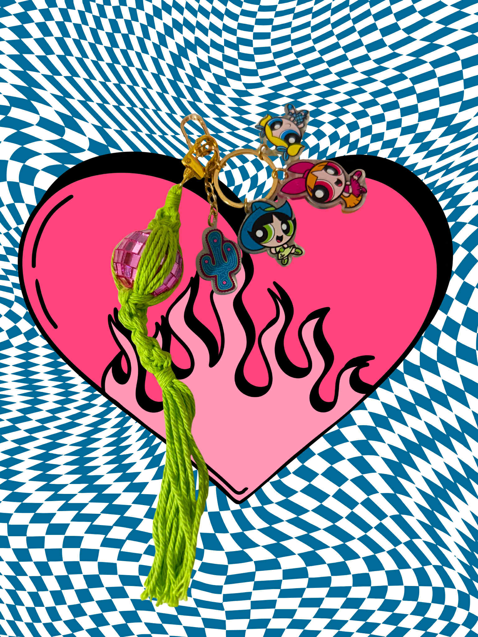 Powerpuff girls' cowgirls macrame keychain, braided with green colored macrame rope, a powerpuffs girls in cowgirl attire keychain, and the added pink disco ball! Sparkle up your keys, purse, backpack, gym bag, etc. with this whimsical, fun keychain! This cute and trendy accessory is bound to add a fun touch to your everyday accessories.