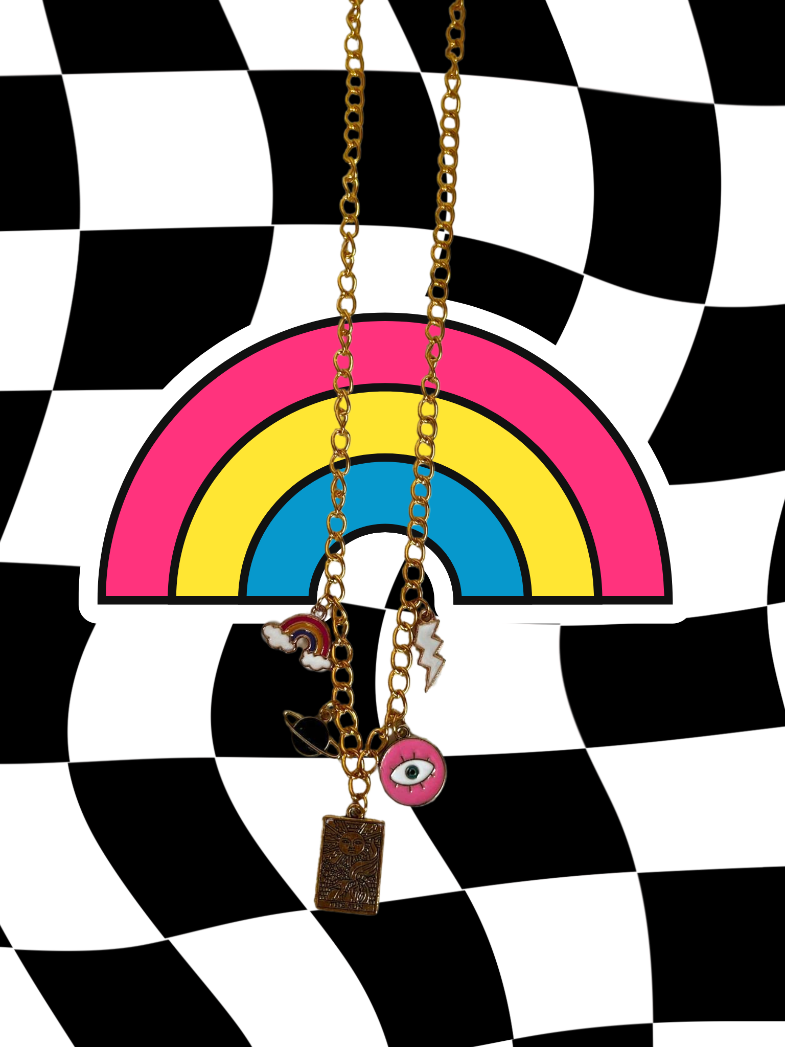 She is magic charm necklace, gold stainless steel O-chain, 16 inches in length, tail chain added for extra comfort fit, charms included in this statement necklace are a rainbow, Saturn, evil eye, lightning bolt and the sun tarot card charm. Show out your everyday accessories with this unapologetic statement piece. Sure to bring a cool, bold, and groovy vibe to your everyday clothing wear!Ā