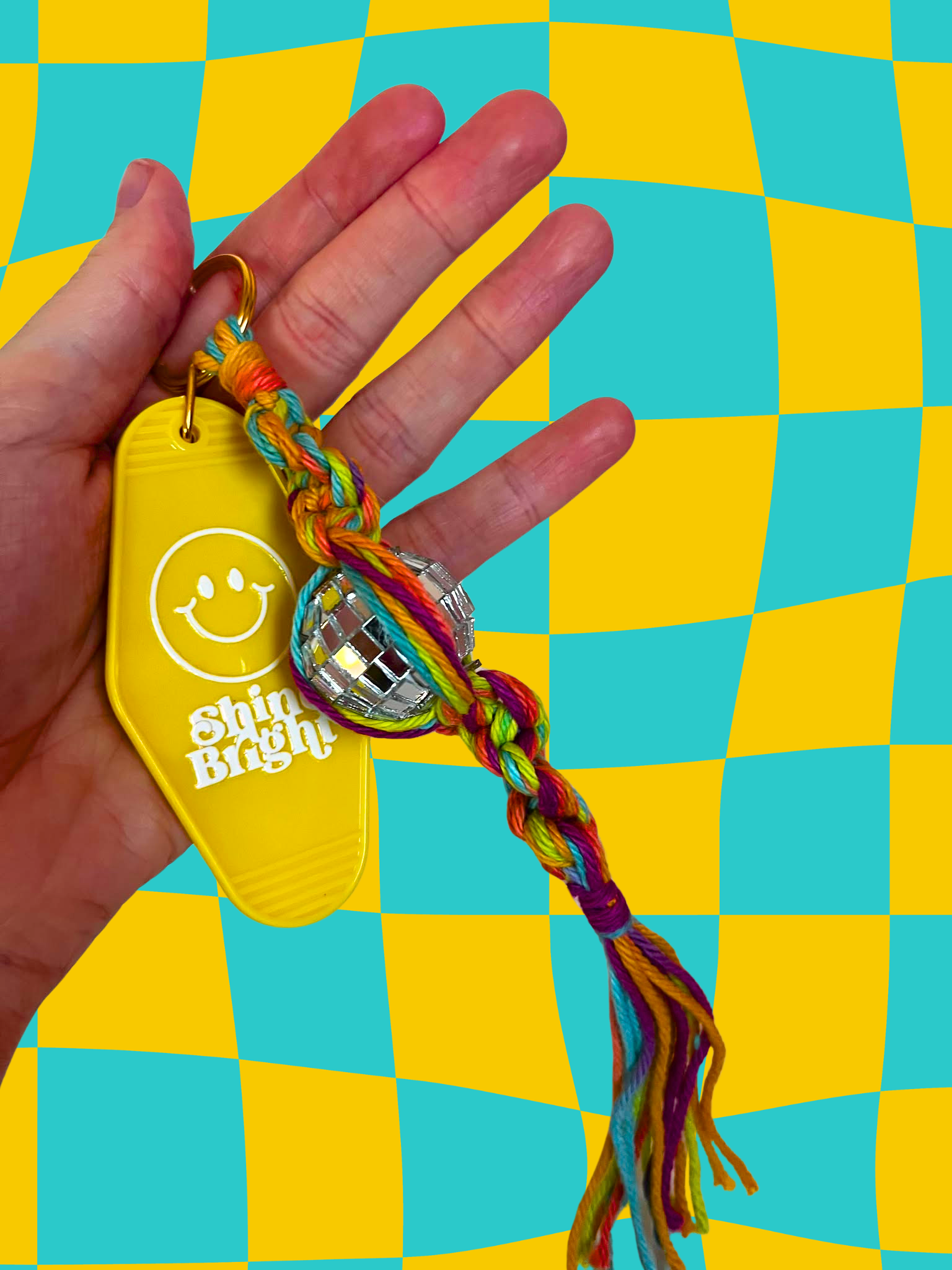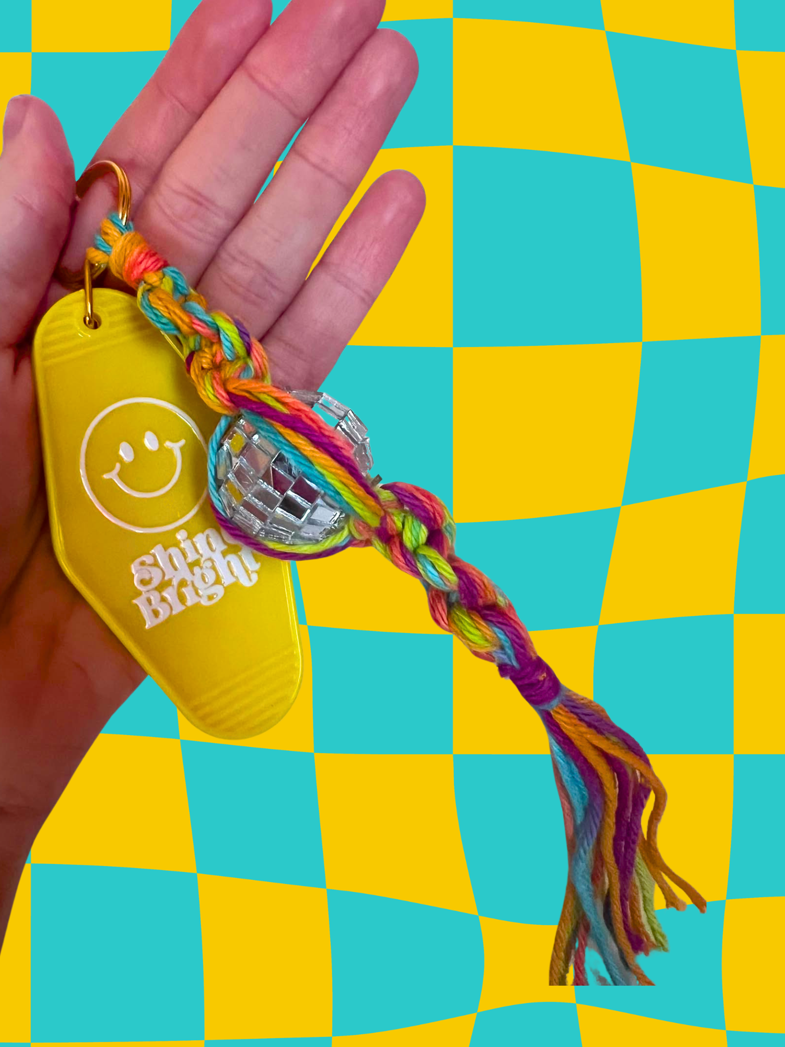 Shine bright macrame keychain, braided with blue, purple, green and orange colored rope, and the added touch disco ball! Sparkle up your keys, purse, backpack, gym bag, etc. with this whimsical, fun keychain! This cute and trendy accessory is bound to add a fun touch to your everyday accessories.