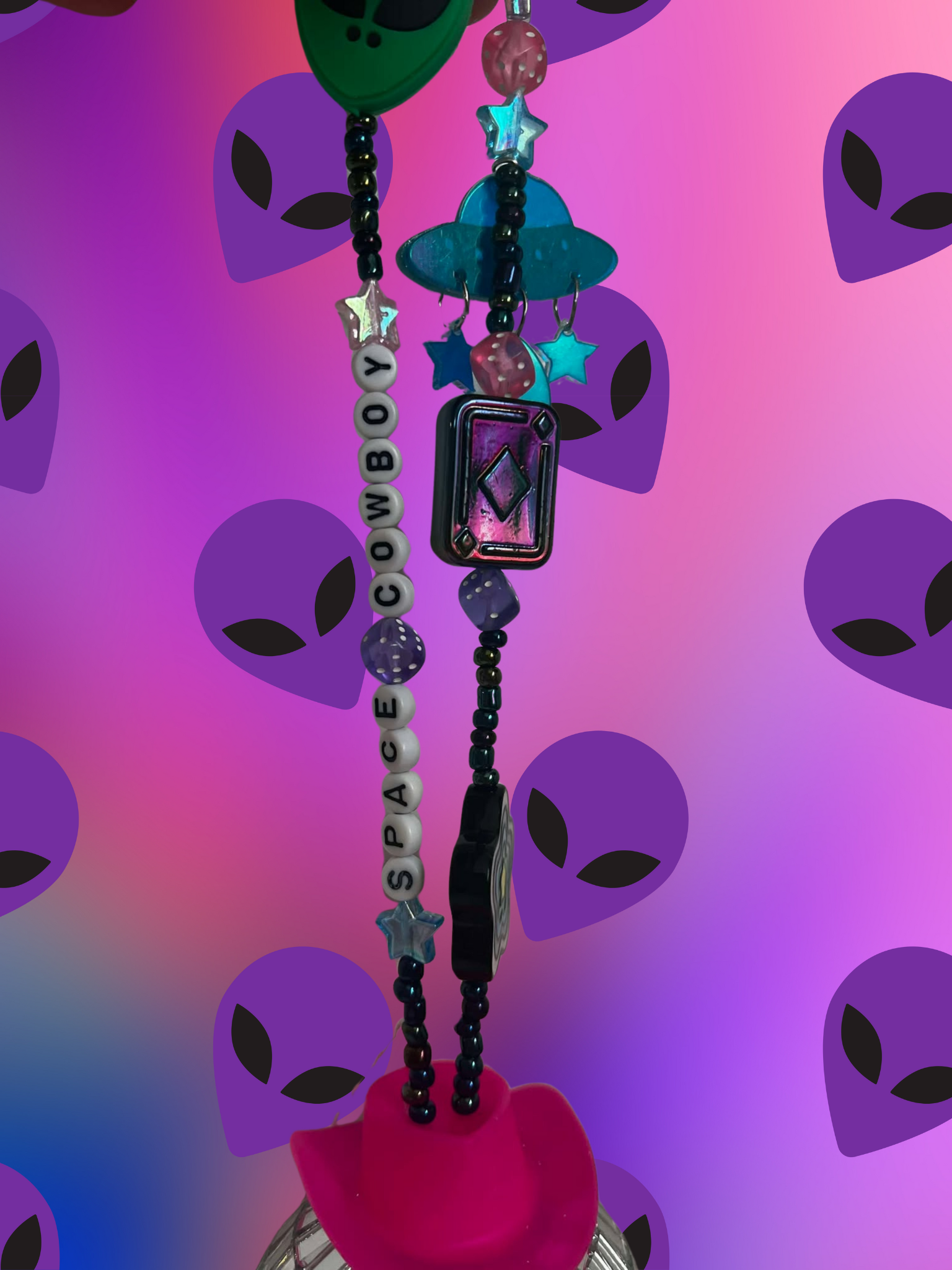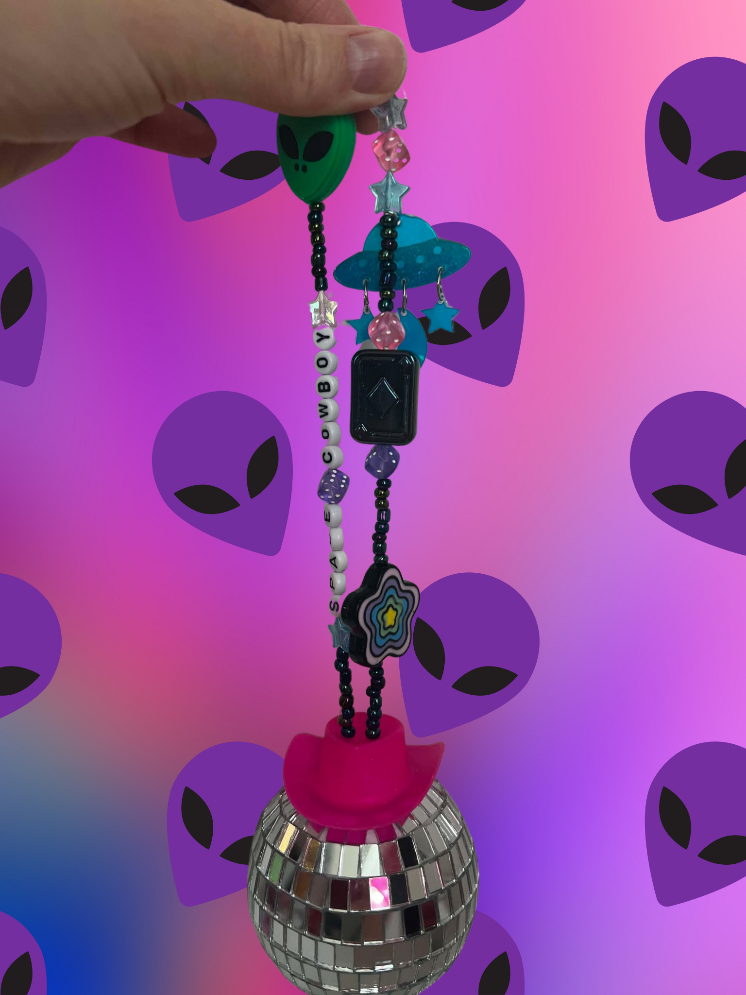 Space Cowboy rearview mirror charm, colored with purple, pink, green, blue, and the added touch pink cowgirl hat with a 'mega' disco ball! Sparkle up your car with this whimsical, out of this world rearview mirror charm! This cute and trendy accessory is bound to add a fun touch to your car.