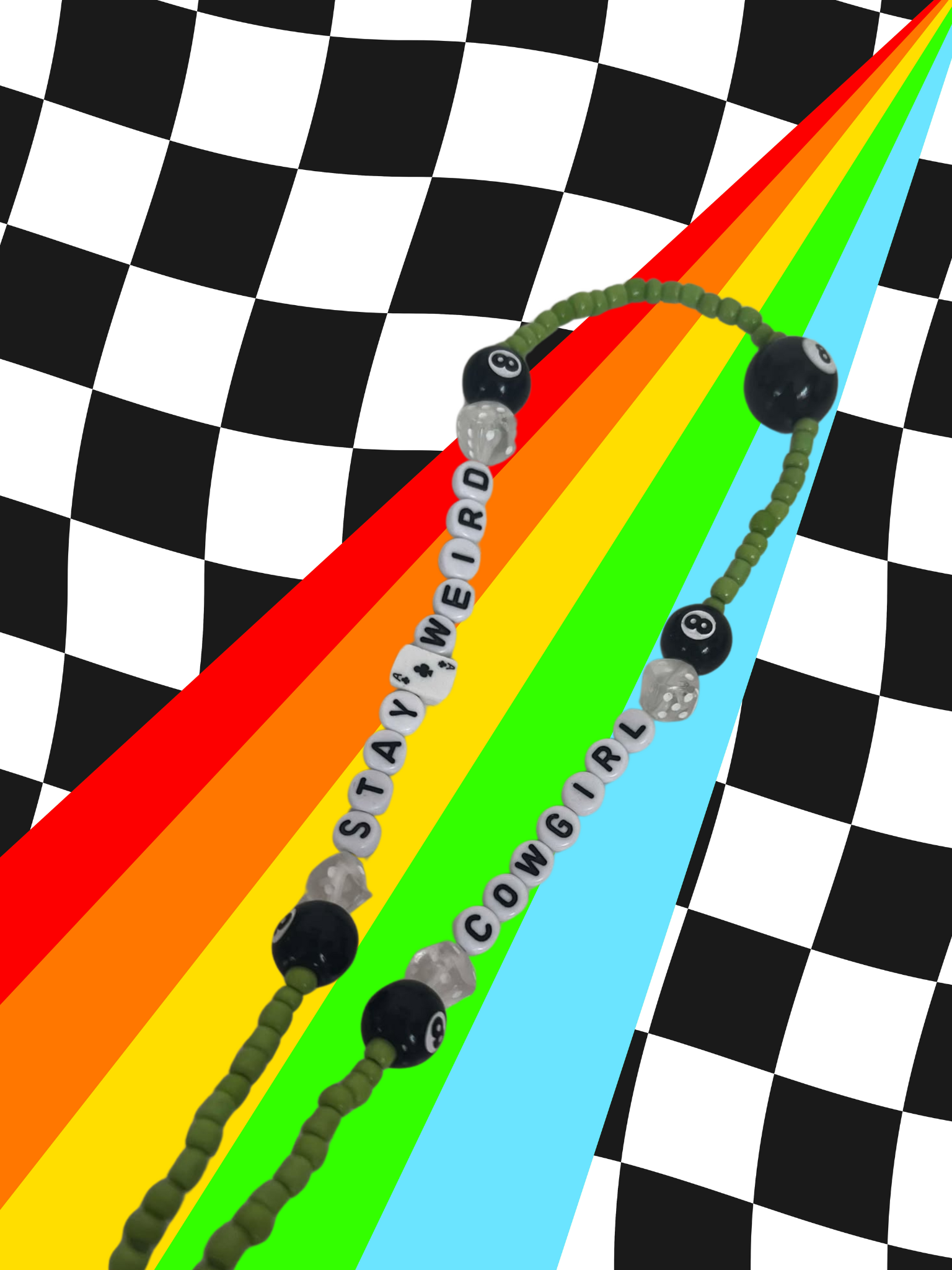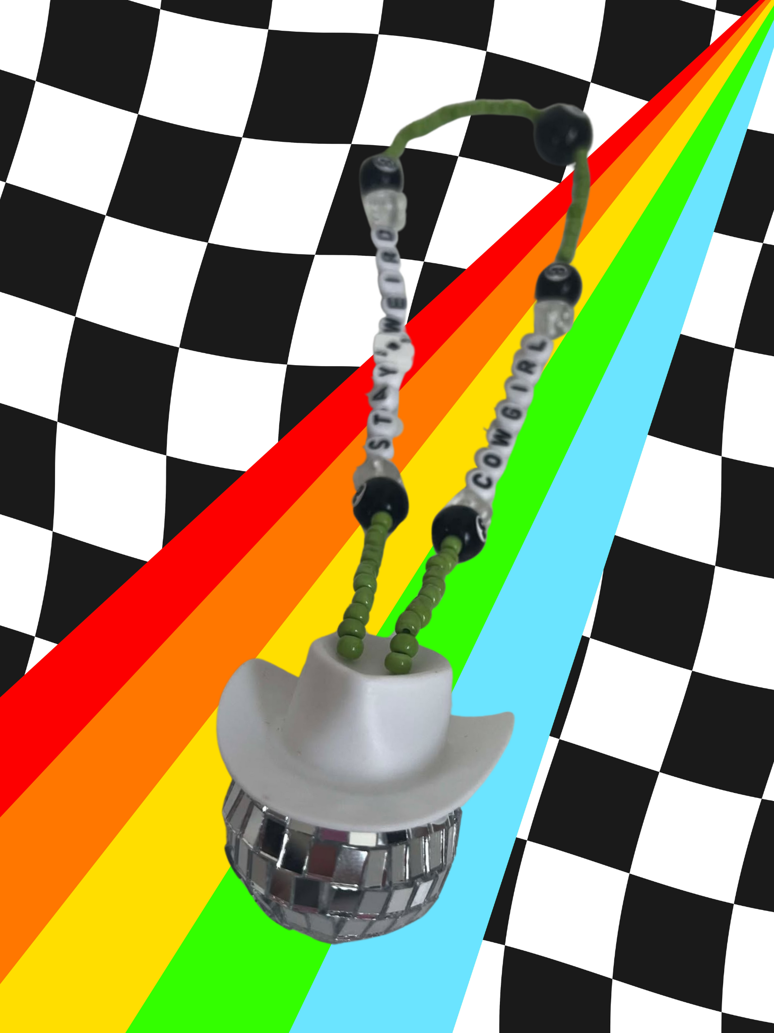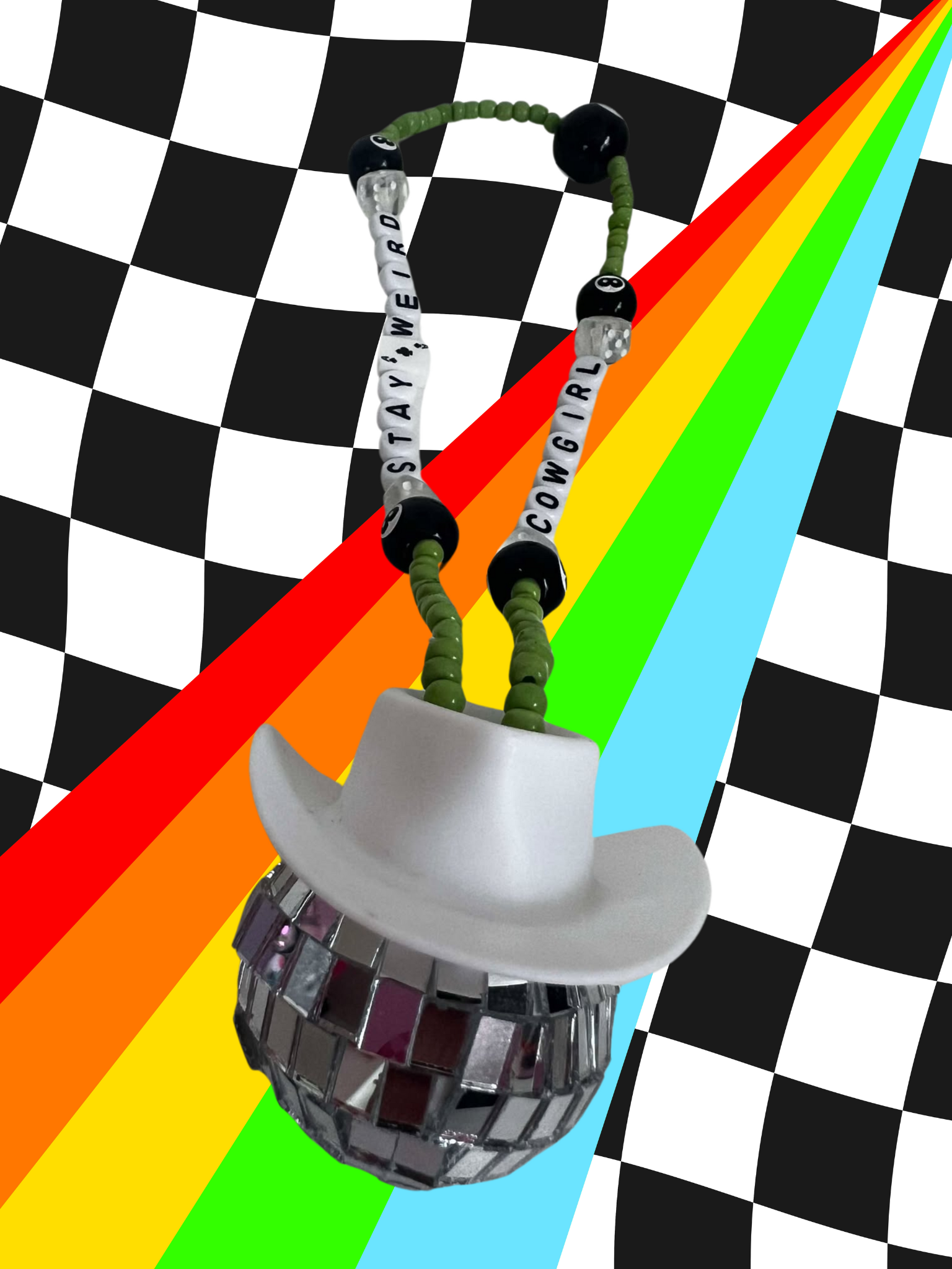 Stay weird cowgirl rearview mirror charm, colored with green, black and white, and the added touch white cowgirl hat! Sparkle up your car with this whimsical, out of this world rearview mirror charm! This cute and trendy accessory is bound to add a fun touch to your car.