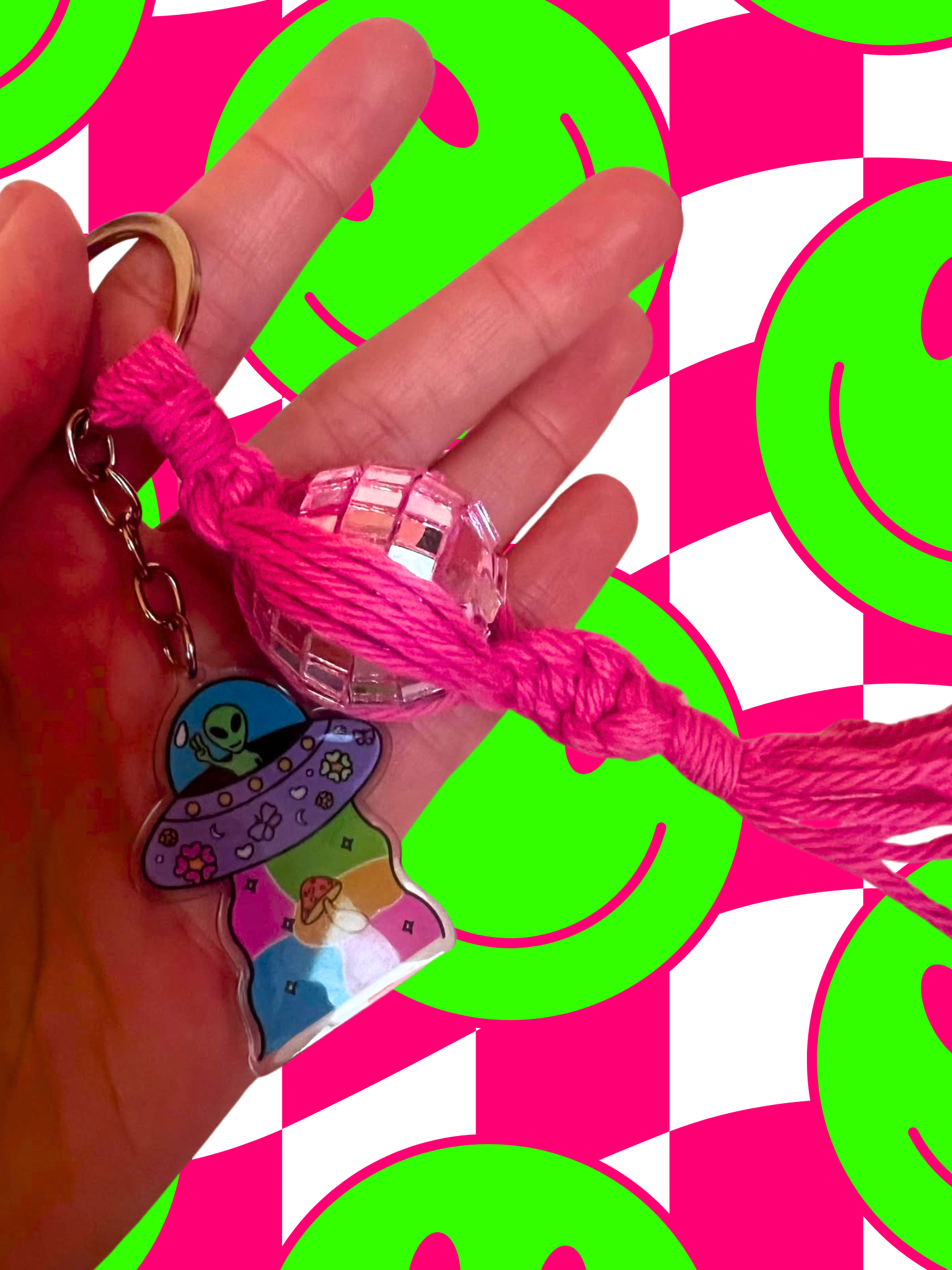 Stay weird macrame keychain, braided with pink colored rope, and the added touch pink disco ball! Sparkle up your keys, purse, backpack, gym bag, etc. with this whimsical, fun keychain! This cute and trendy accessory is bound to add a fun touch to your everyday accessories.