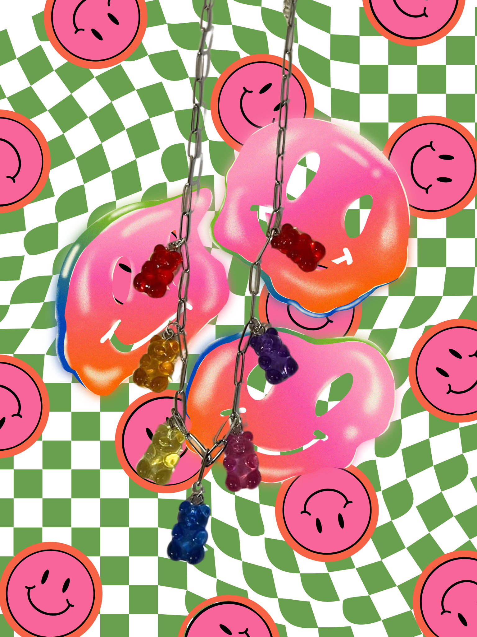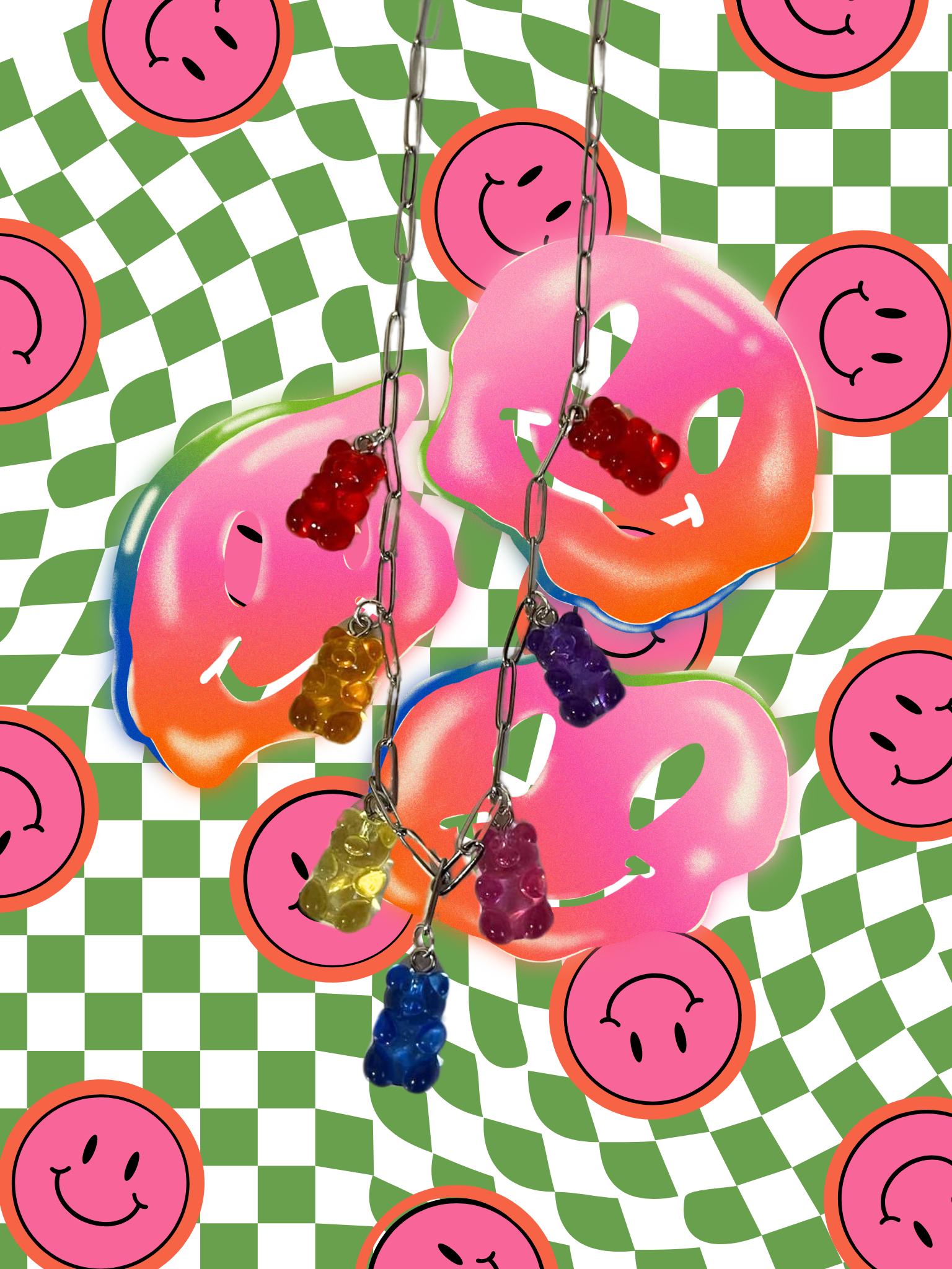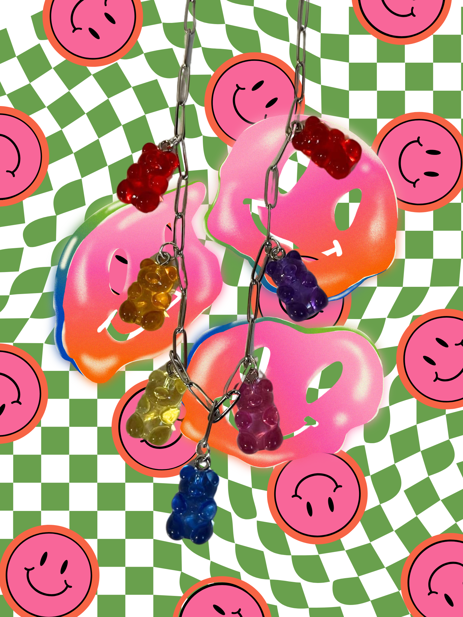 Sweet Dreamz charm necklace, silver stainless steel paperclip chain, 15 inches in length, tail chain added for extra comfort fit, charms included in this statement necklace are different colored gummy bears. Show out your everyday accessories with this unapologetic statement piece. Sure to bring a cool, bold, and groovy vibe to your everyday clothing wear!Ā